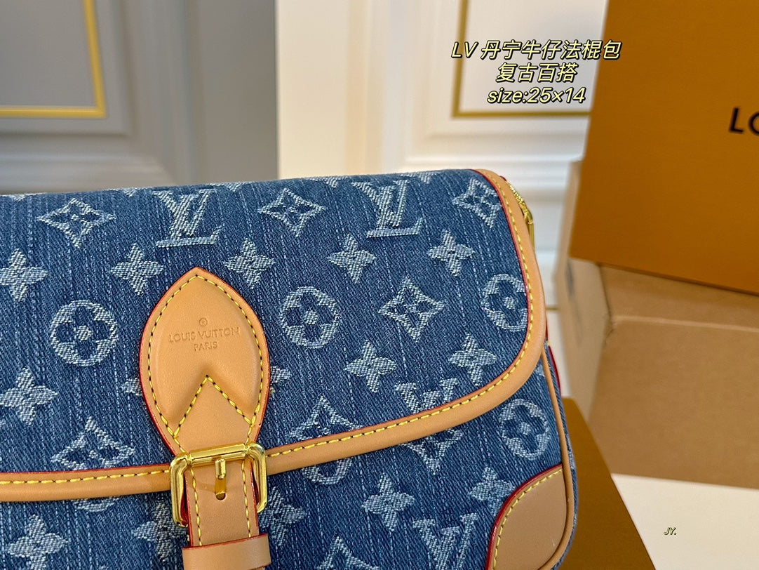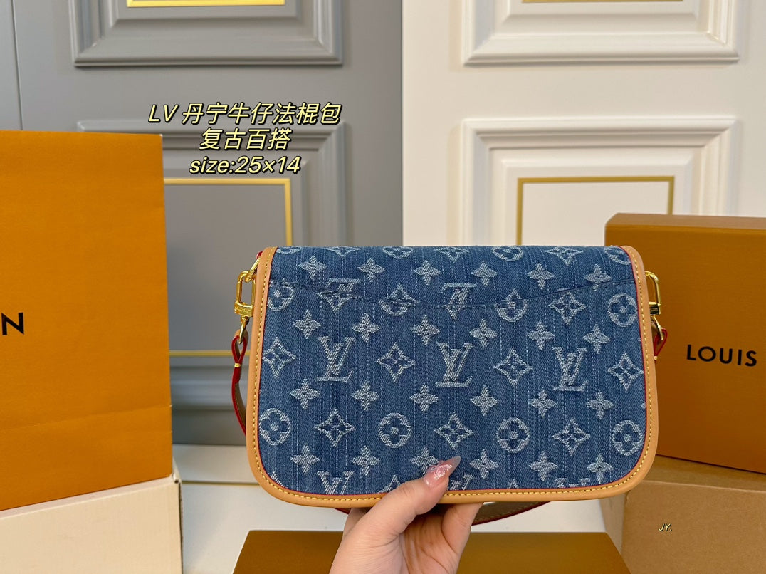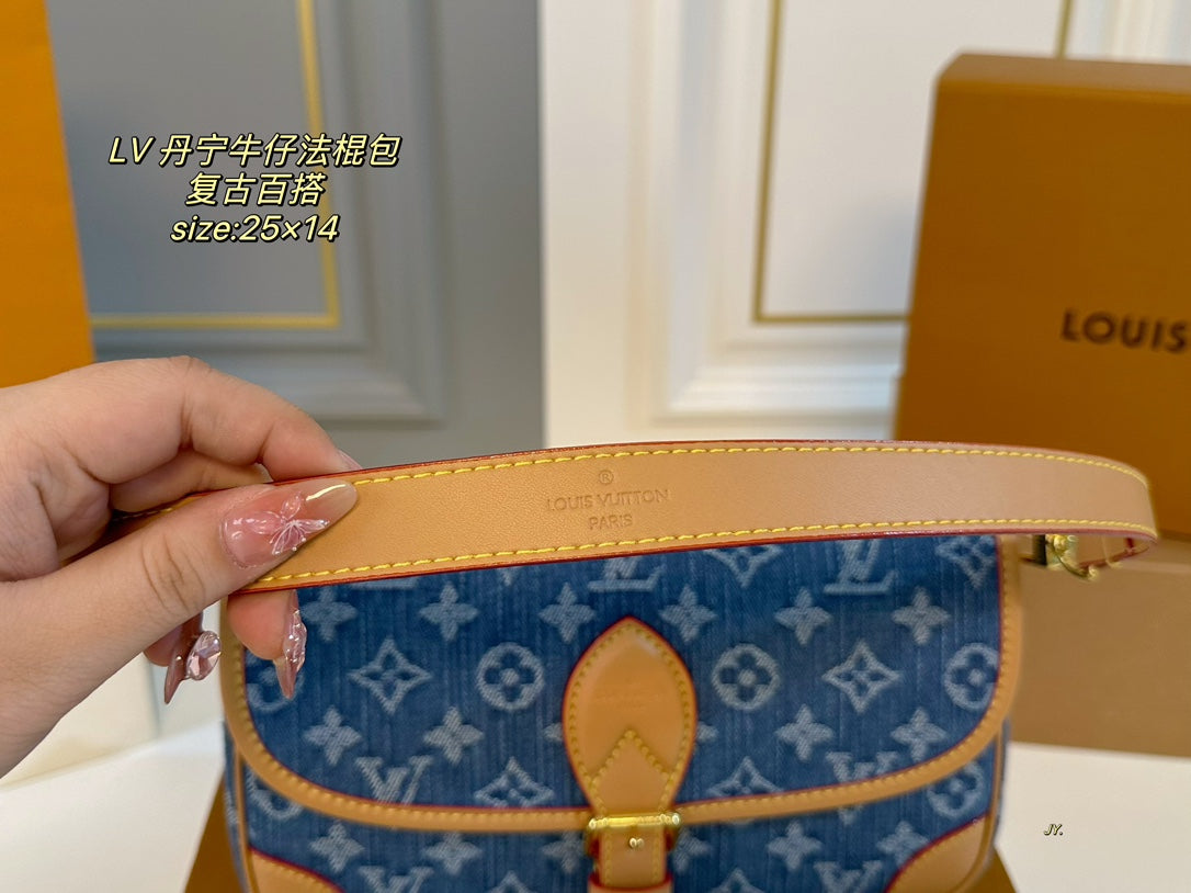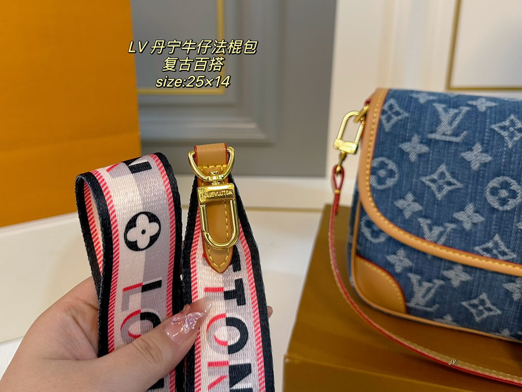 Discover the Louis Vuitton Denim Diane Retro Baguette Bag, a stylish accessory that combines vintage charm with modern functionality. Measuring 25×14 cm, this bag features two versatile shoulder straps, allowing you to wear it as a crossbody or over the shoulder for added convenience.