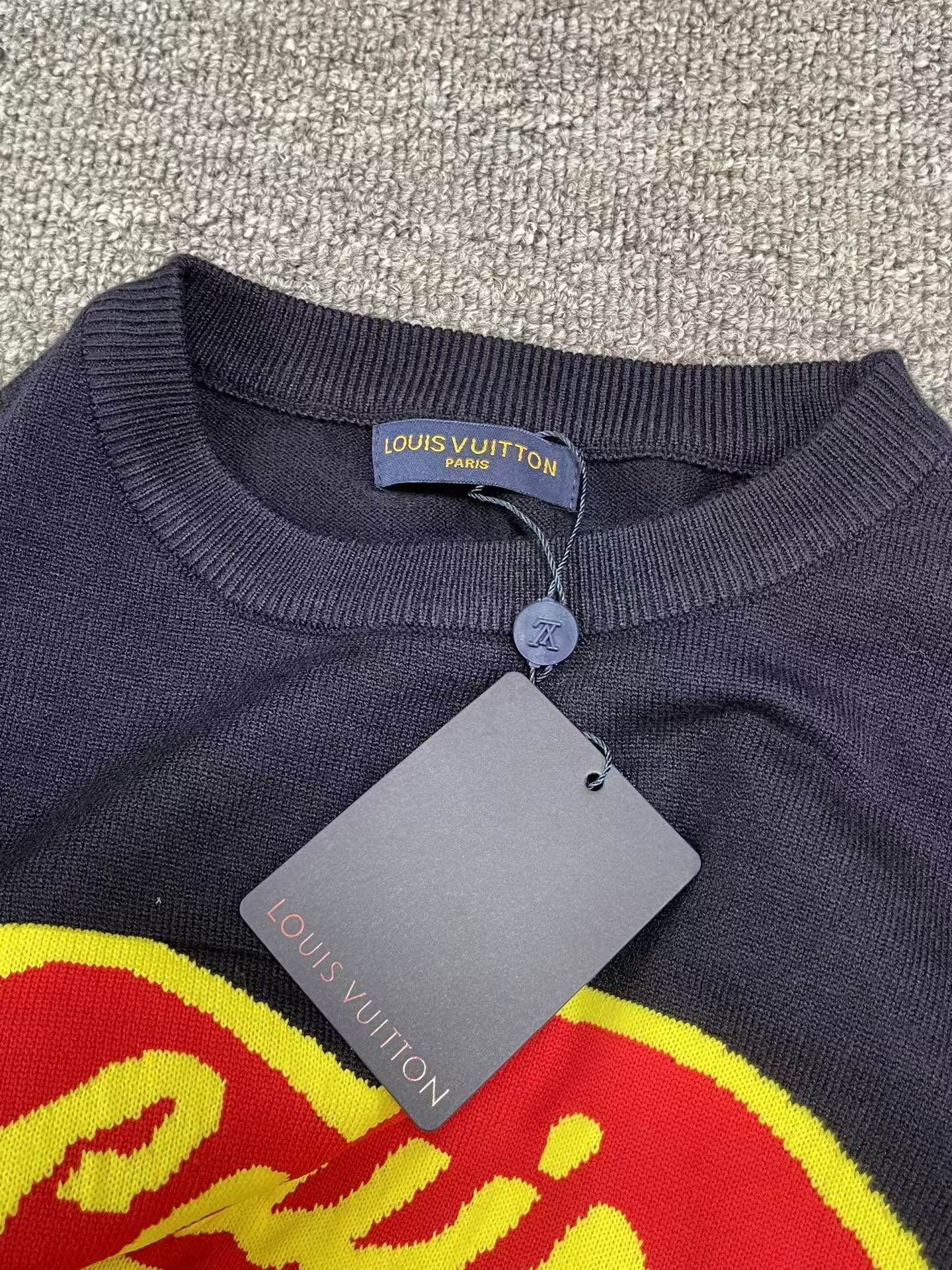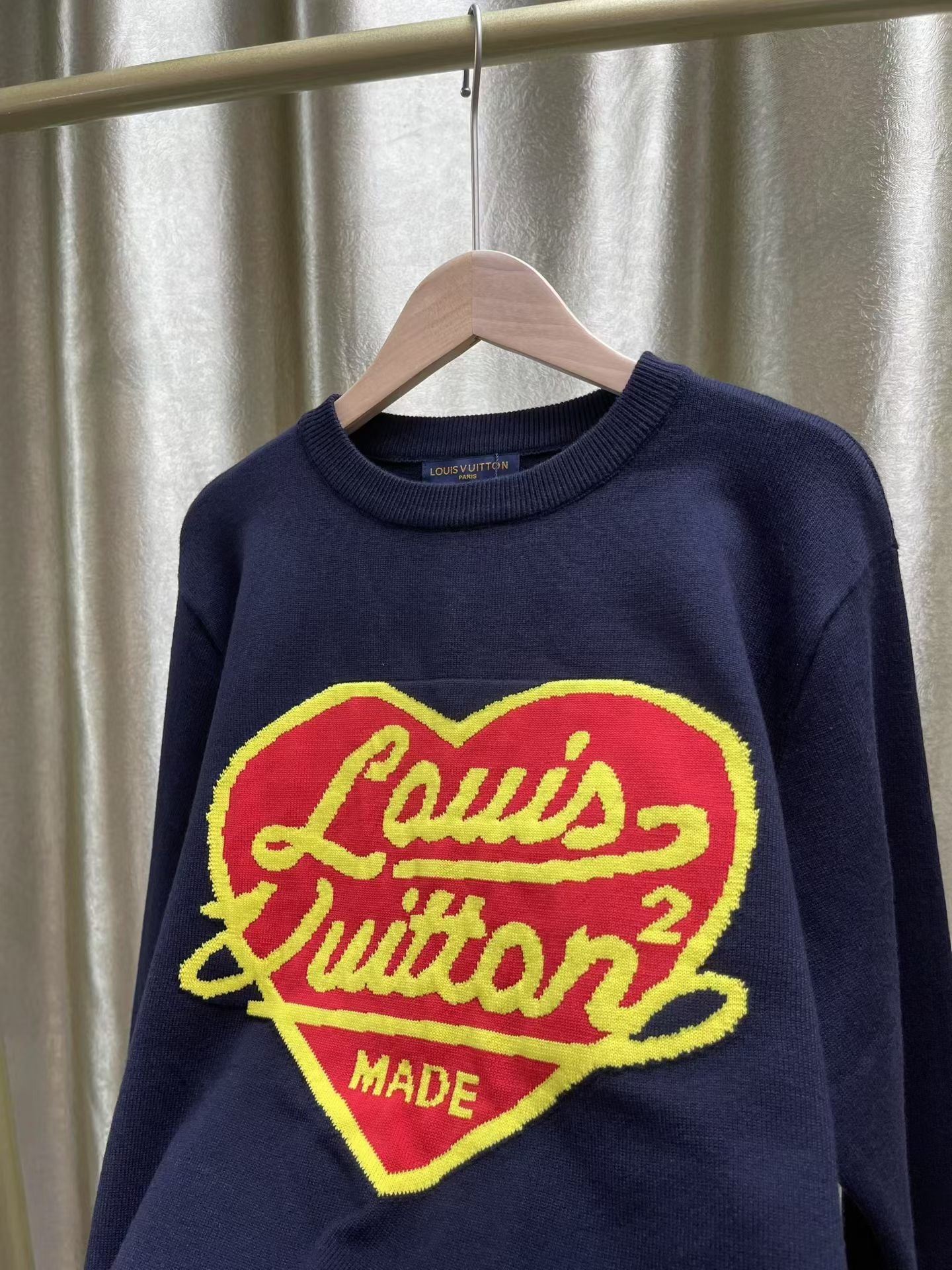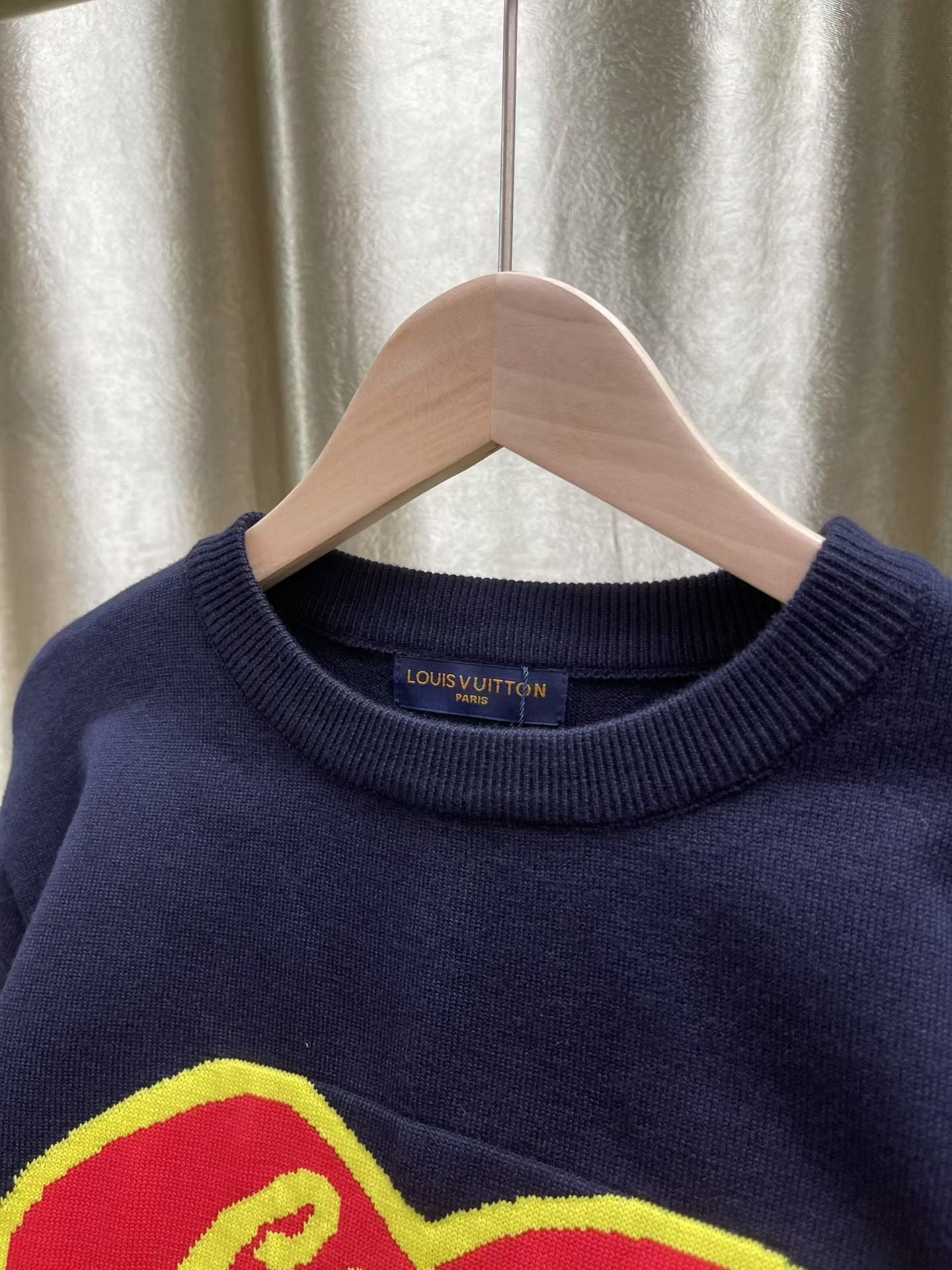 Introducing the LOUIS VUITTON Love Jacquard Knitted Sweater, a premium autumn piece crafted from a luxurious blend of high-density wool and cotton yarn. This high-gram weight fabric offers exceptional softness and a silky touch, ensuring a comfortable and skin-friendly experience. Employing a unique four-space knitting method, this sweater boasts durability while resisting deformation and pilling.
