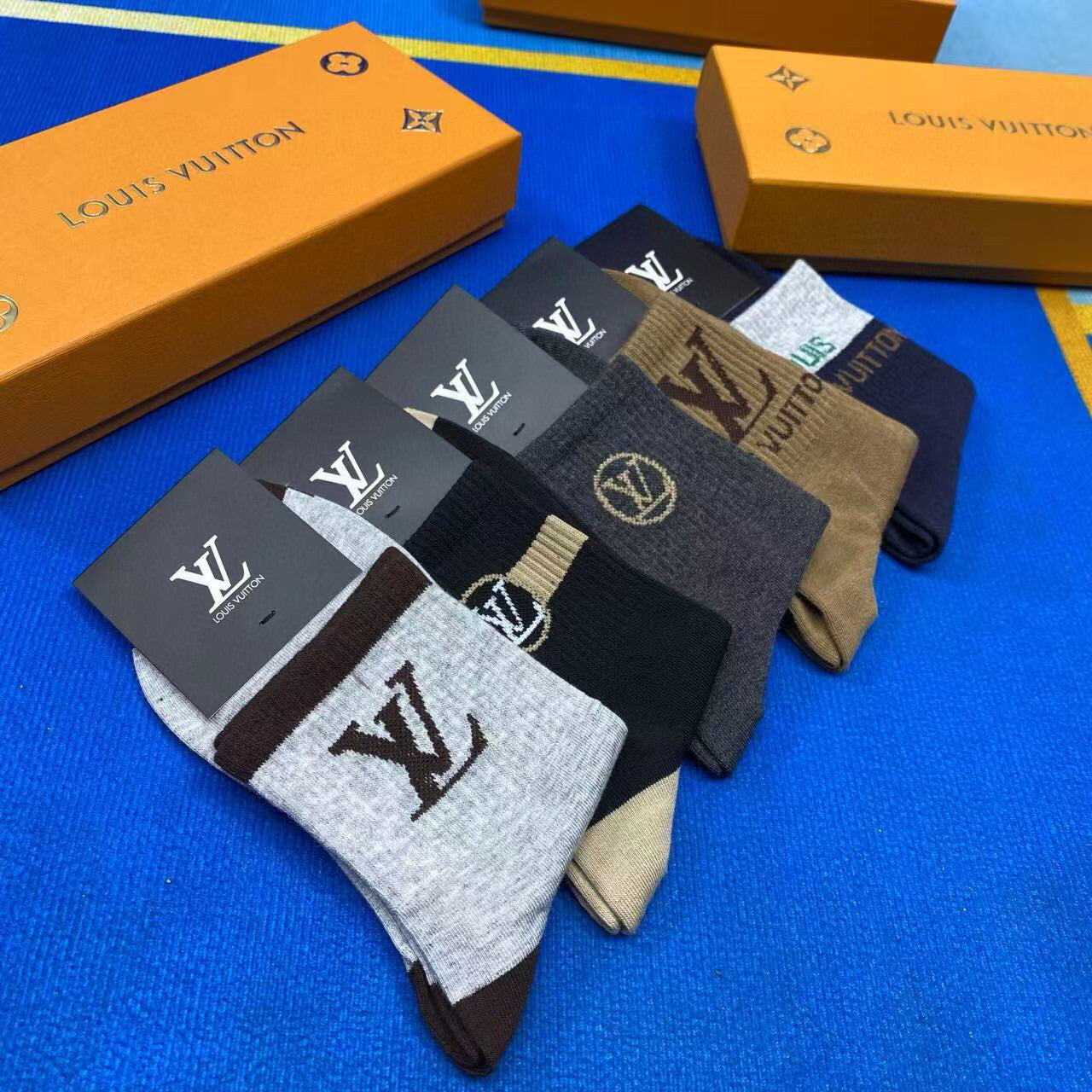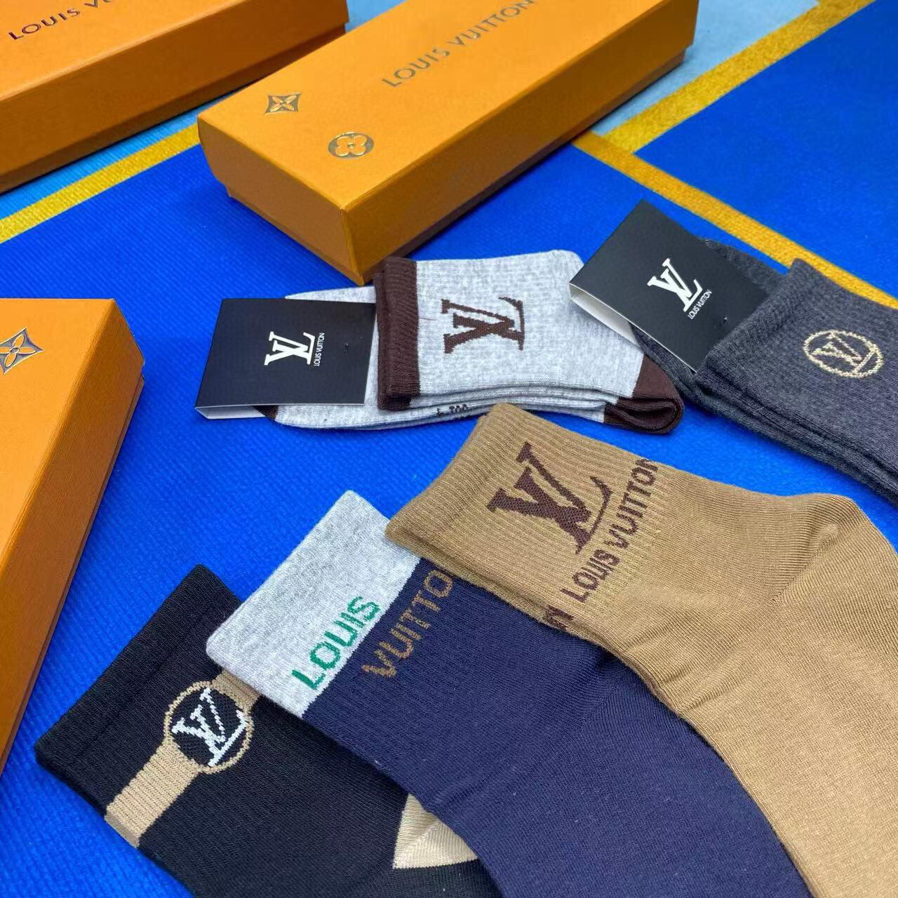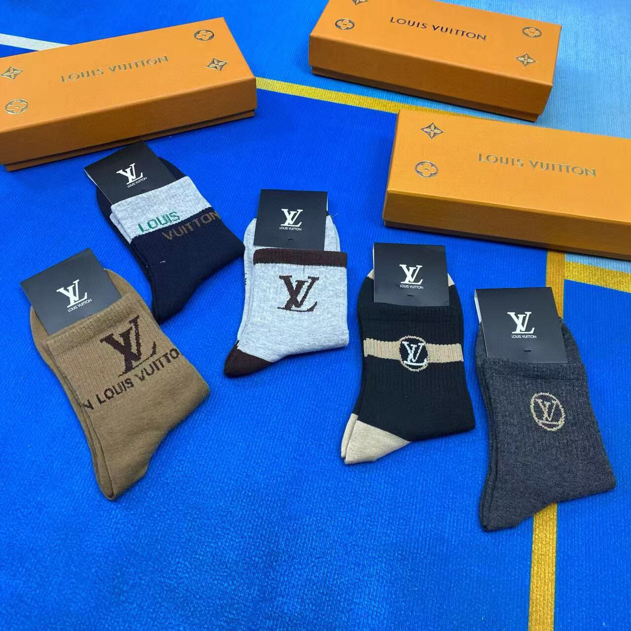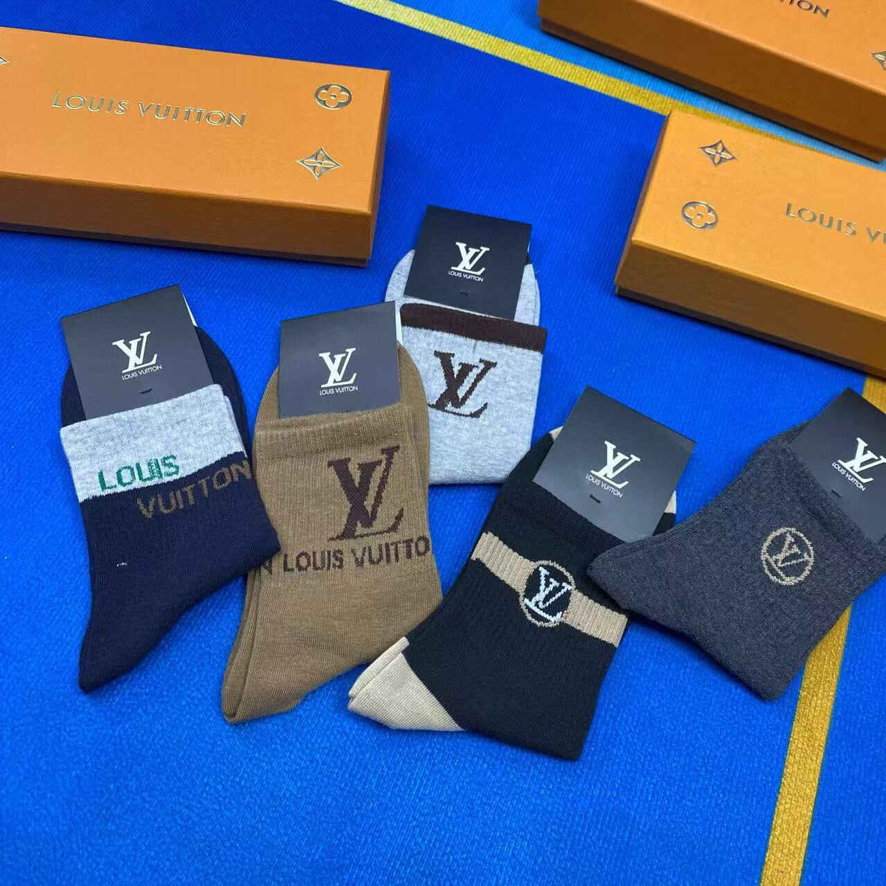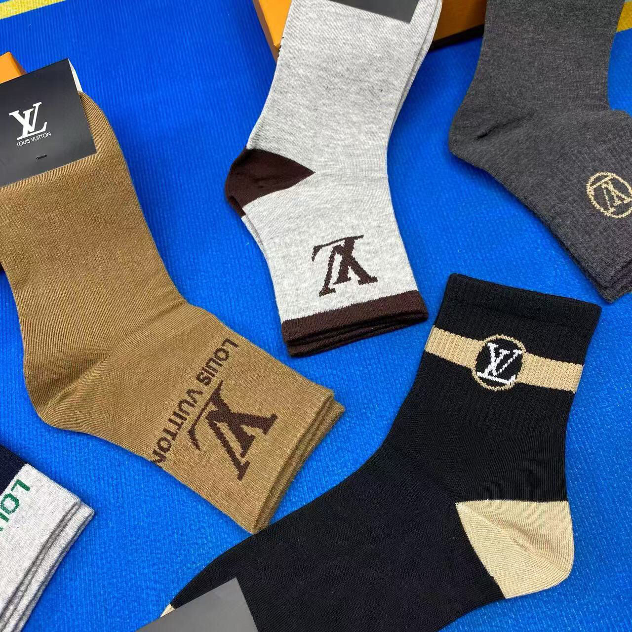 Elevate your wardrobe with the new Louis Vuitton men's socks, presented in a stylish gift box of five pairs. Crafted from premium pure cotton, these socks offer unparalleled breathability and comfort, making them perfect for everyday wear. Featuring the iconic Louis Vuitton logo, these fashionable essentials are incredibly versatile and easy to pair with any outfit. A must-have accessory for the modern fashionista, these socks combine luxury and practicality effortlessly. Perfect for gifting or treating yourself!