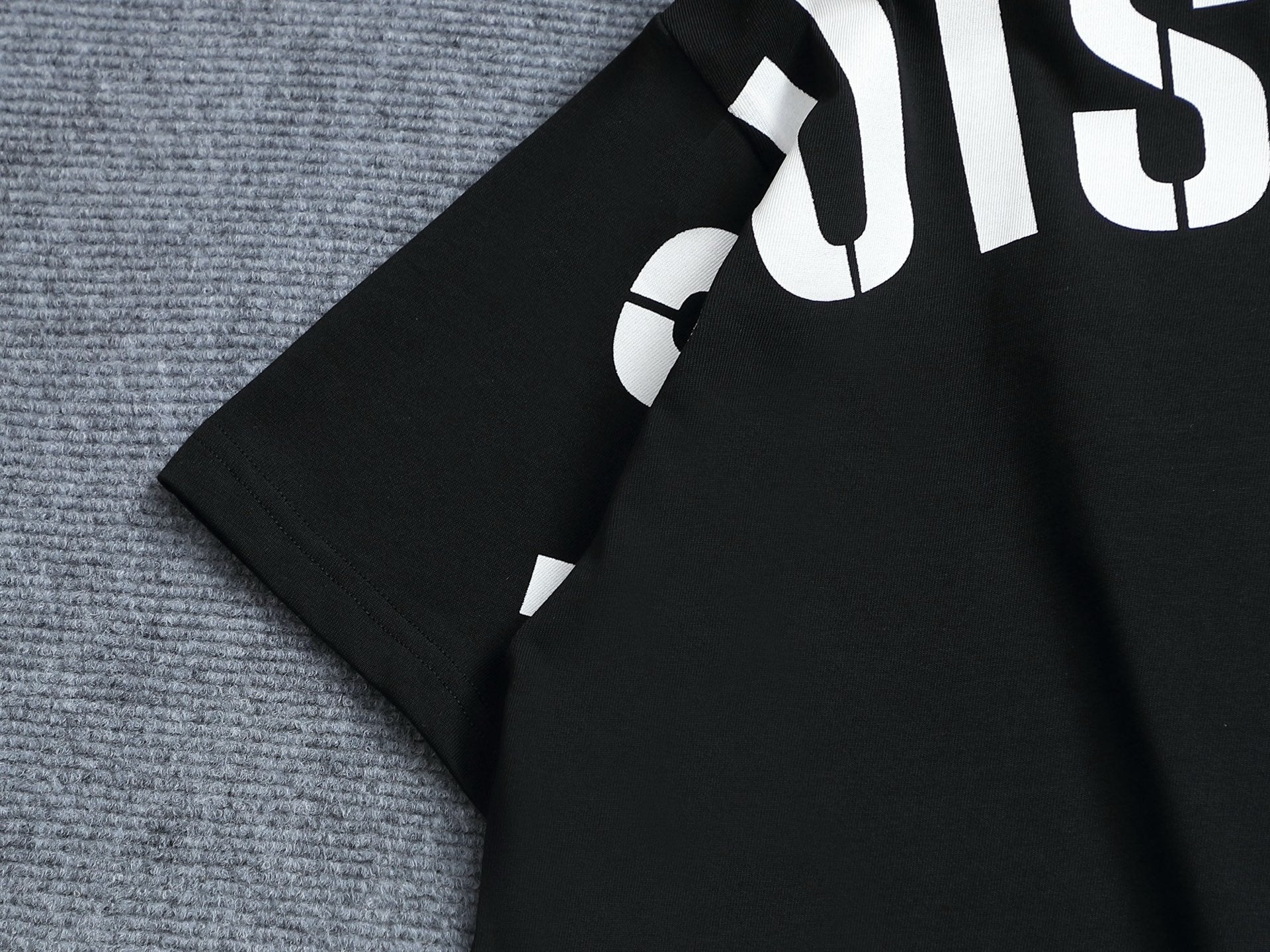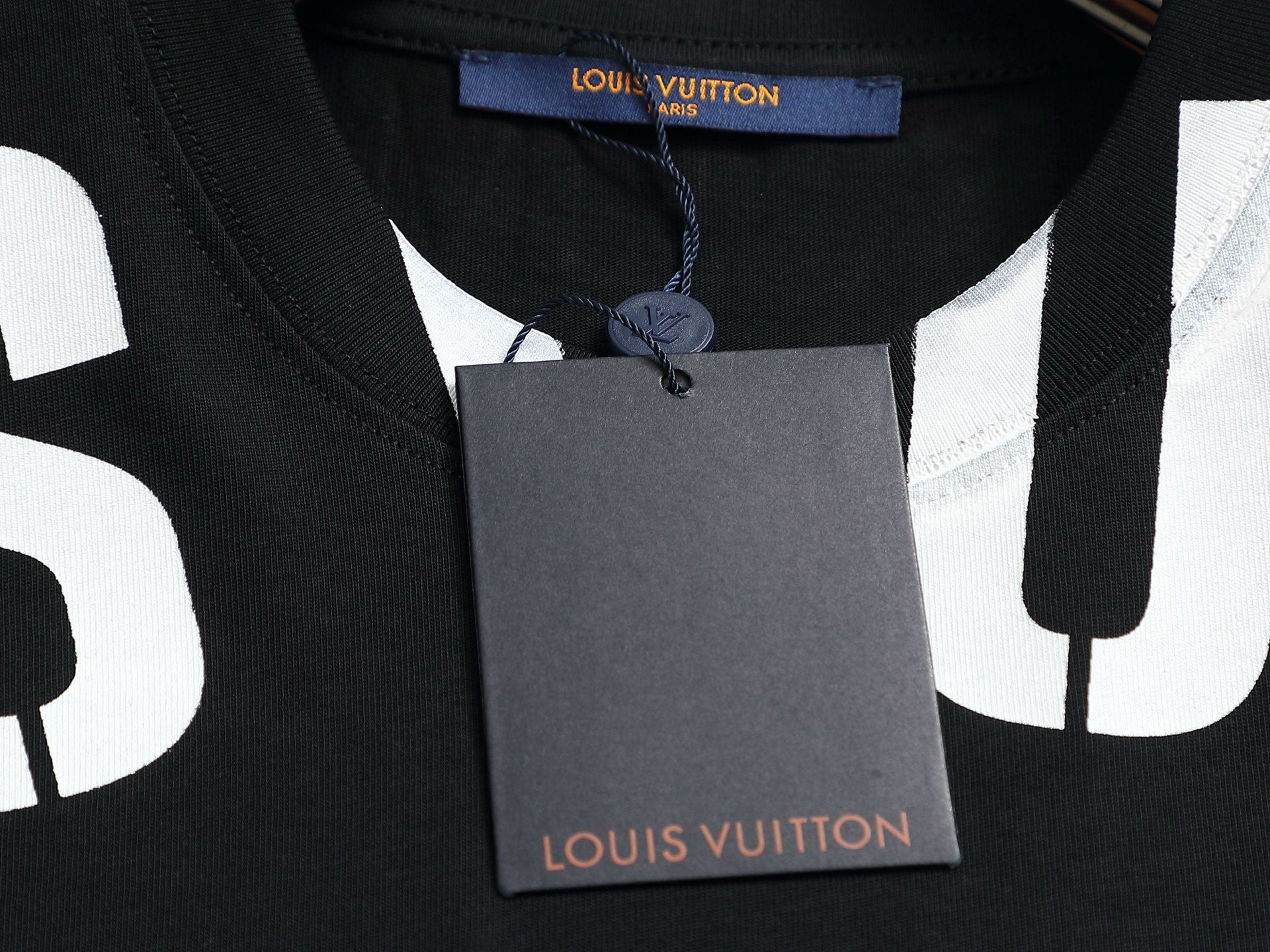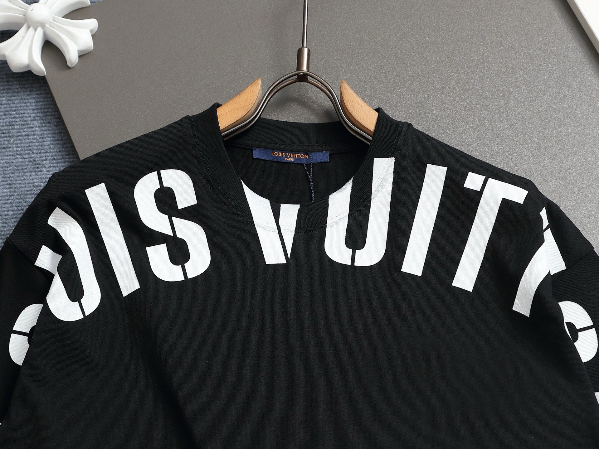 Elevate your wardrobe with the Louis Vuitton Round Neck T-Shirt. Crafted from premium 260g fabric, this stylish short-sleeved tee features a unique spliced design showcasing a bold printed logo on both the front and back.