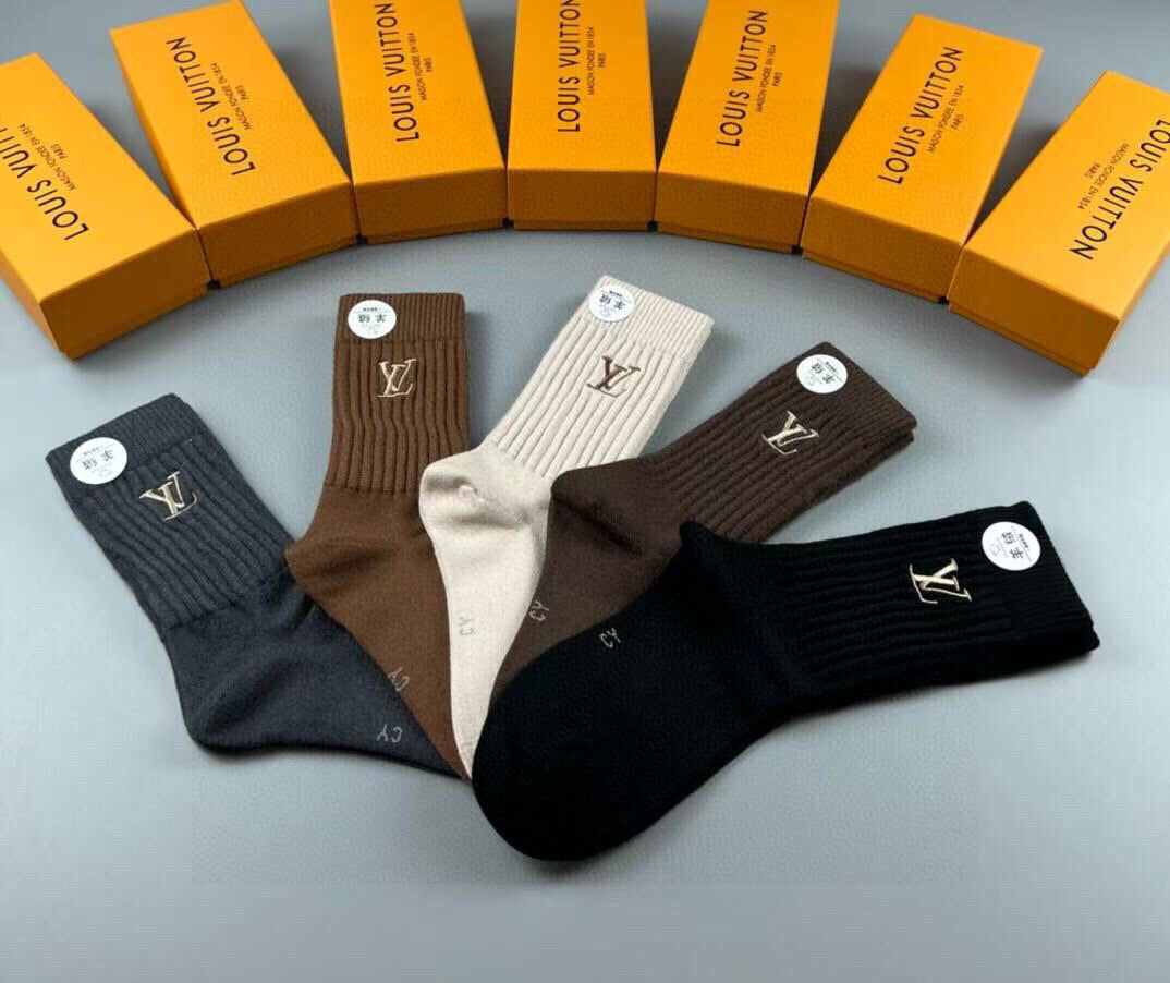 Each set includes five pairs, all featuring the iconic embroidered LV logo for a stylish touch. These socks are not only practical but also a fashion statement, adored by trendsetters and influencers alike. Effortlessly complement any outfit and enjoy the benefits of skin-friendly materials that offer both skin care and thermal retention.