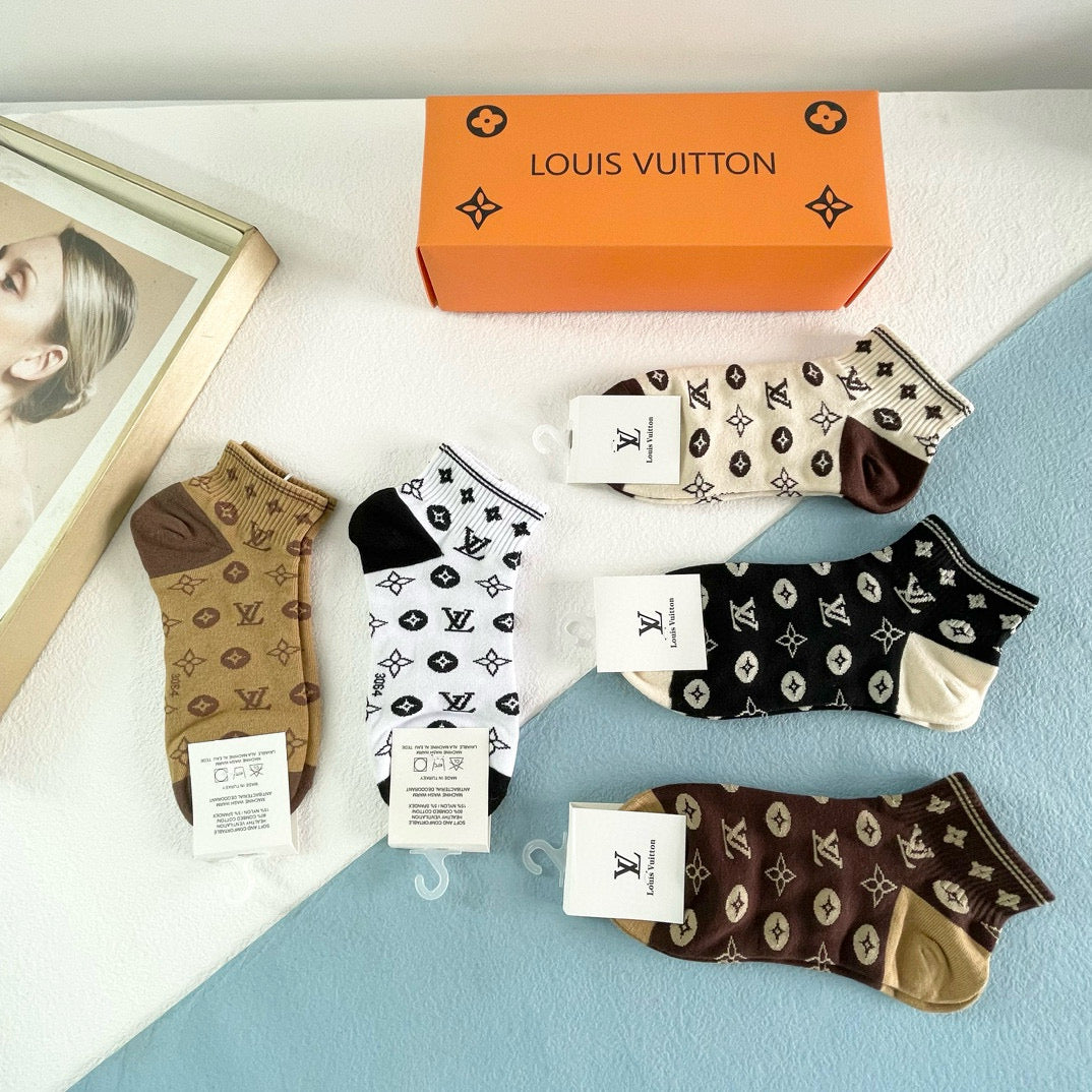 Elevate your sock collection with our Louis Vuitton Women's Designer Short Socks, packaged beautifully in a box of five pairs. These highly sought-after socks combine luxury with style, making them a must-have accessory for fashion enthusiasts. The perfect blend of comfort and trend, these short socks are ideal for pairing with any outfit. Recommended for their chic design and quality, they are an essential addition to any wardrobe. Step out in confidence and showcase your impeccable taste with these fashionable socks.