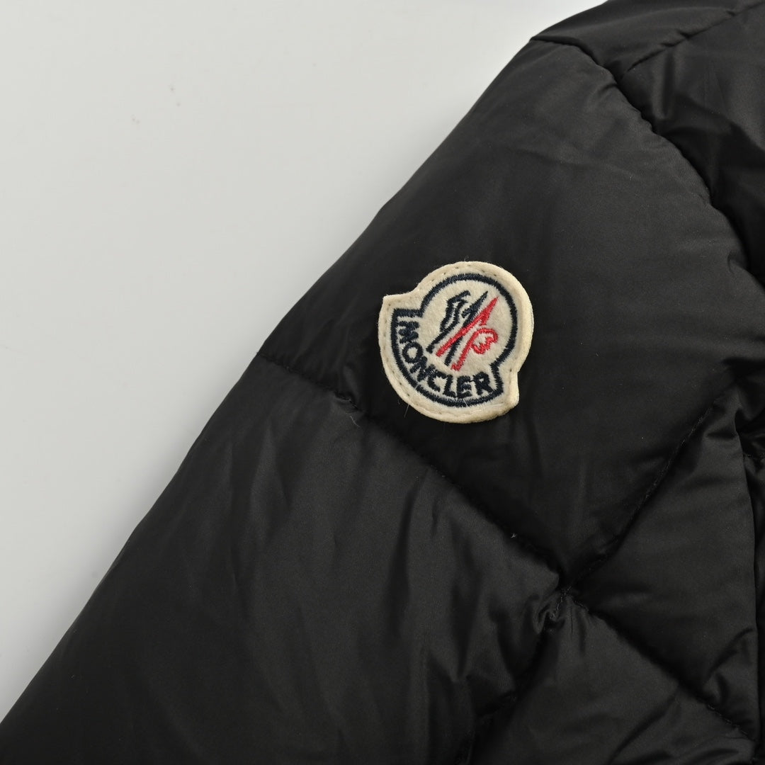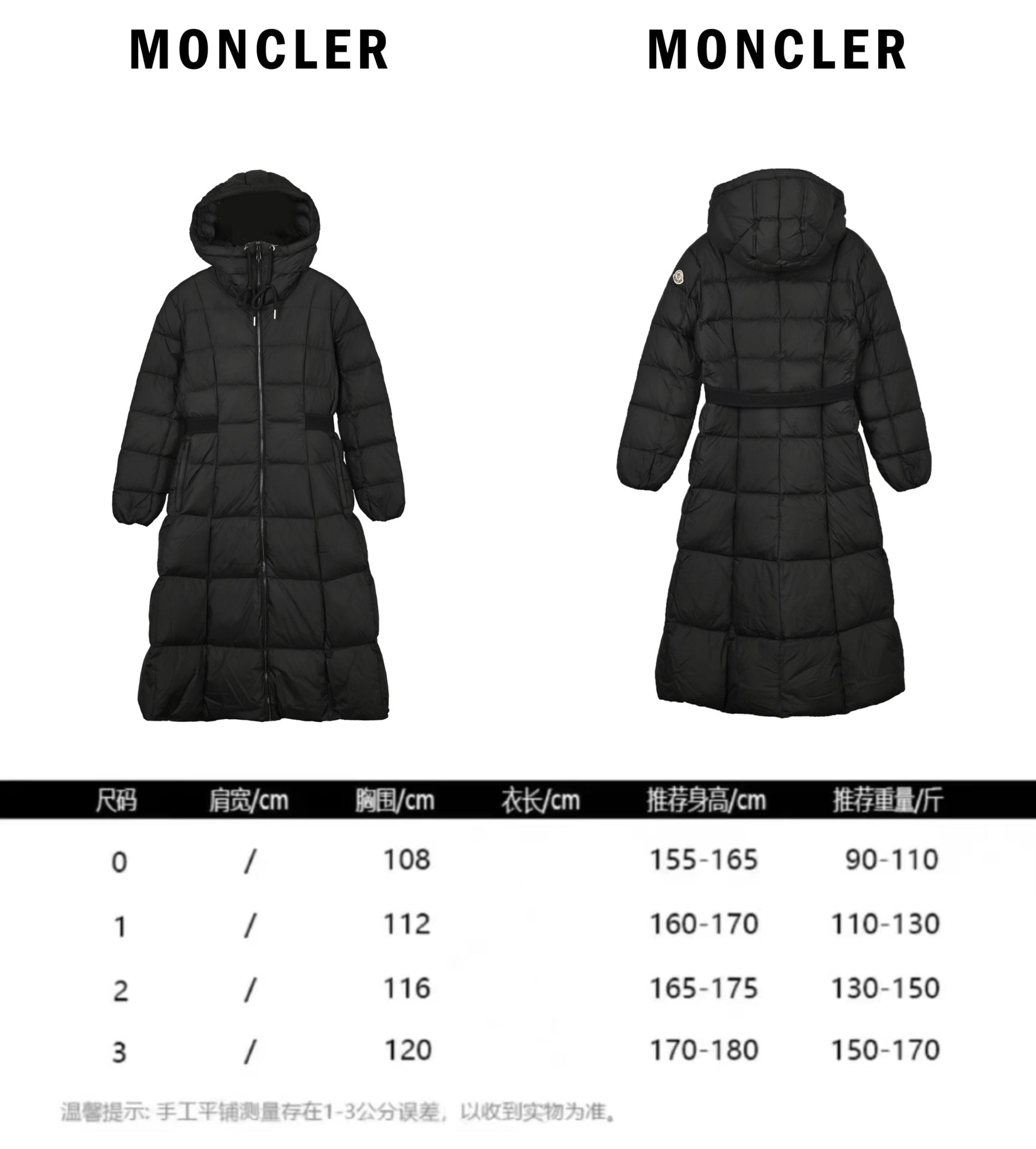 Available in classic black and white, the Moncler down jacket comes in sizes 0, 1, 2, and 3, with precise measurements: