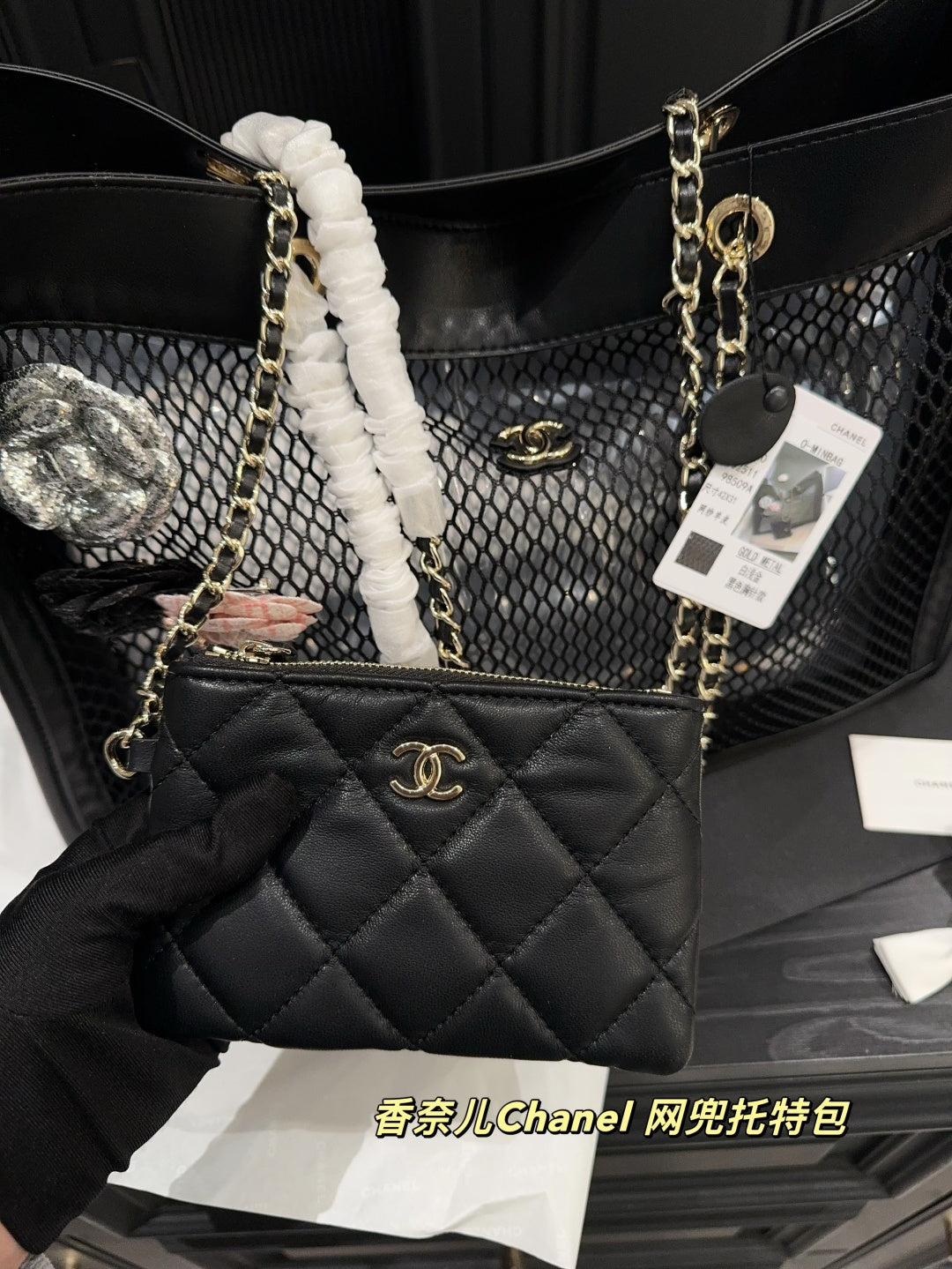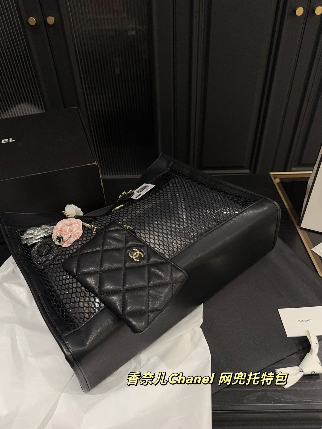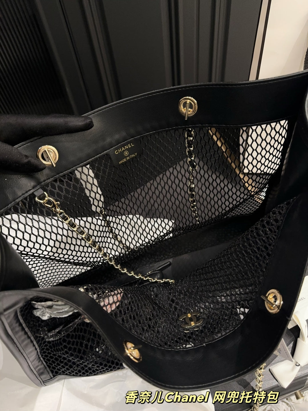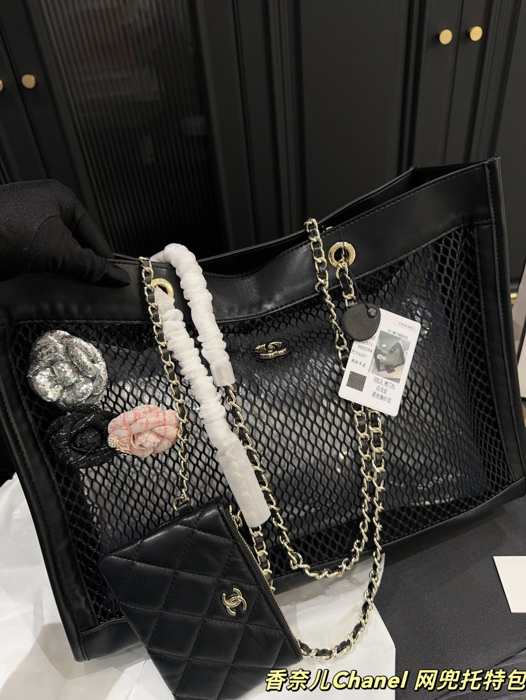 Luxury Black Leather Mesh Tote Bag with Card Holder