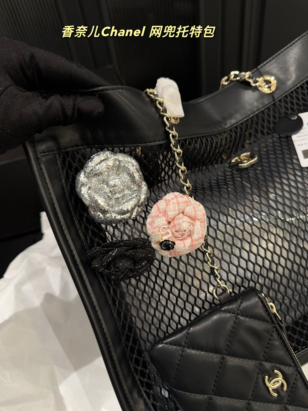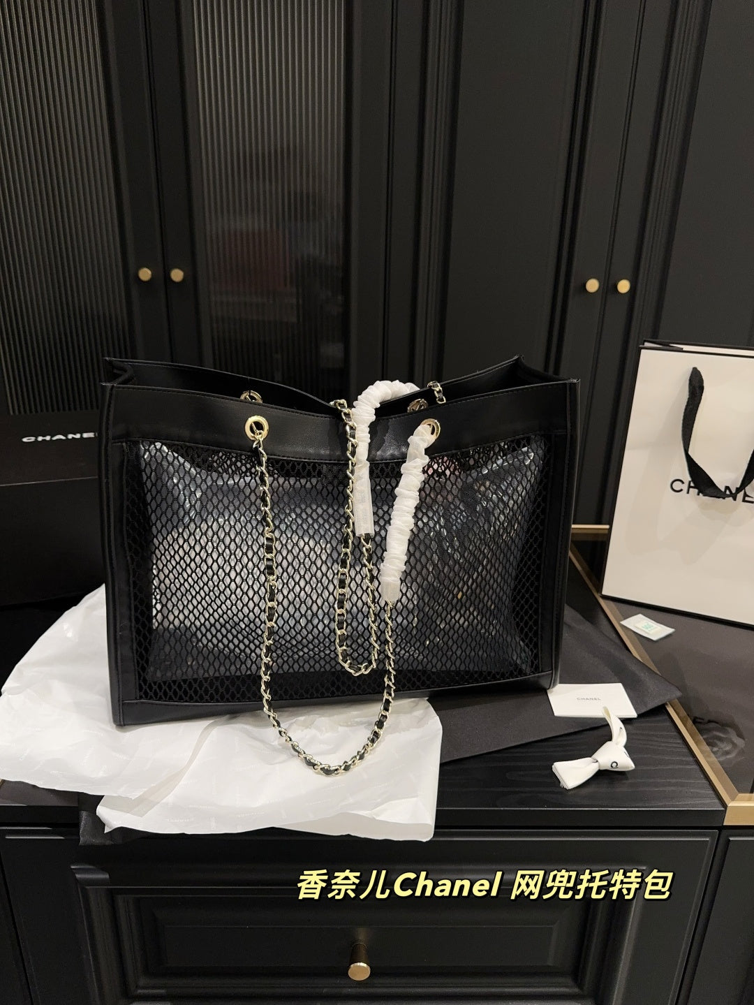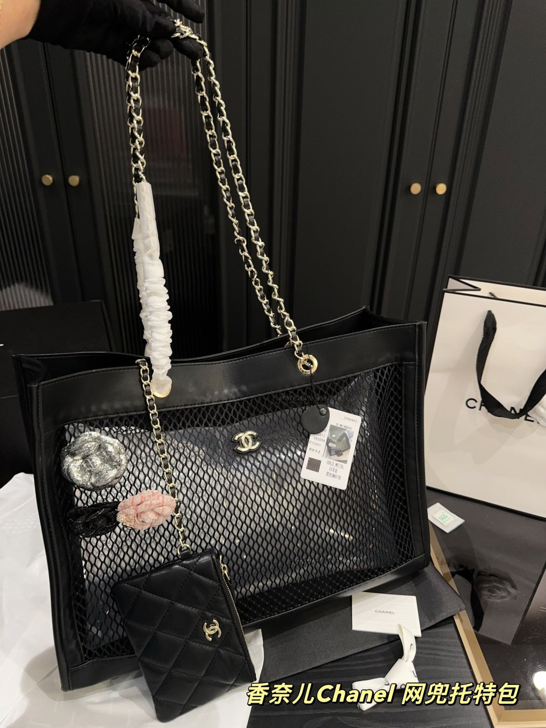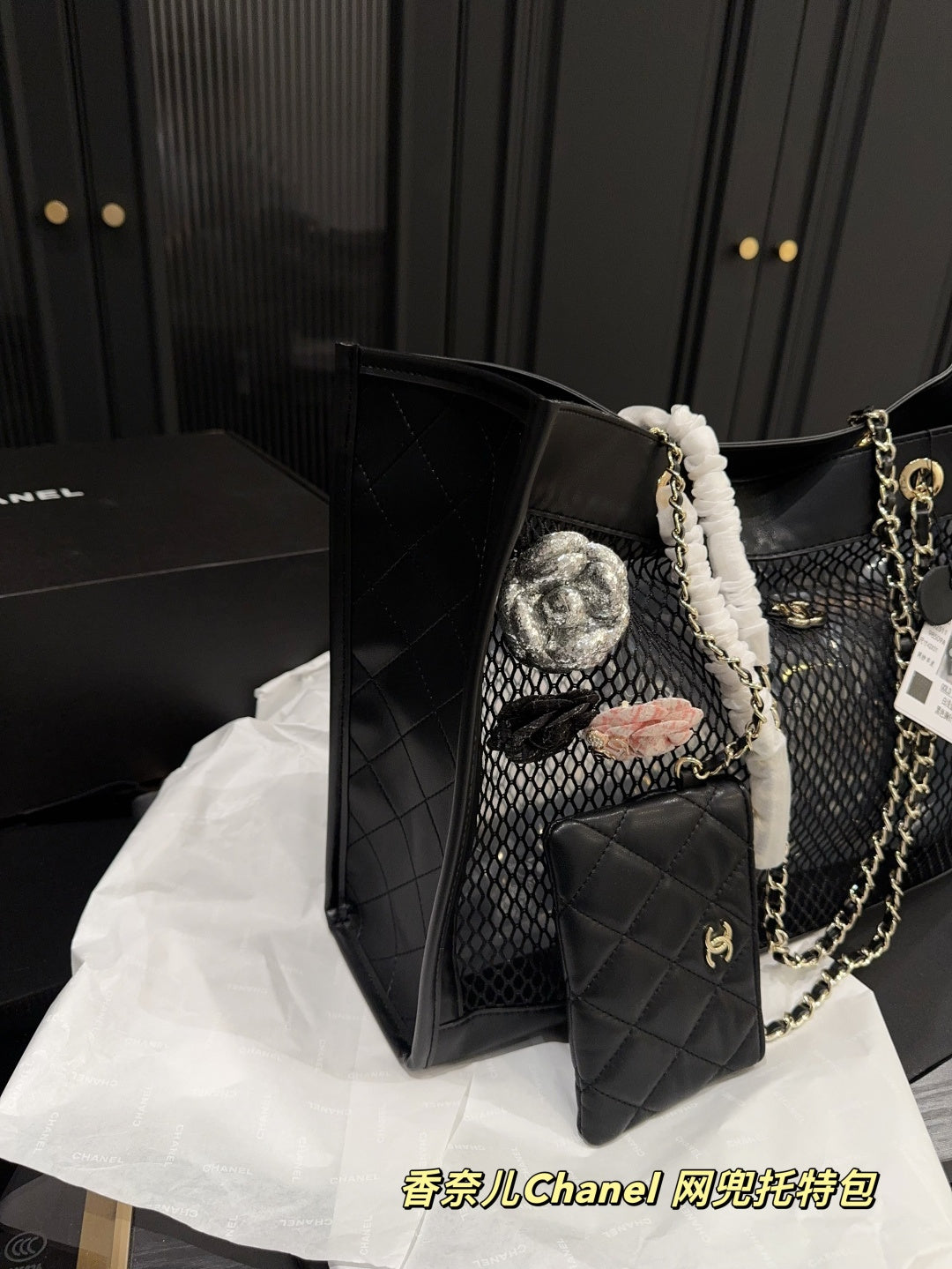 Luxury Black Leather Mesh Tote Bag with Card Holder