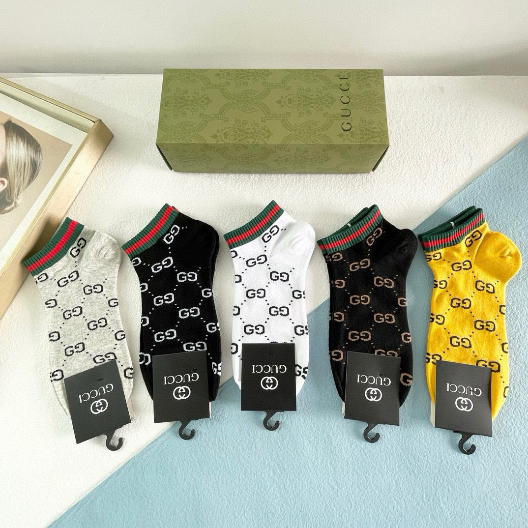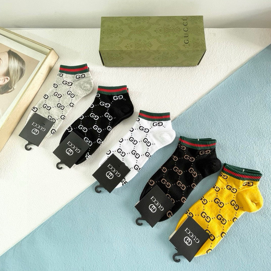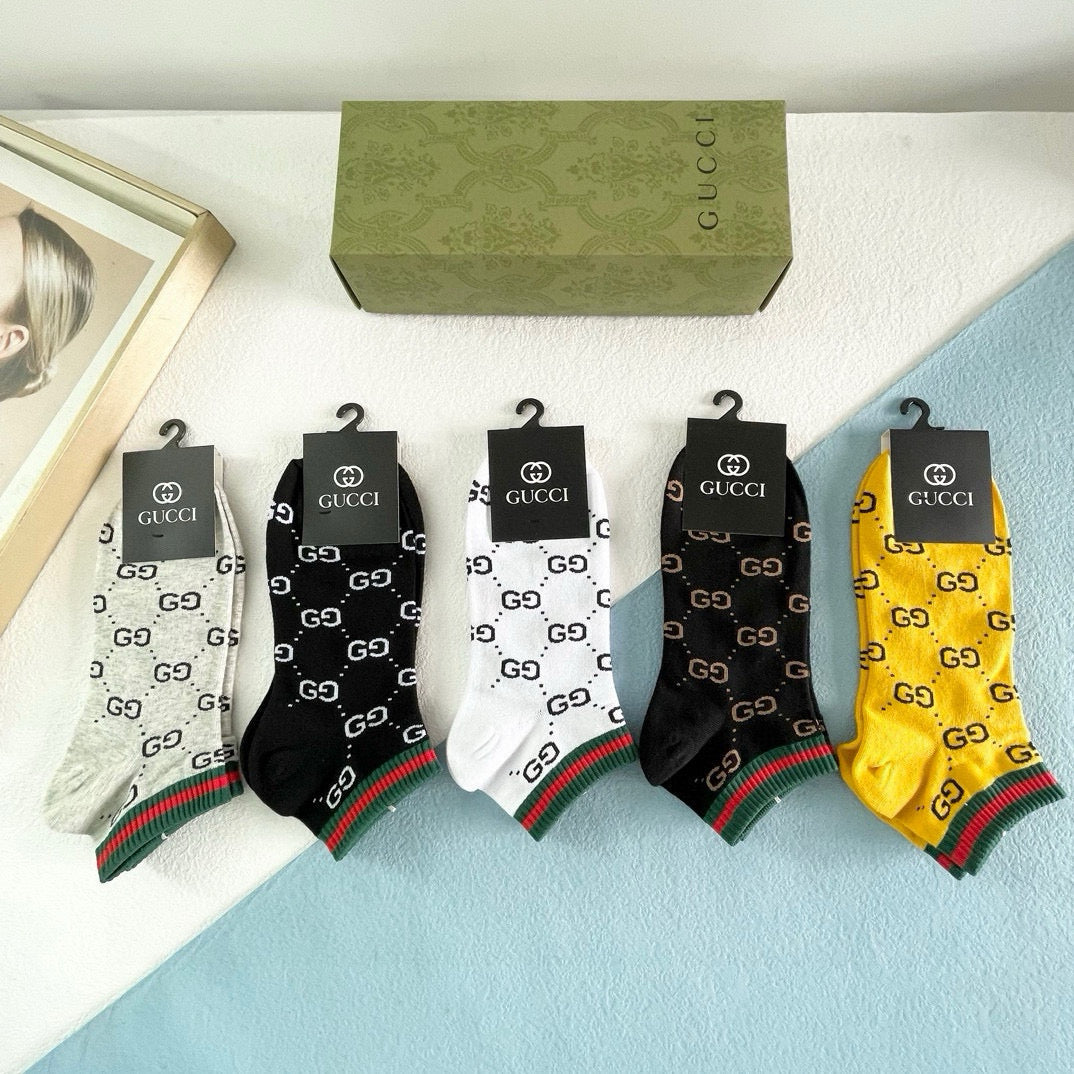 Elevate your style with our exclusive Gucci men's socks, featuring a premium five-pair box set. Designed to reflect the latest trends in European and American fashion, these high-quality socks are a must-have for any fashionista. Their luxurious feel and stylish look make them perfect for both casual and formal occasions. Pair them with your favorite outfits for an effortlessly chic appearance. A staple accessory for discerning individuals who appreciate high-end style. Recommended for anyone looking to enhance their wardrobe with a touch of sophistication!