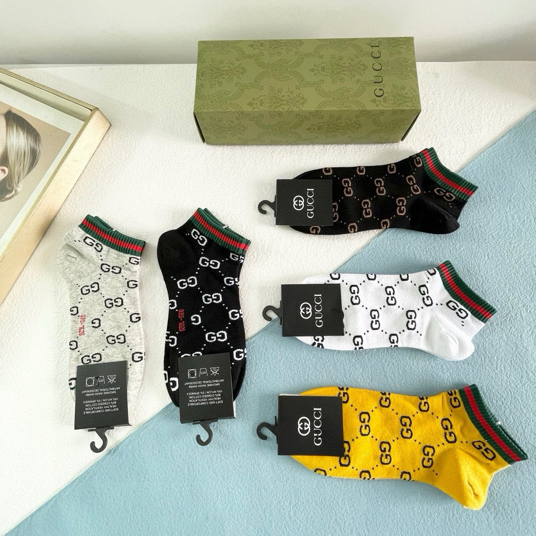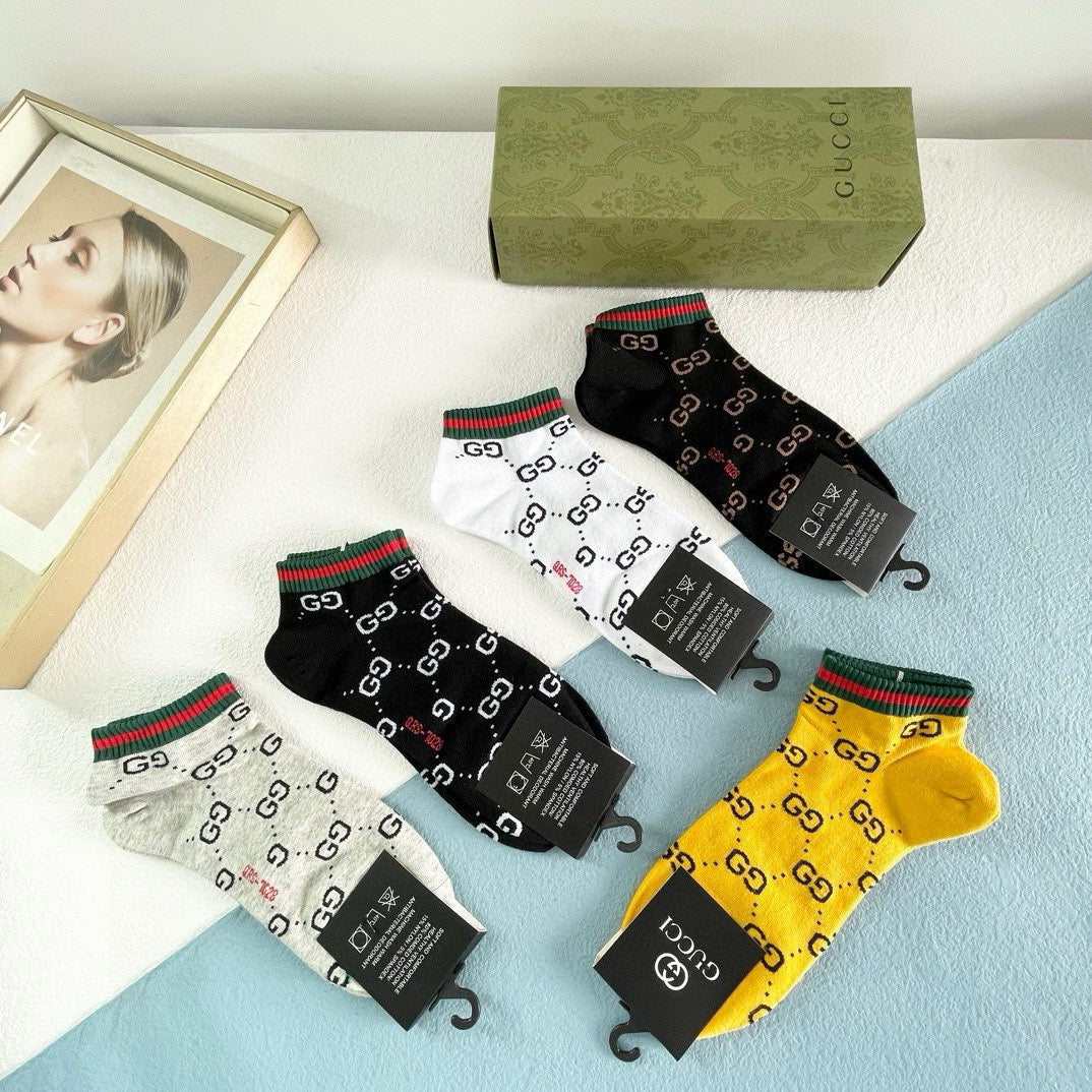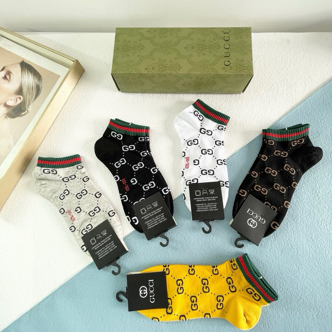 Elevate your style with our exclusive Gucci men's socks, featuring a premium five-pair box set. Designed to reflect the latest trends in European and American fashion, these high-quality socks are a must-have for any fashionista. Their luxurious feel and stylish look make them perfect for both casual and formal occasions. Pair them with your favorite outfits for an effortlessly chic appearance. A staple accessory for discerning individuals who appreciate high-end style. Recommended for anyone looking to enhance their wardrobe with a touch of sophistication!