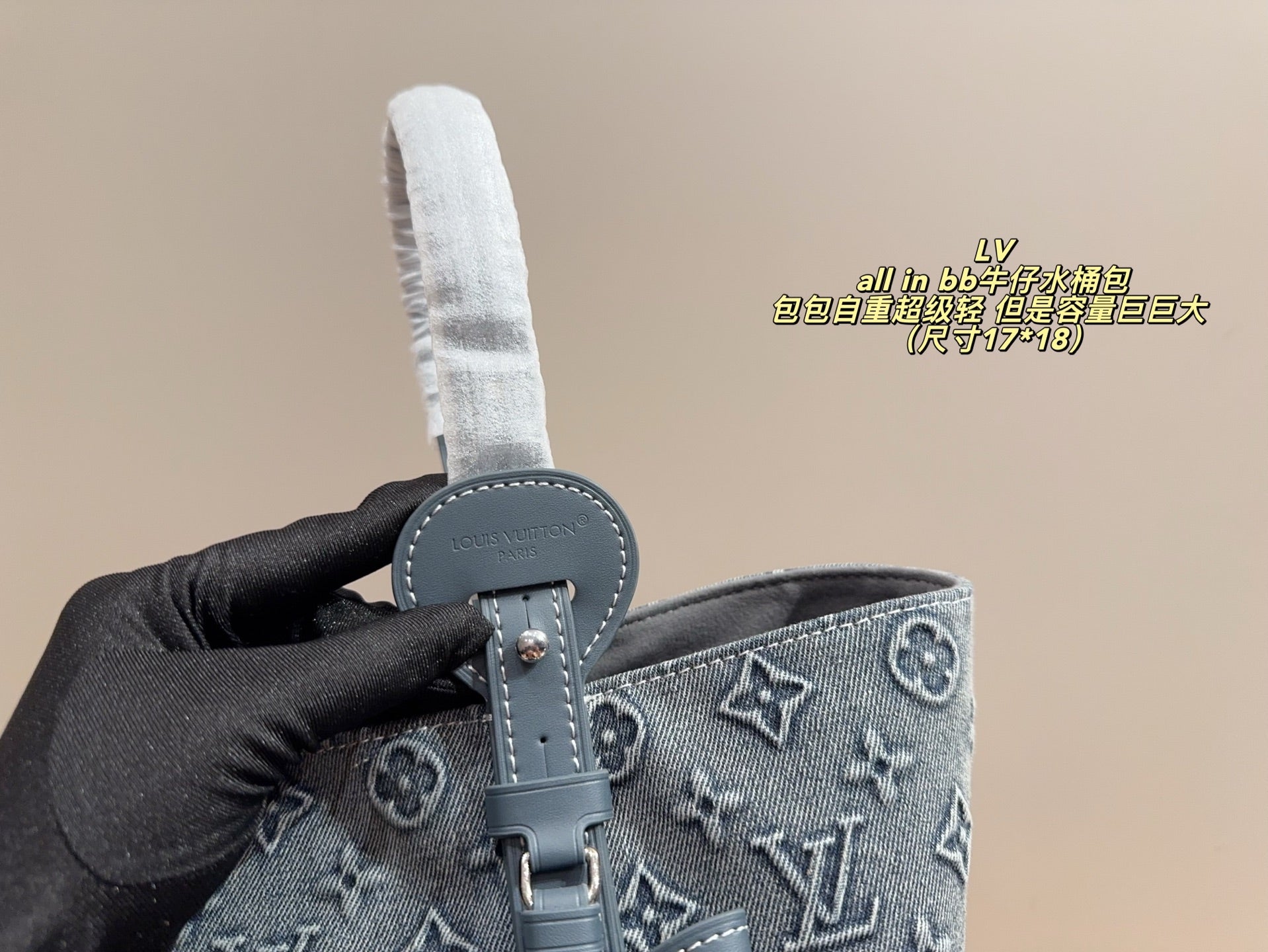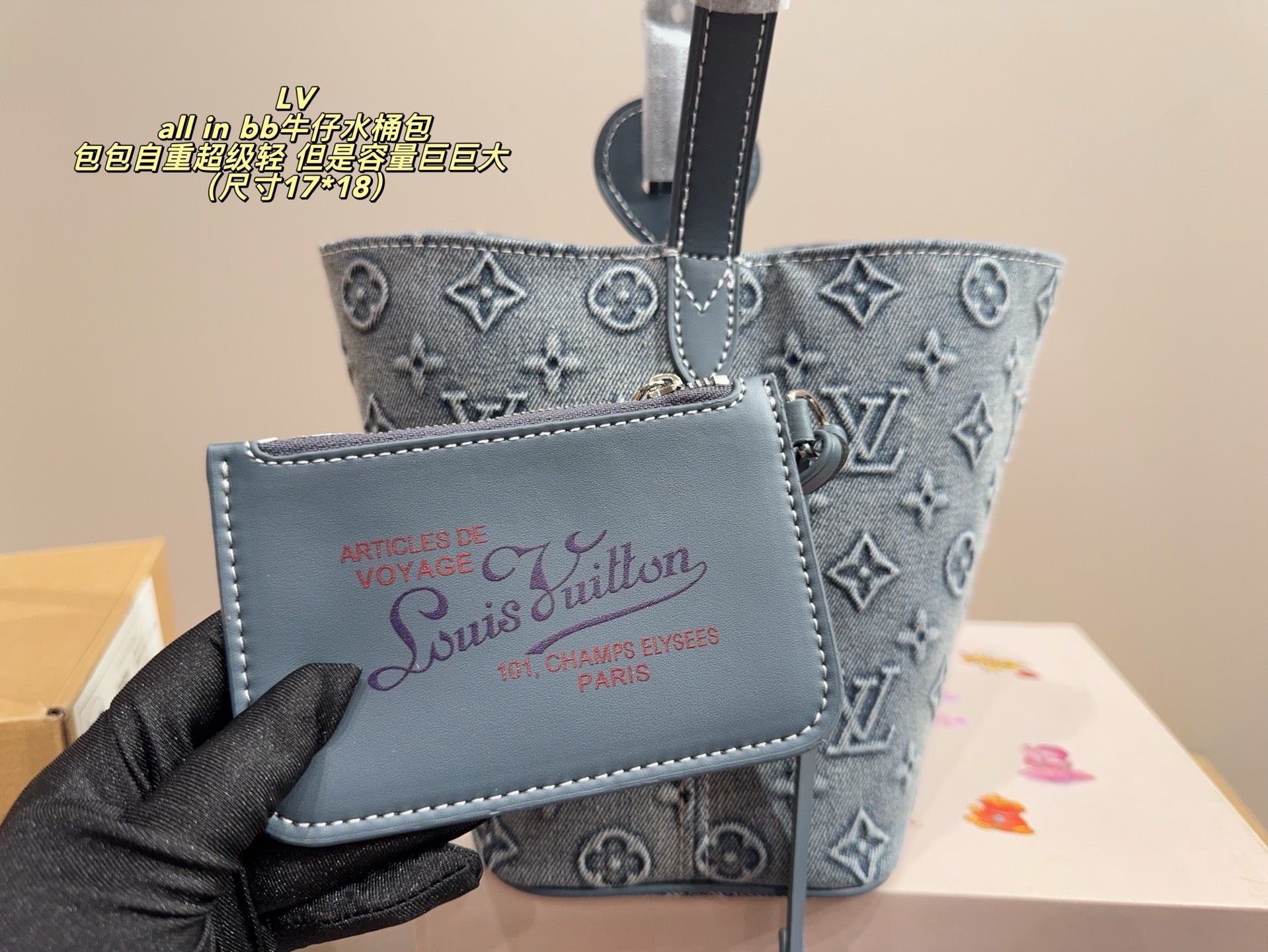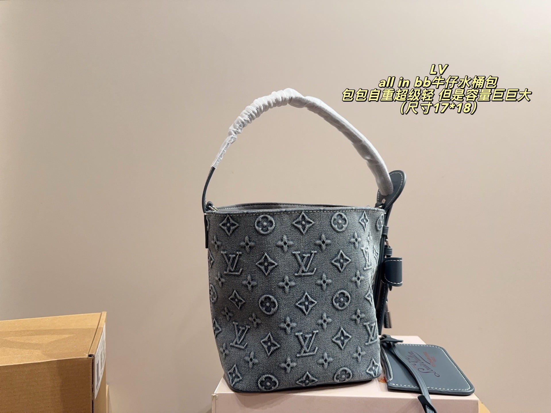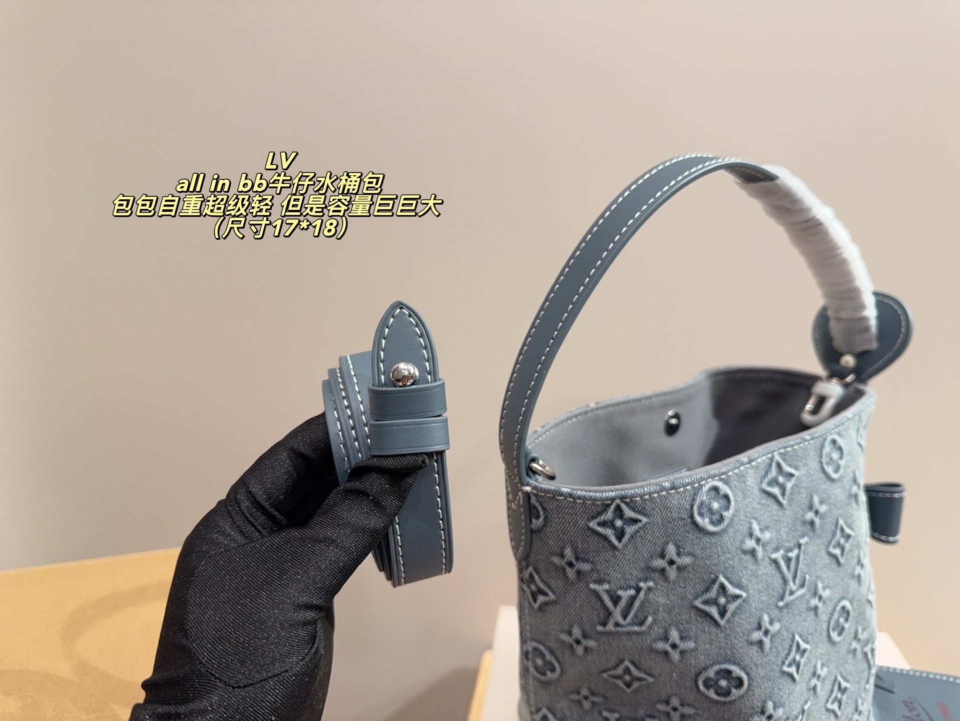 Introducing the LV All in BB Denim Bucket Bag – the perfect blend of style and functionality! Measuring 17 x 18 cm, this bag features a unique small bucket shape that exudes casual chic. It's designed for versatility, allowing you to effortlessly carry it in multiple ways, including the favored vegetable basket method and the stylish Siomai bag carry.