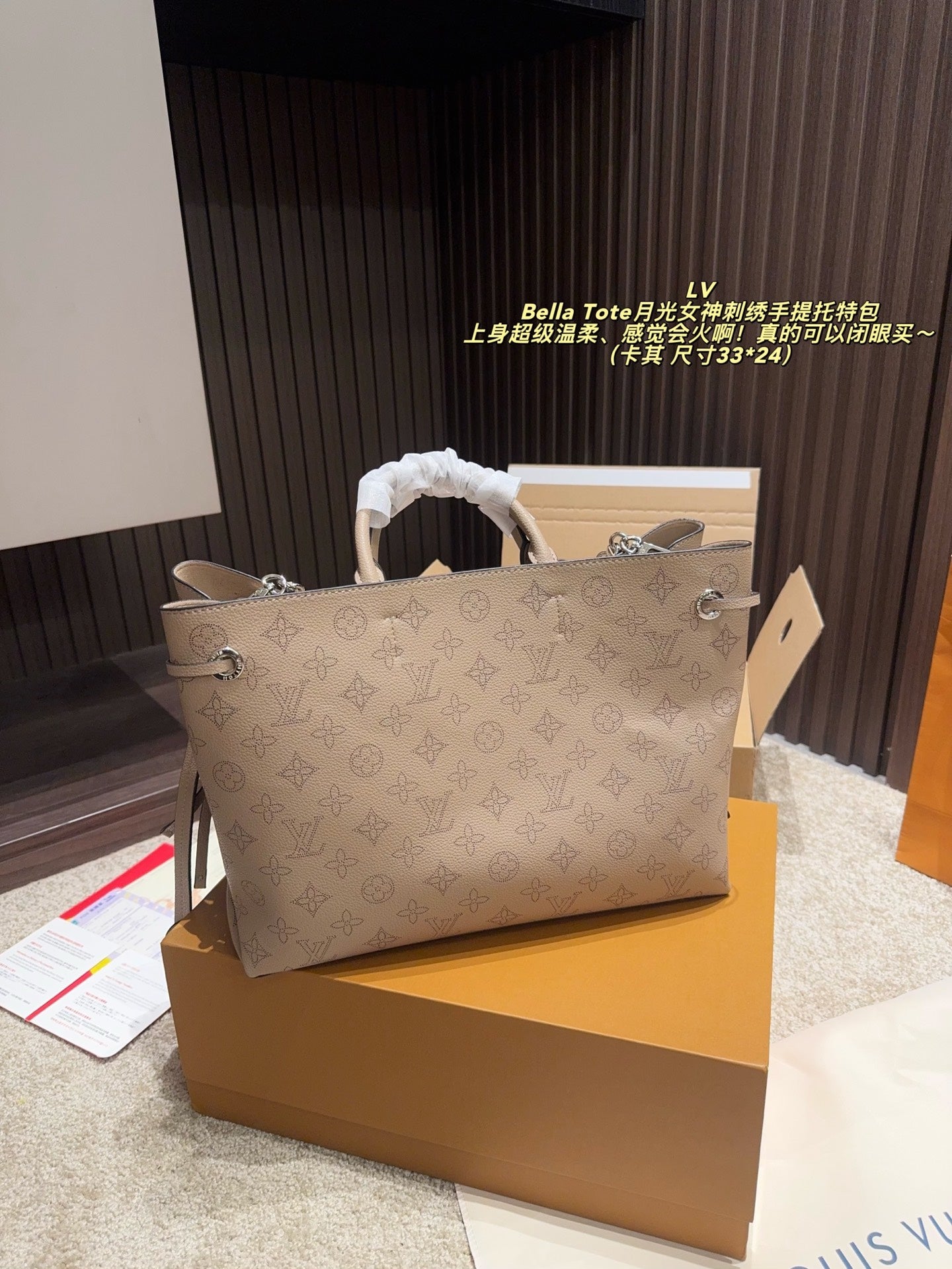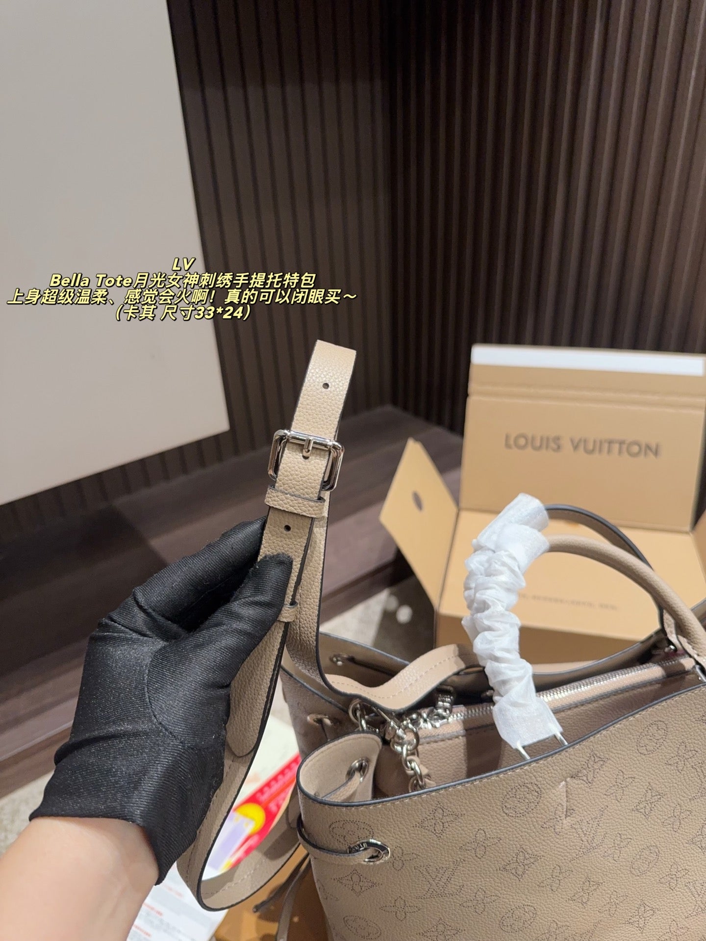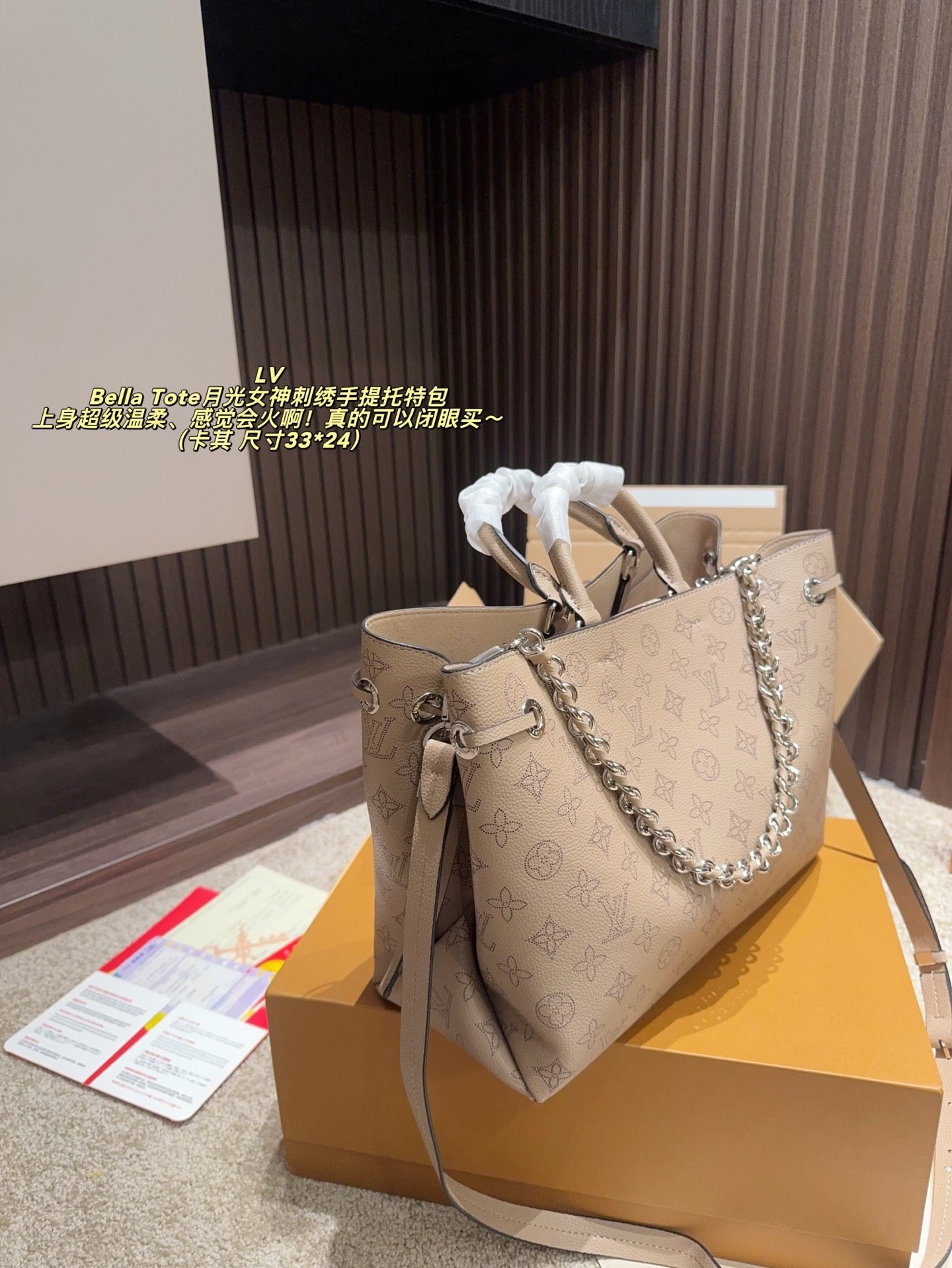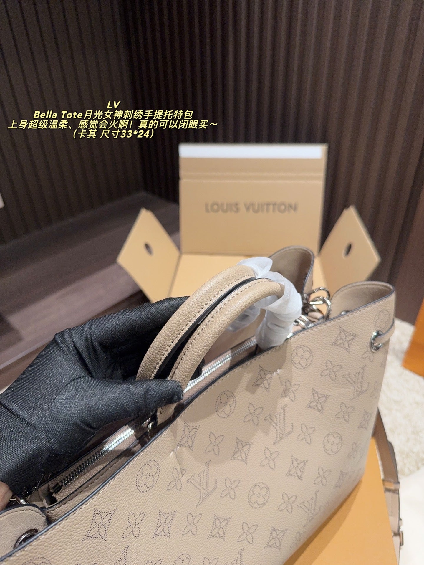 Introducing the LV Bella Tote Moonlight Goddess – an elegant and versatile handbag perfect for any occasion. Crafted from soft Mahina Creme leather, this stylish tote can be carried on your shoulder, across your body, or by hand. Its exquisite embroidery adds a touch of sophistication, making it a must-have accessory. With its spacious design measuring 33*24 cm, this tote offers ample room for your essentials while maintaining a lightweight feel. Elevate your wardrobe with the LV Bella Tote and indulge in the luxury of fashion that makes you feel confident and chic.