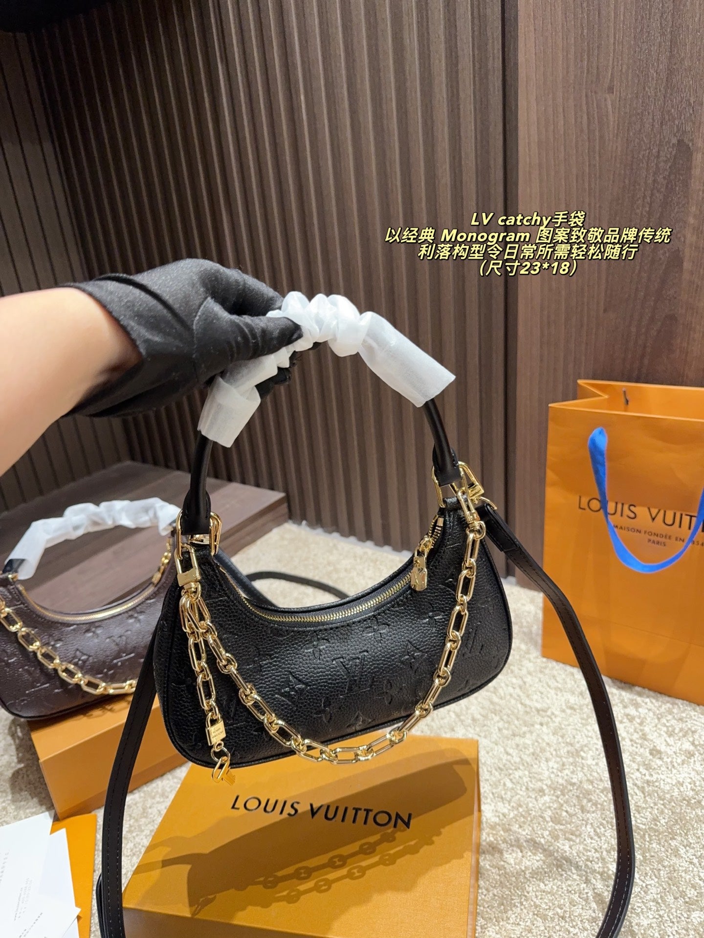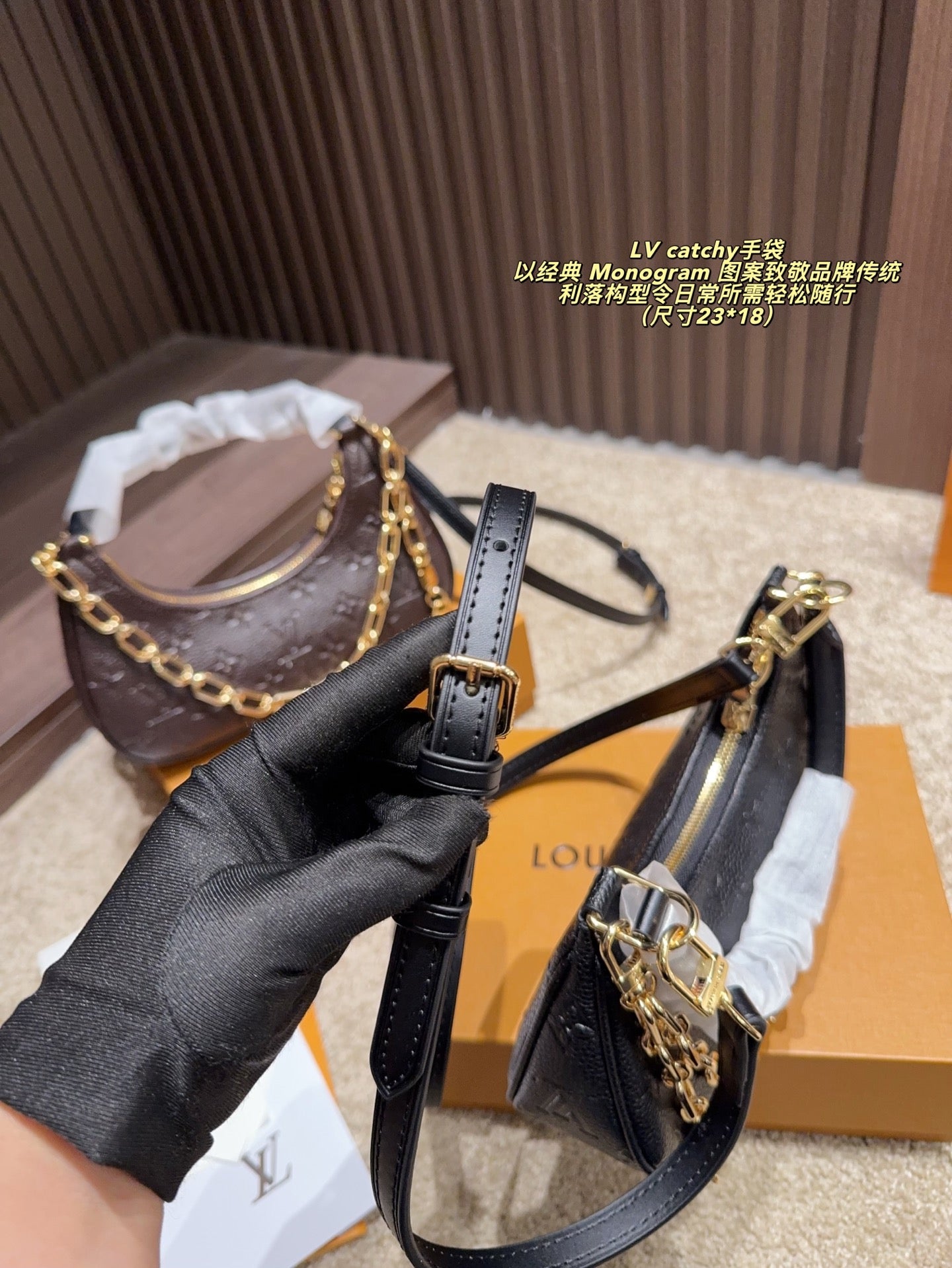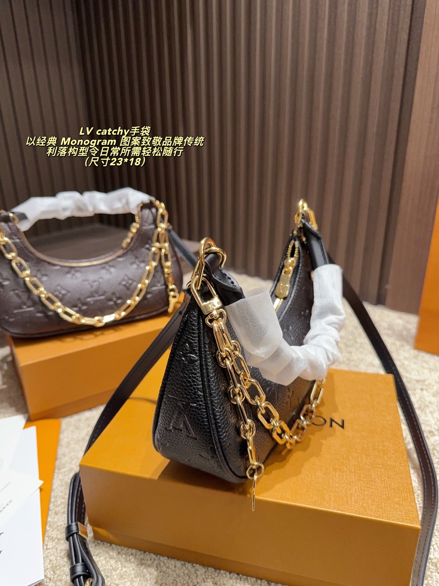 Introducing the LV Catchy Small Handbag, a stylish blend of heritage and modern design. Measuring 23 x 18 cm, this handbag is crafted from durable canvas and luxurious calfskin, showcasing the iconic Monogram pattern that pays tribute to the brand’s legacy. Its structured silhouette is perfect for carrying your daily essentials with ease. The adjustable double-sided sliding straps allow for personalized comfort, while the detachable metal chain adds a touch of elegance with a key-shaped decoration. Elevate your wardrobe with this chic accessory that combines functionality and high fashion. Comes with a box for convenient gifting or storage.