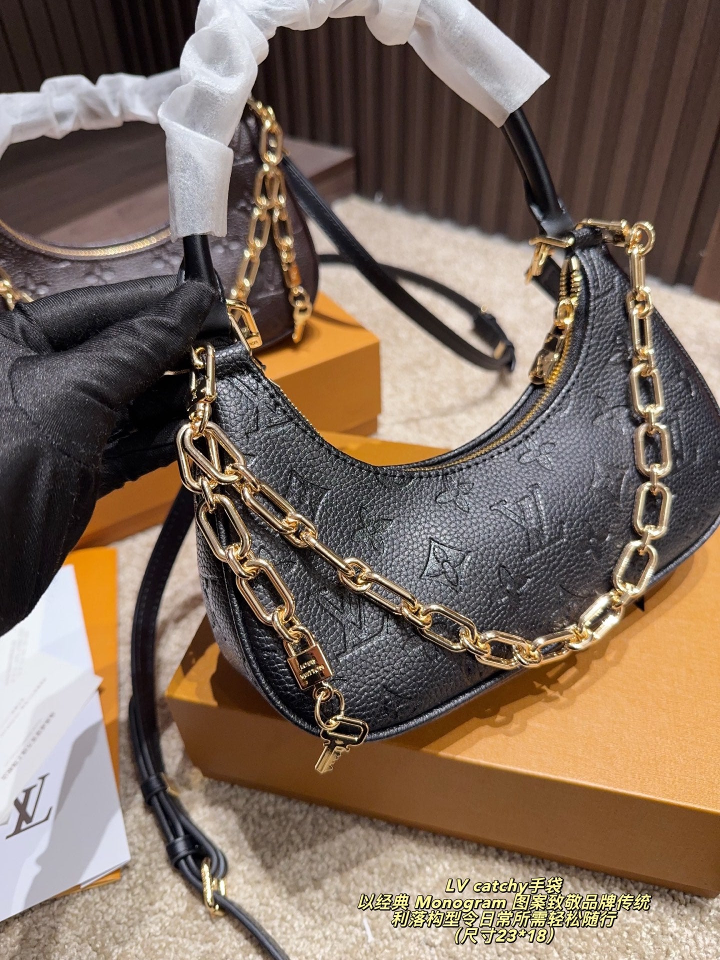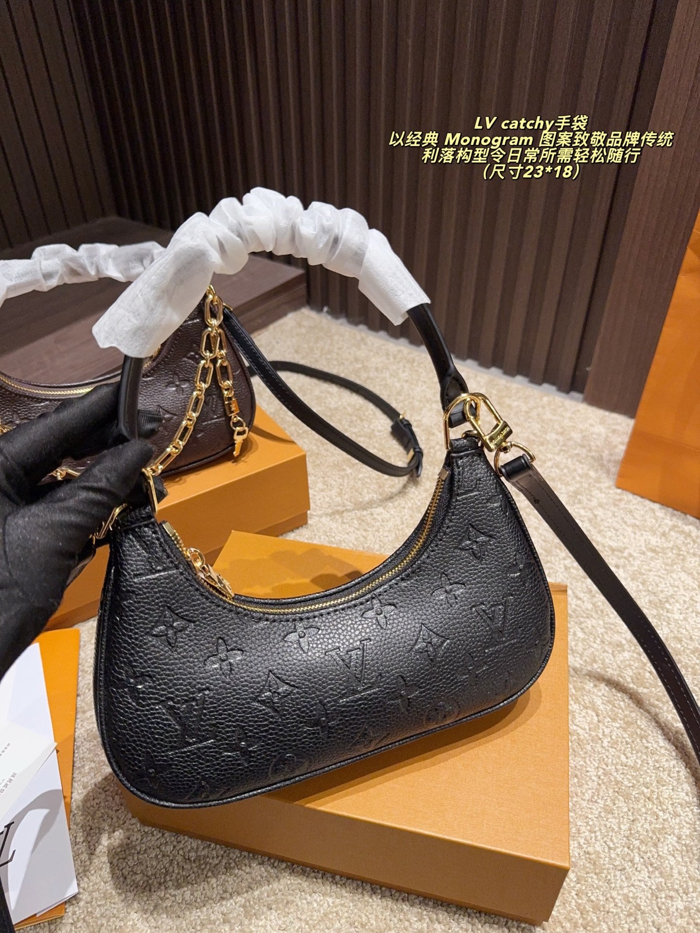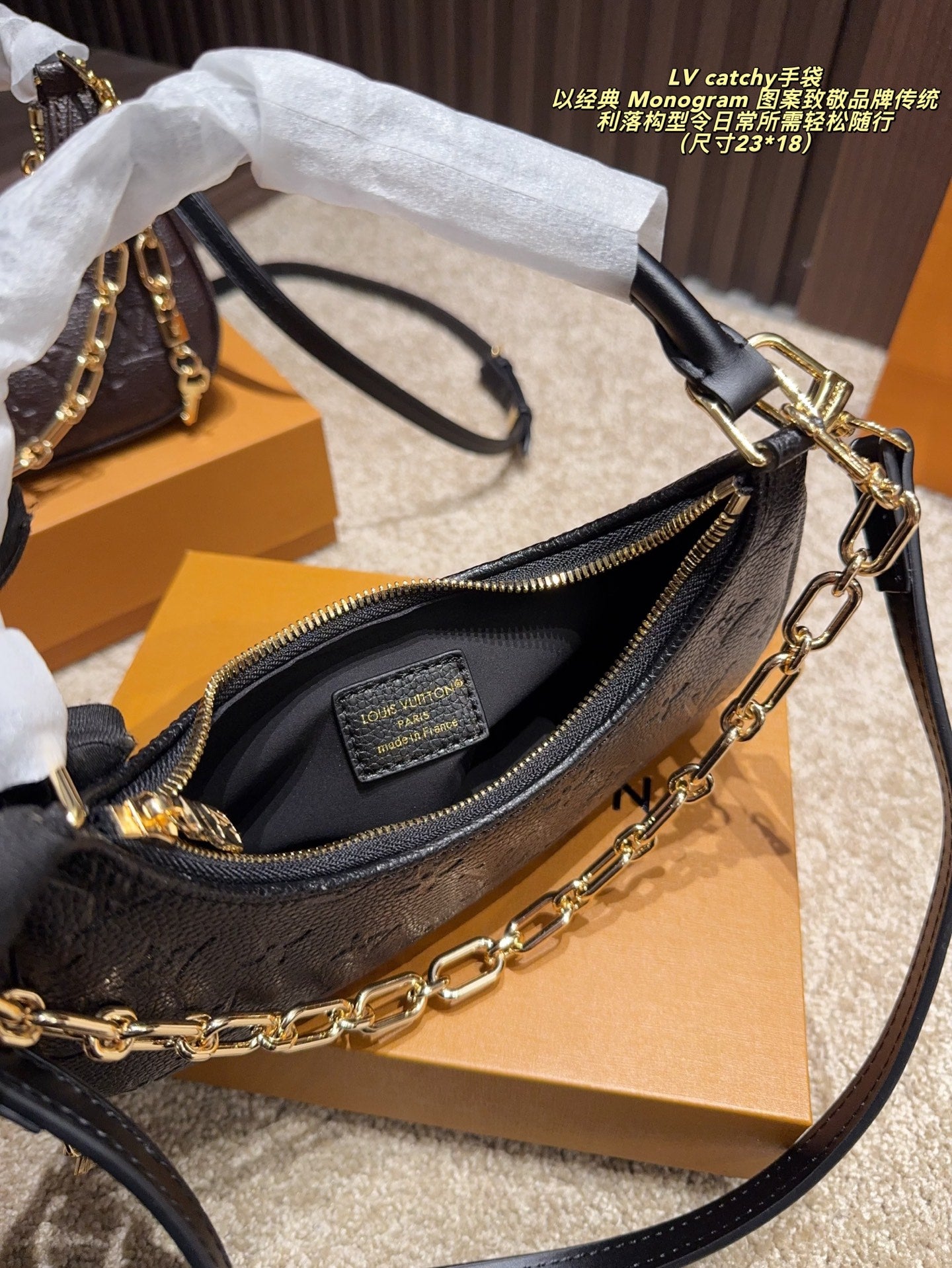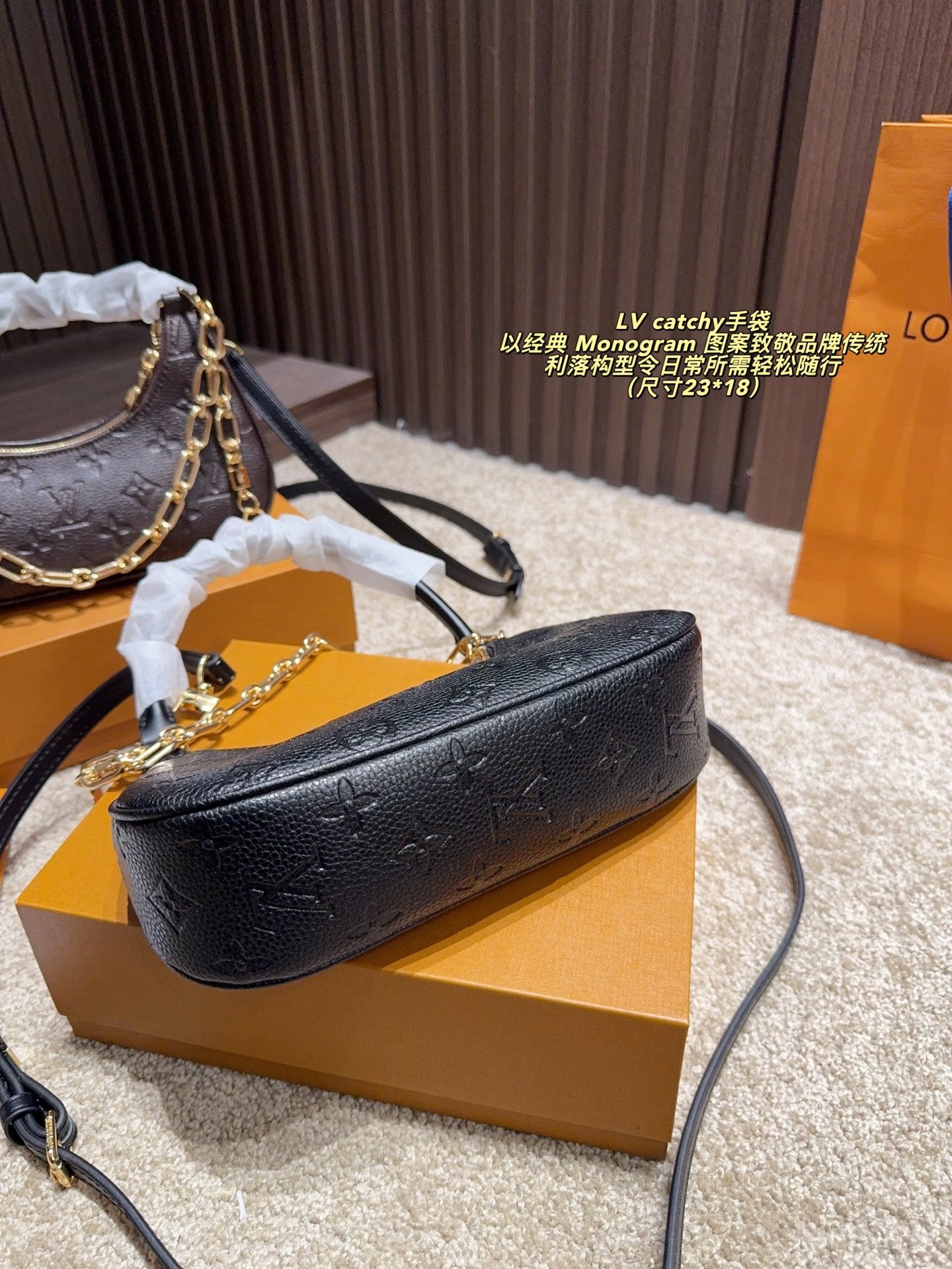 Introducing the LV Catchy Small Handbag, a stylish blend of heritage and modern design. Measuring 23 x 18 cm, this handbag is crafted from durable canvas and luxurious calfskin, showcasing the iconic Monogram pattern that pays tribute to the brand’s legacy. Its structured silhouette is perfect for carrying your daily essentials with ease. The adjustable double-sided sliding straps allow for personalized comfort, while the detachable metal chain adds a touch of elegance with a key-shaped decoration. Elevate your wardrobe with this chic accessory that combines functionality and high fashion. Comes with a box for convenient gifting or storage.