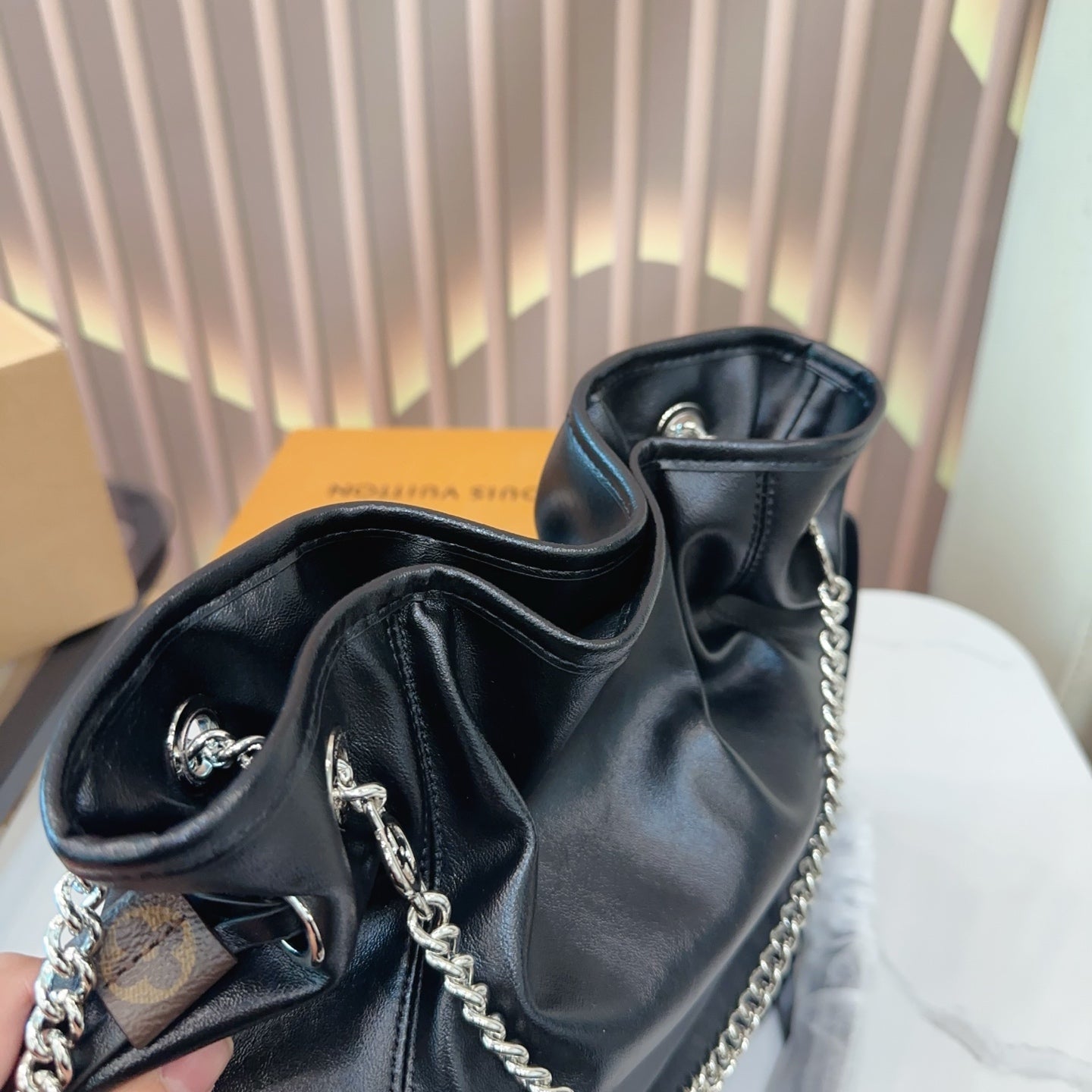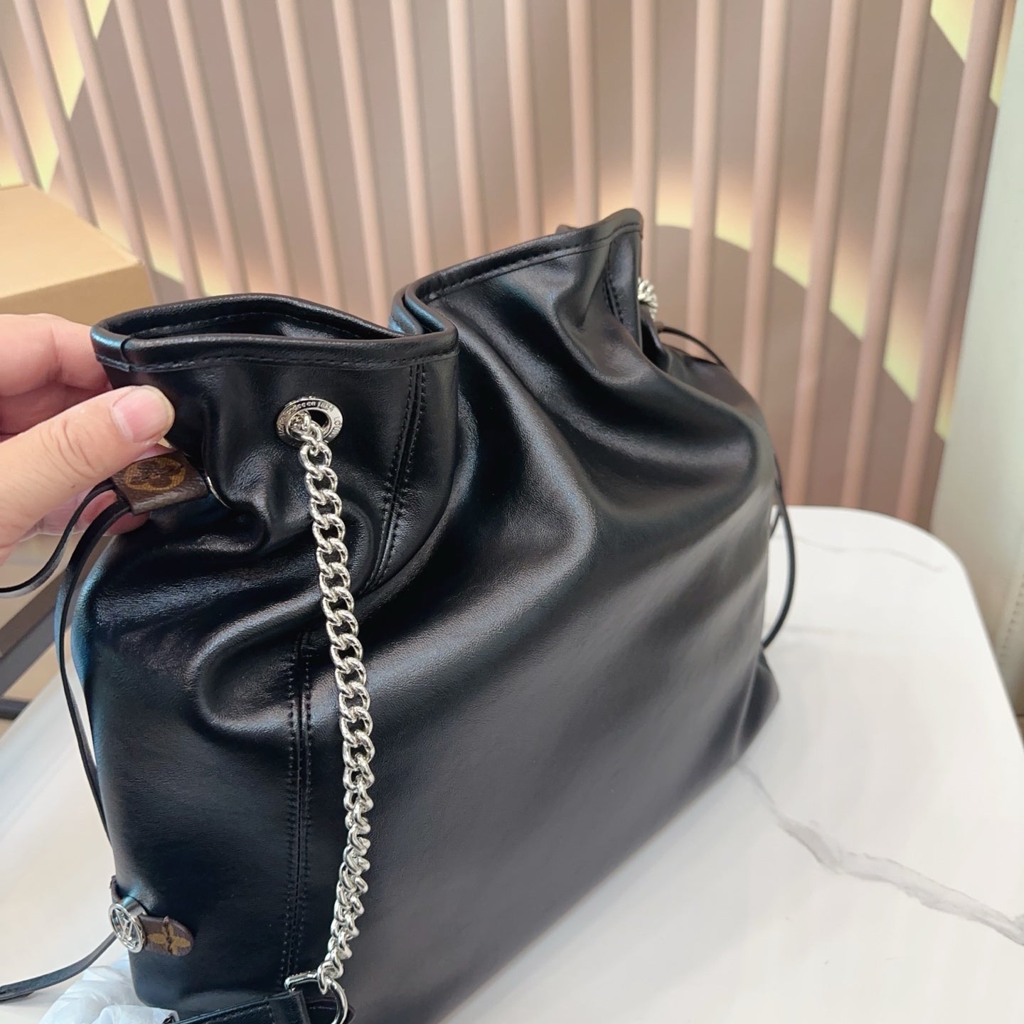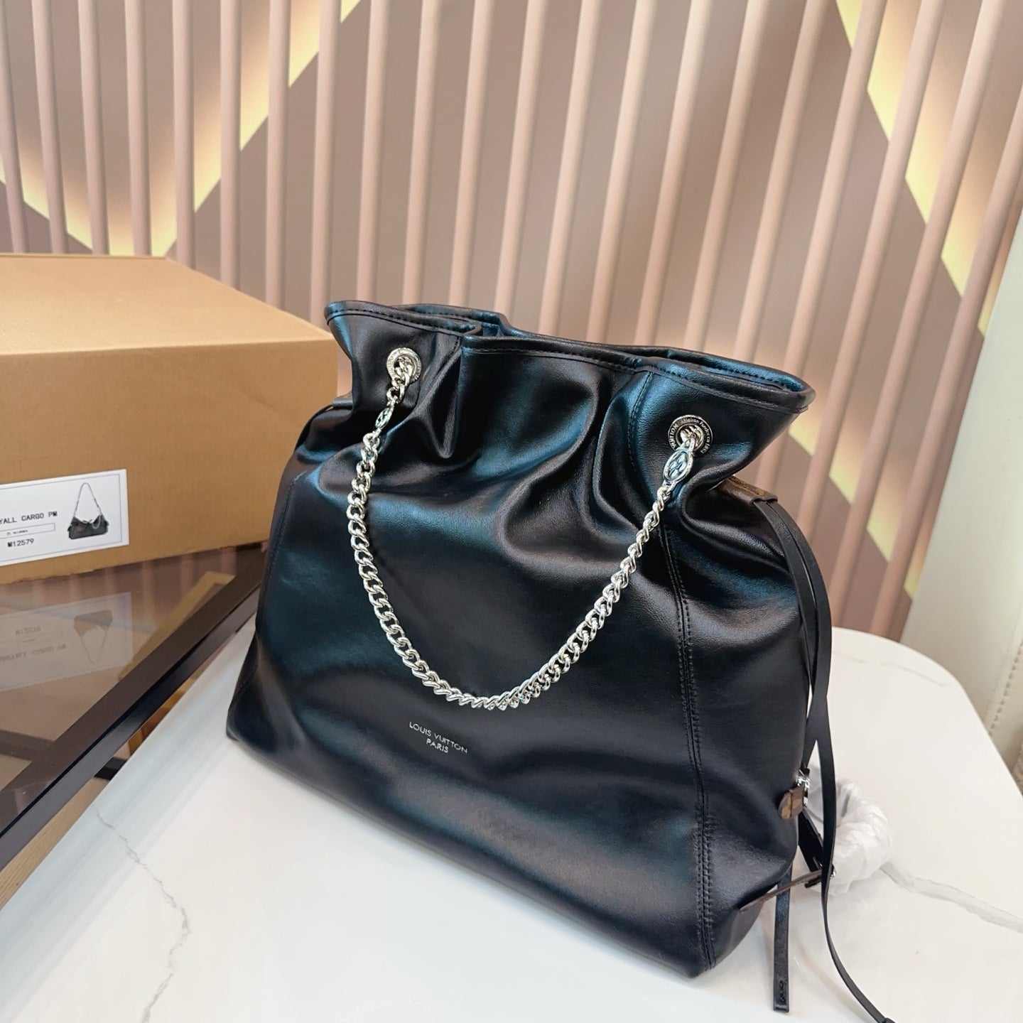 Elevate your style with the LV OFF DUTY VIBE Black Warrior Shoulder Bag. This sophisticated accessory, measuring 30x34 cm, seamlessly blends luxury and leisure. Crafted from premium lambskin and featuring a sleek silver chain, it exudes an effortless charm perfect for the modern urbanite.