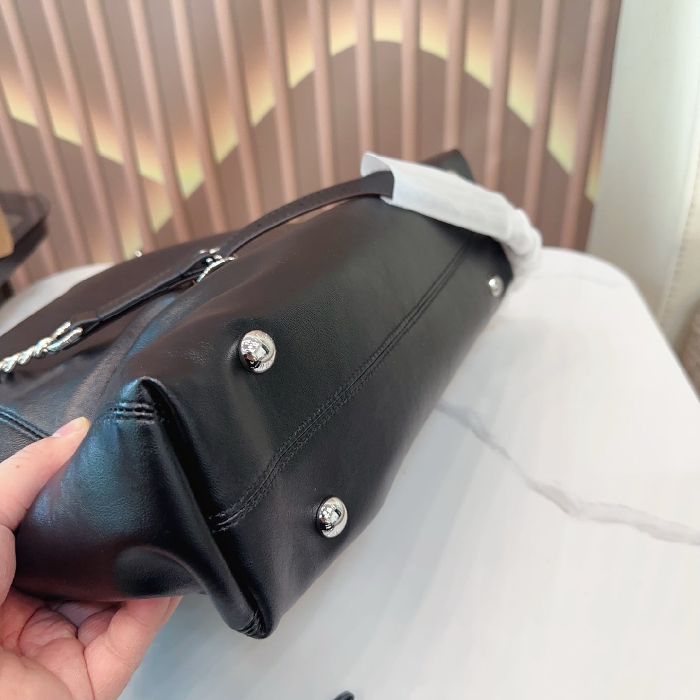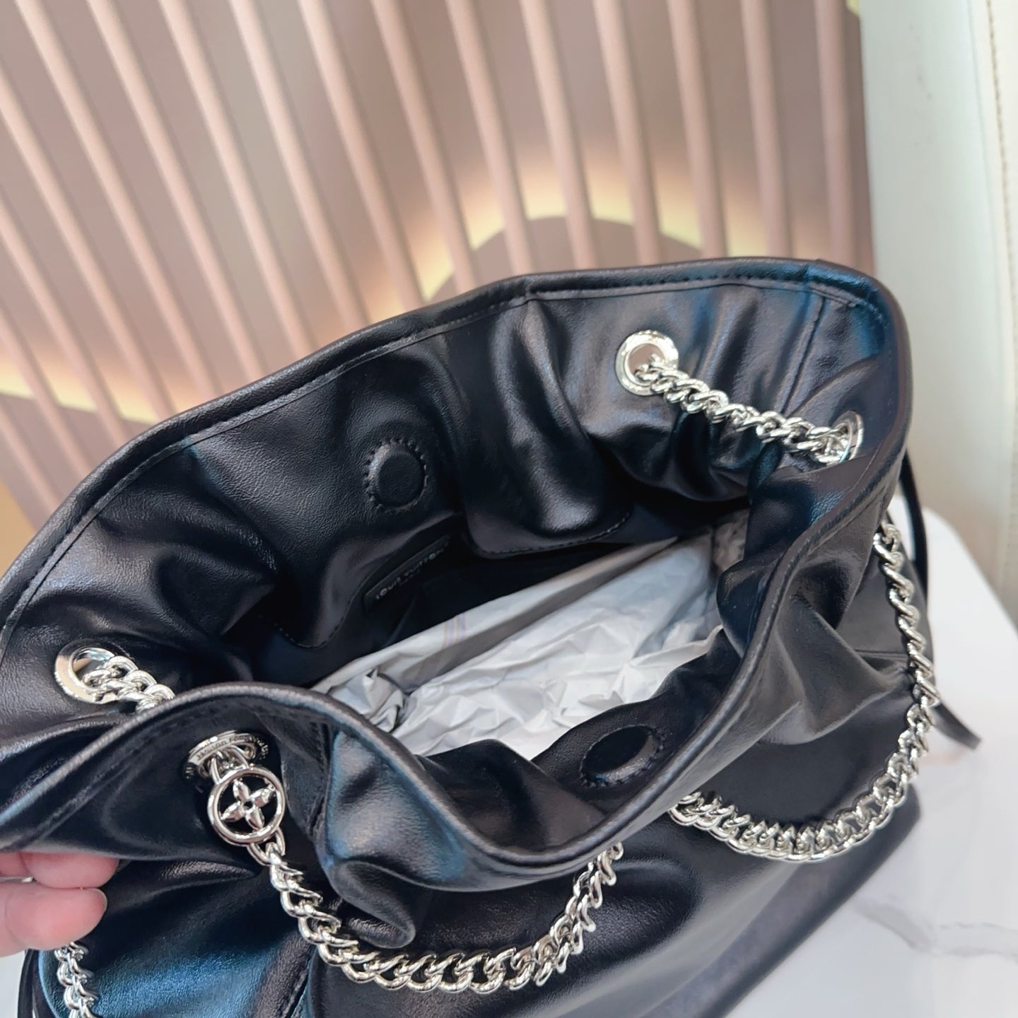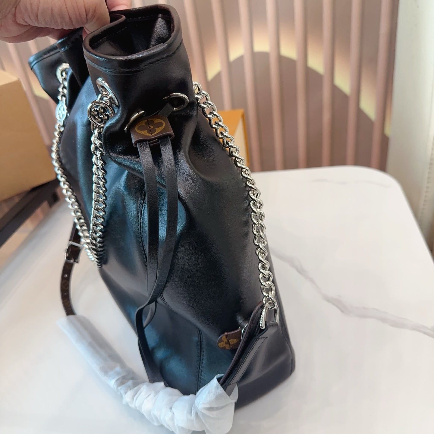 Elevate your style with the LV OFF DUTY VIBE Black Warrior Shoulder Bag. This sophisticated accessory, measuring 30x34 cm, seamlessly blends luxury and leisure. Crafted from premium lambskin and featuring a sleek silver chain, it exudes an effortless charm perfect for the modern urbanite.