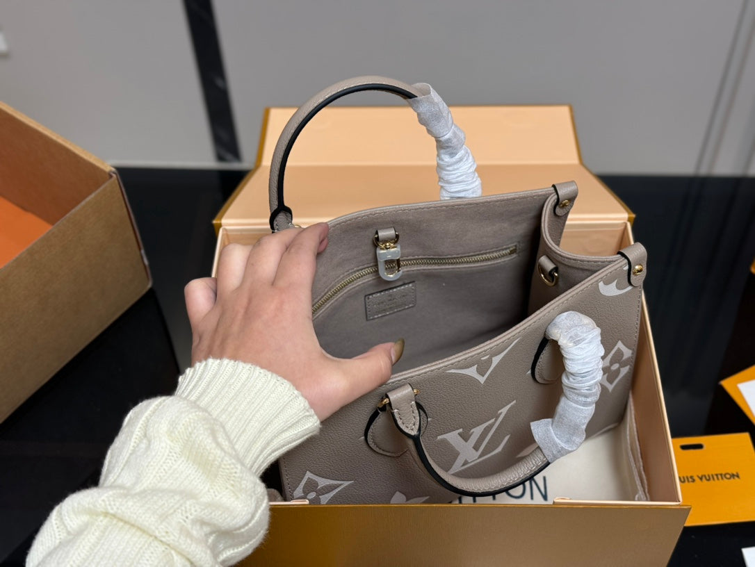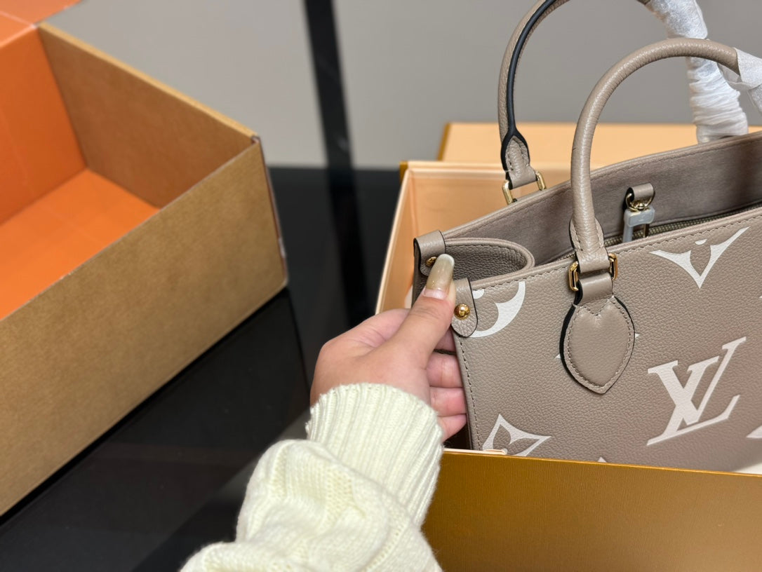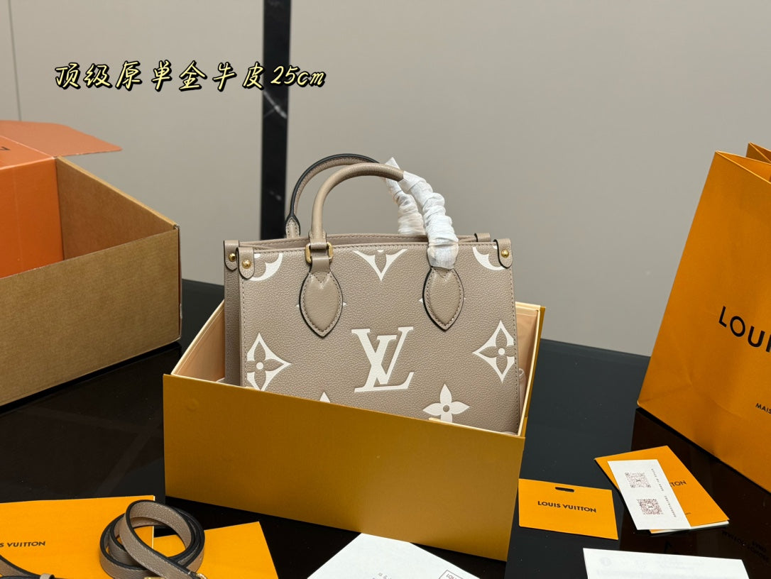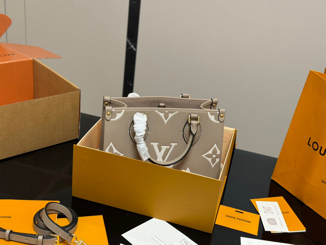 Elevate your style with the LV OnTheGo Leather Shopping Bag in the striking Jungle design. Measuring 25.20 cm, this versatile bag features a hidden strap that allows for easy shoulder wear or hand carry. Perfectly packaged in a folding box, it adds a touch of luxury to any outing. Ideal for fashion-forward individuals seeking practicality without compromising on elegance. Shop now and make a statement with this exquisite piece!