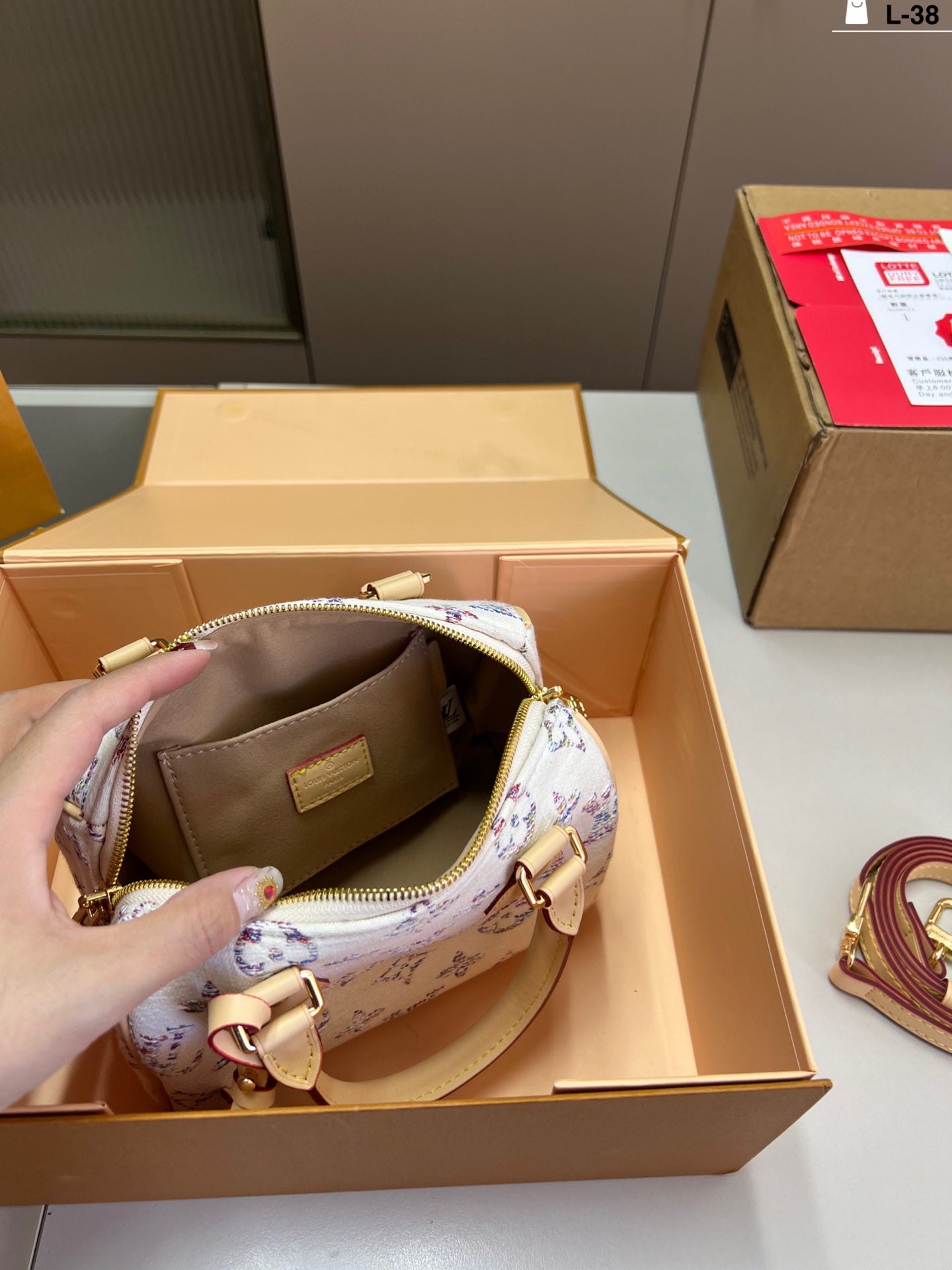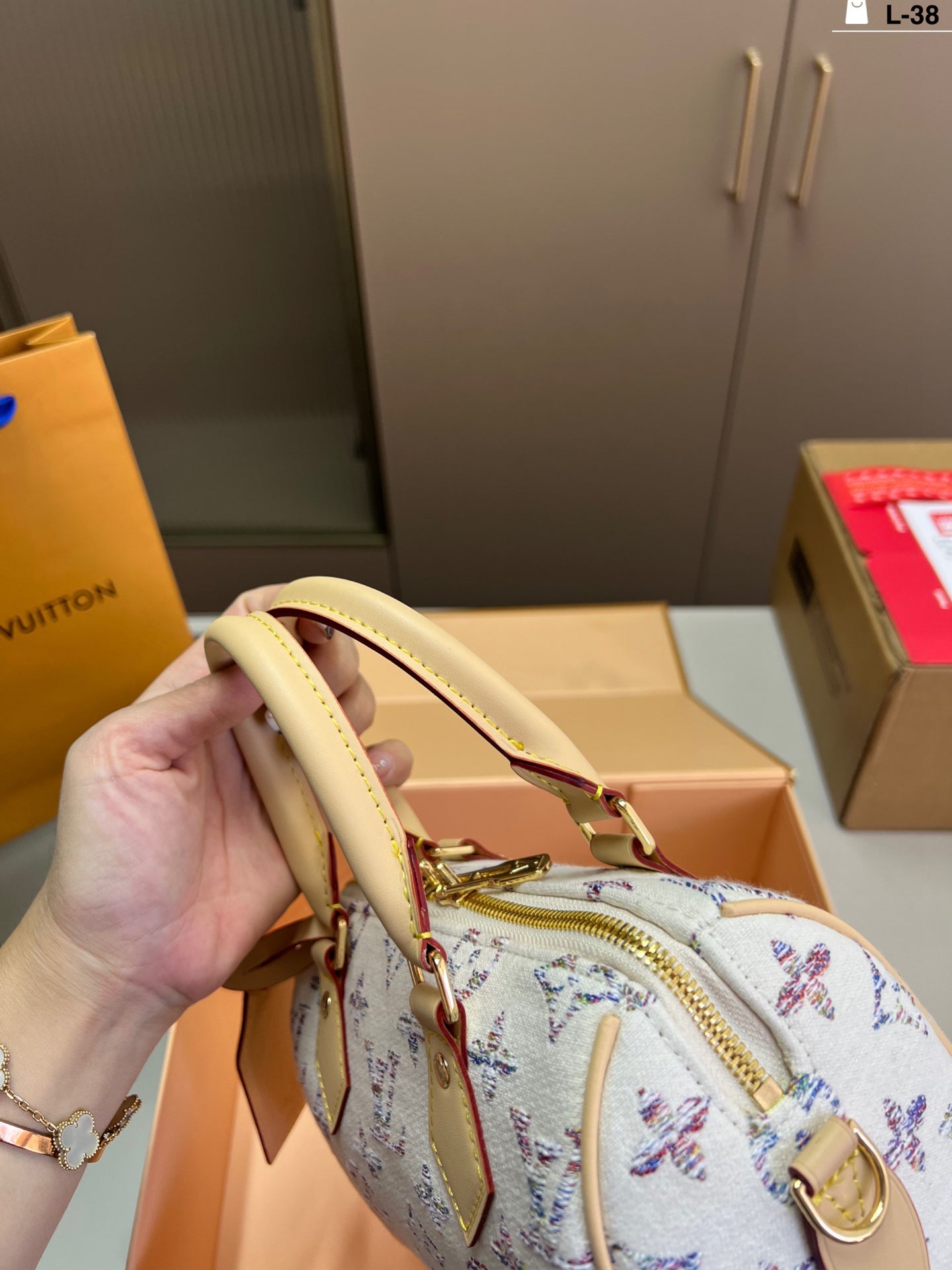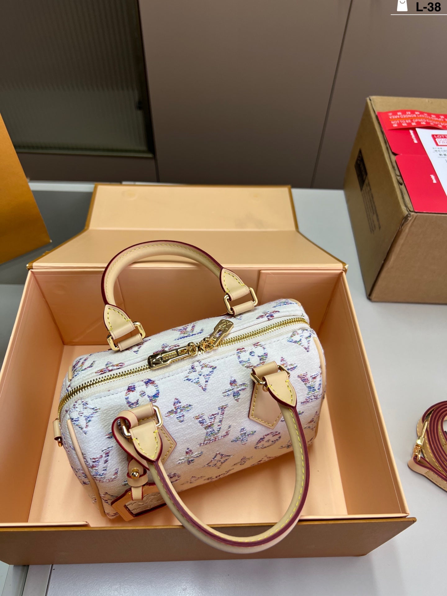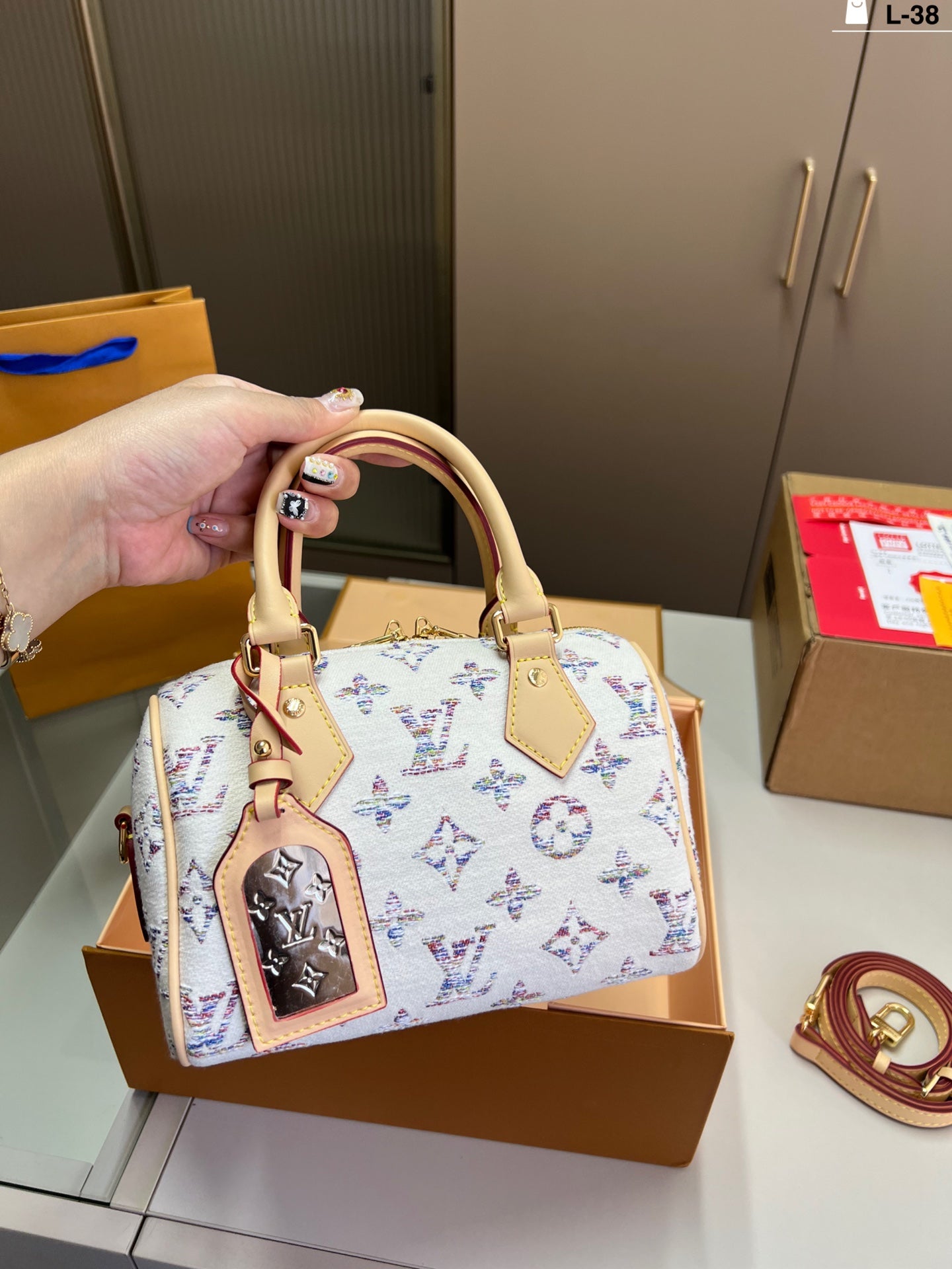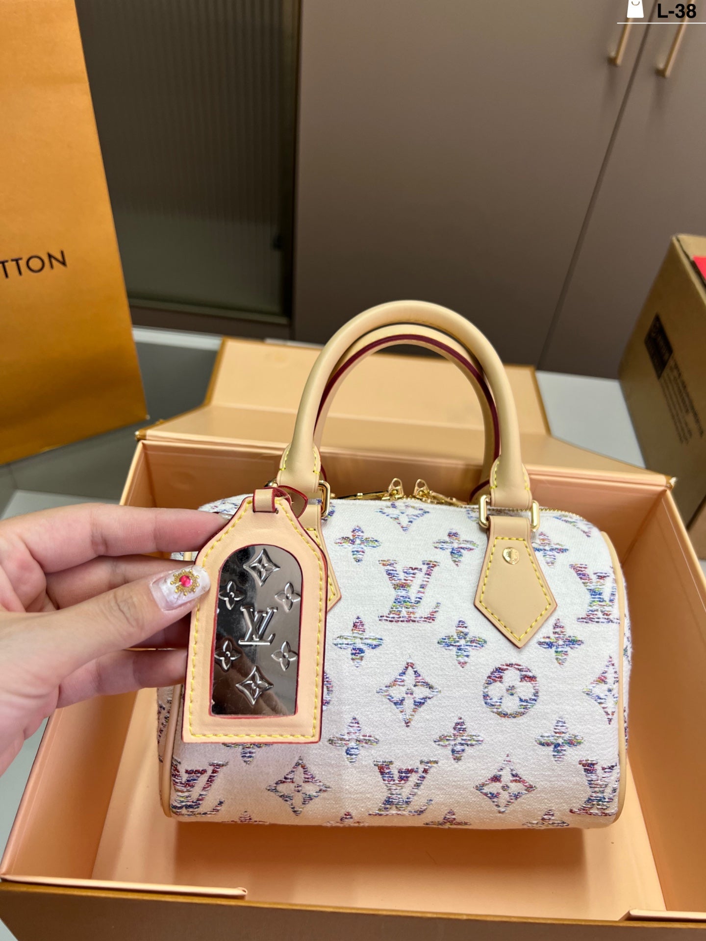 Introducing the LV Speedy Nautical Pillow Bag, a stunning addition to your wardrobe that embodies elegance and style. Crafted from high-quality white denim, this bag features a unique nautical design that exudes freshness and sophistication. With its convenient folding box size of 20×13, it's perfect for travel or everyday use. The accompanying luggage tag adds a personalized touch, making it a must-have accessory for fashion-forward individuals. Elevate your style with the LV Speedy Nautical Pillow Bag today!