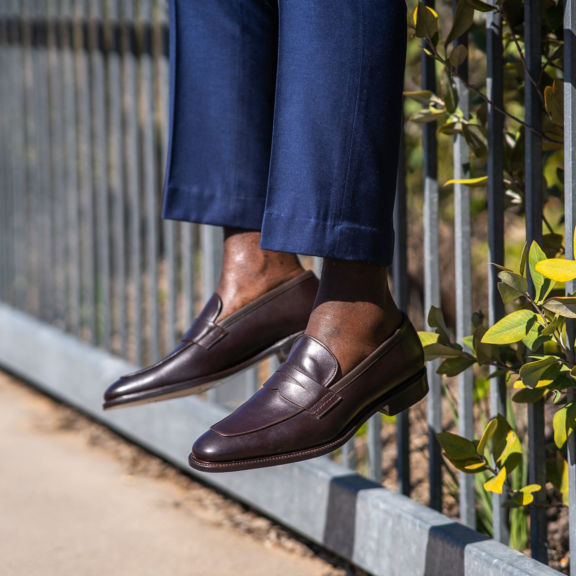 The Martin brown leather loafers are the pinnacle of classic slip-on shoes for men, featuring a beautifully decorated apron on the vamp. They are made from the finest box calfskin leather, sourced from European tanneries, and fully lined with soft calf leather for exceptional comfort. The vegetable tanned leather sole is easily resoled by any cobbler, offering long term value for money.