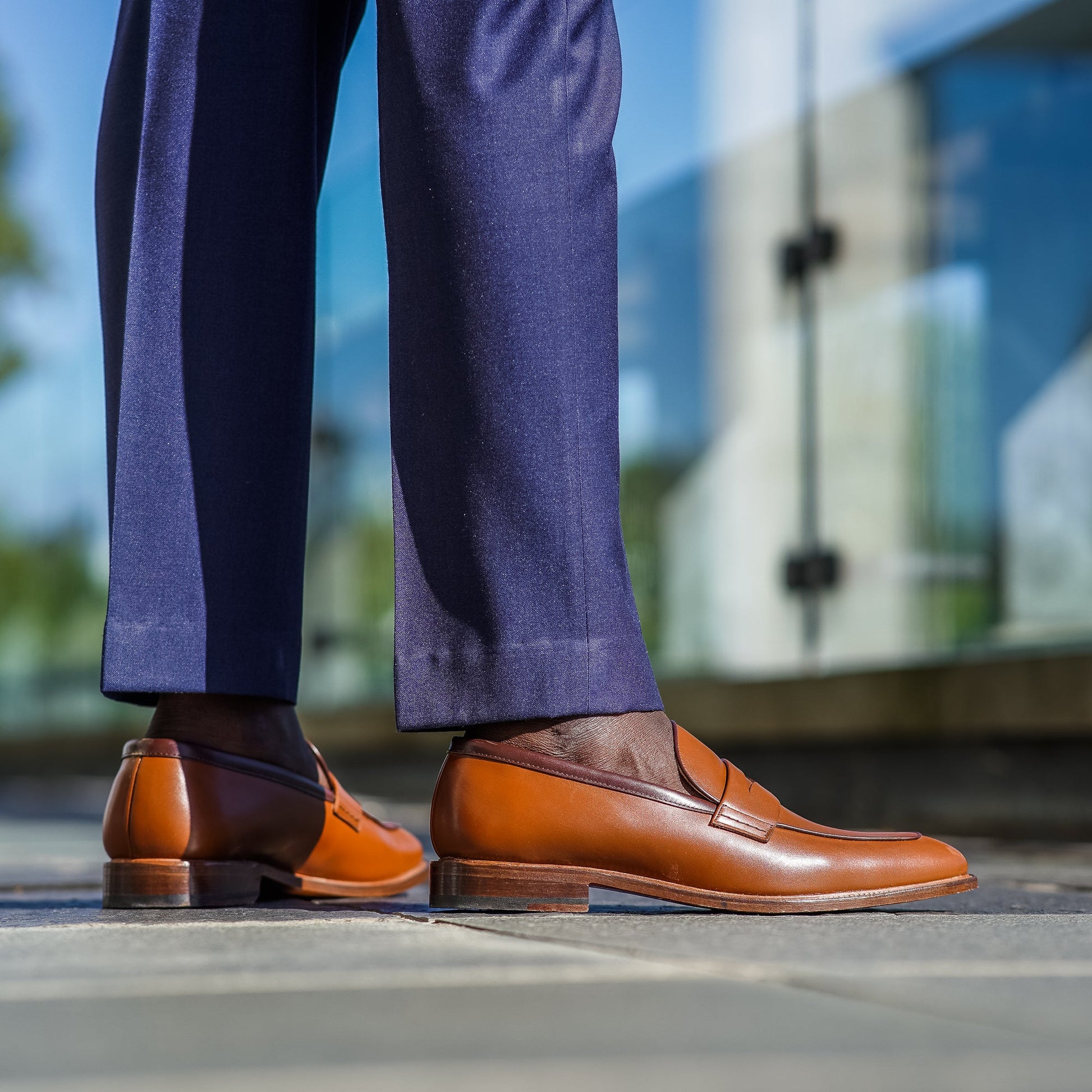 The Martin penny loafer in rich cognac is a cornerstone of smart casual shoes, with a heritage dating back to the late 1930s. This elegant slip on shoe is crafted from the finest box calf leather sourced from European tanneries. The midsole is filled with natural cork and reinforced with a steel shank to adapt to the shape of your feet, delivering superior comfort and support.
