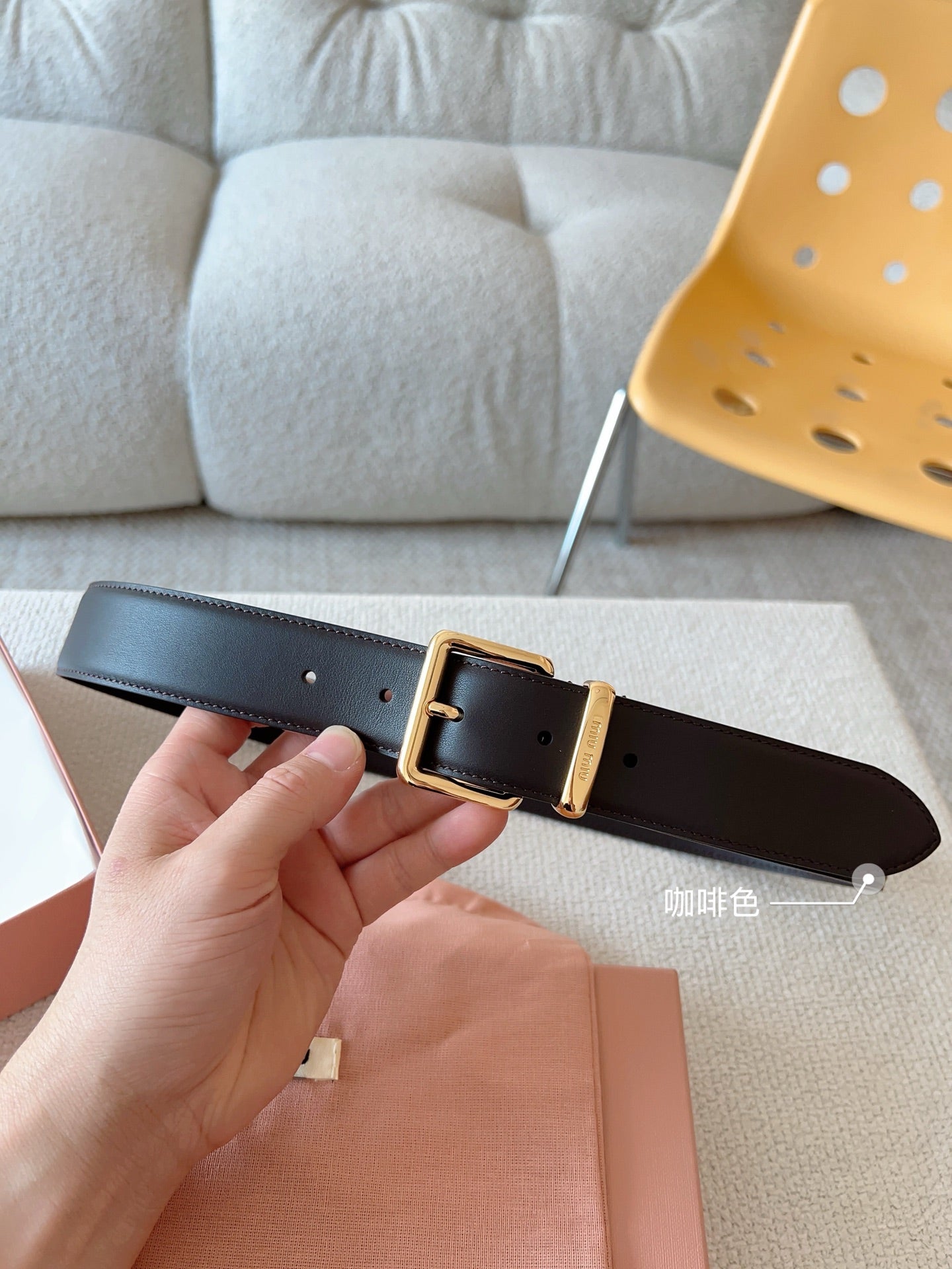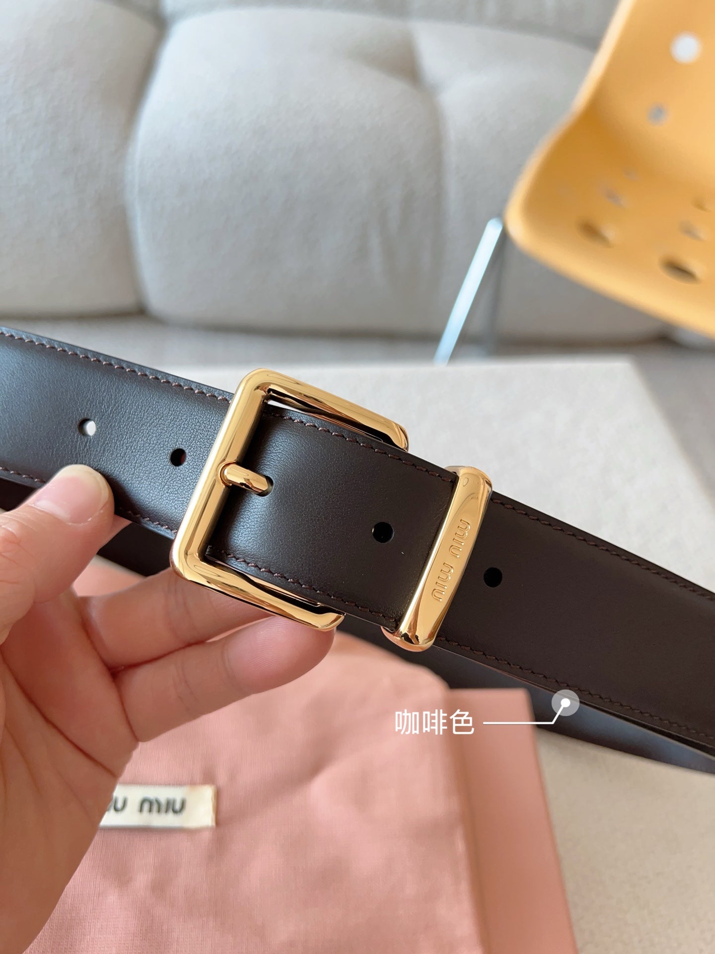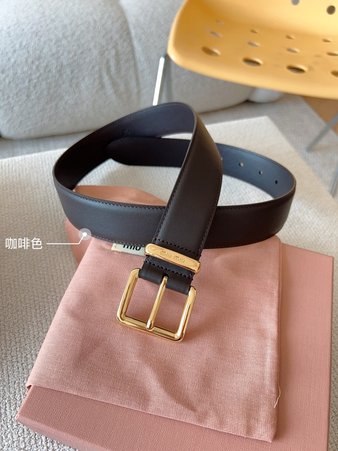 Elevate your accessory collection with the Miu Miu Classic Leather Belt. Featuring a sleek design, this belt showcases the iconic Miu Miu logo on the belt loop, beautifully complemented by metallic details. Crafted from high-quality materials, it effortlessly combines elegance with practicality. With a width of 35mm, this versatile belt is perfect for any occasion, easily pairing with both casual and formal outfits. Add a touch of sophistication to your wardrobe with this essential accessory.