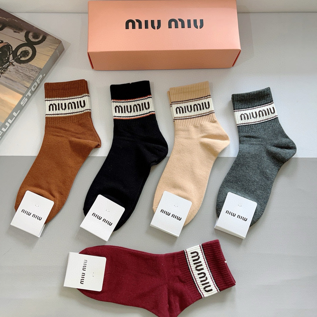 Elevate your sock collection with the Miu Miu High-Quality Mid-Calf Socks, featuring 5 pairs in a stylish box. Crafted from pure cotton, these socks are lightweight, soft, and breathable, making them a perfect choice for all seasons. Highly recommended by celebrity influencers, these socks are essential for achieving that coveted European and American streetwear look. Don't miss out on this popular accessory!