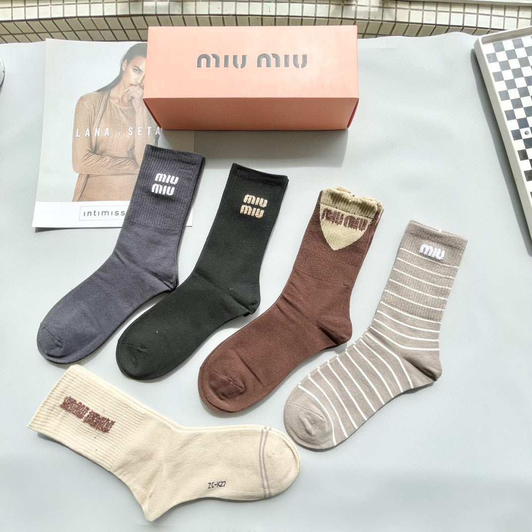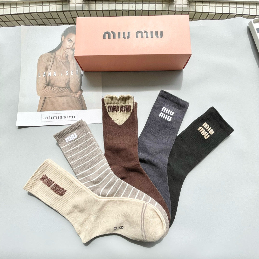 Elevate your streetwear game with the Miu Miu Luxury Cotton Socks. This premium 4-pair set comes beautifully packaged, making it a perfect gift or a treat for yourself. Crafted from pure cotton, these socks are lightweight, soft, and breathable, ensuring comfort in any season. Popularized by top influencers and featured on the Miu Miu official website, these stylish socks feature elegant jewelry lettering and are a must-have for fashion-forward individuals. Stay on trend with this essential accessory for both casual and sophisticated outfits.