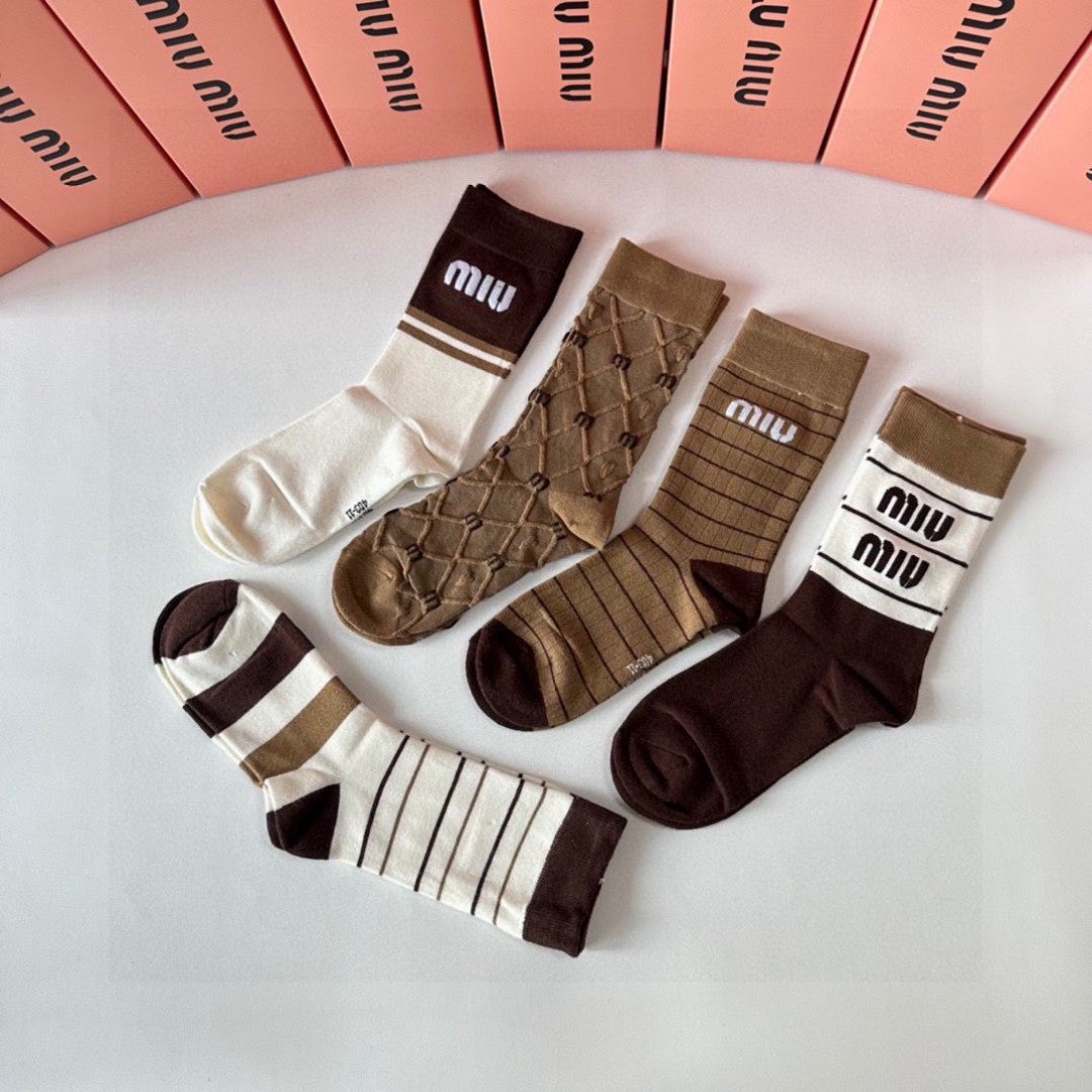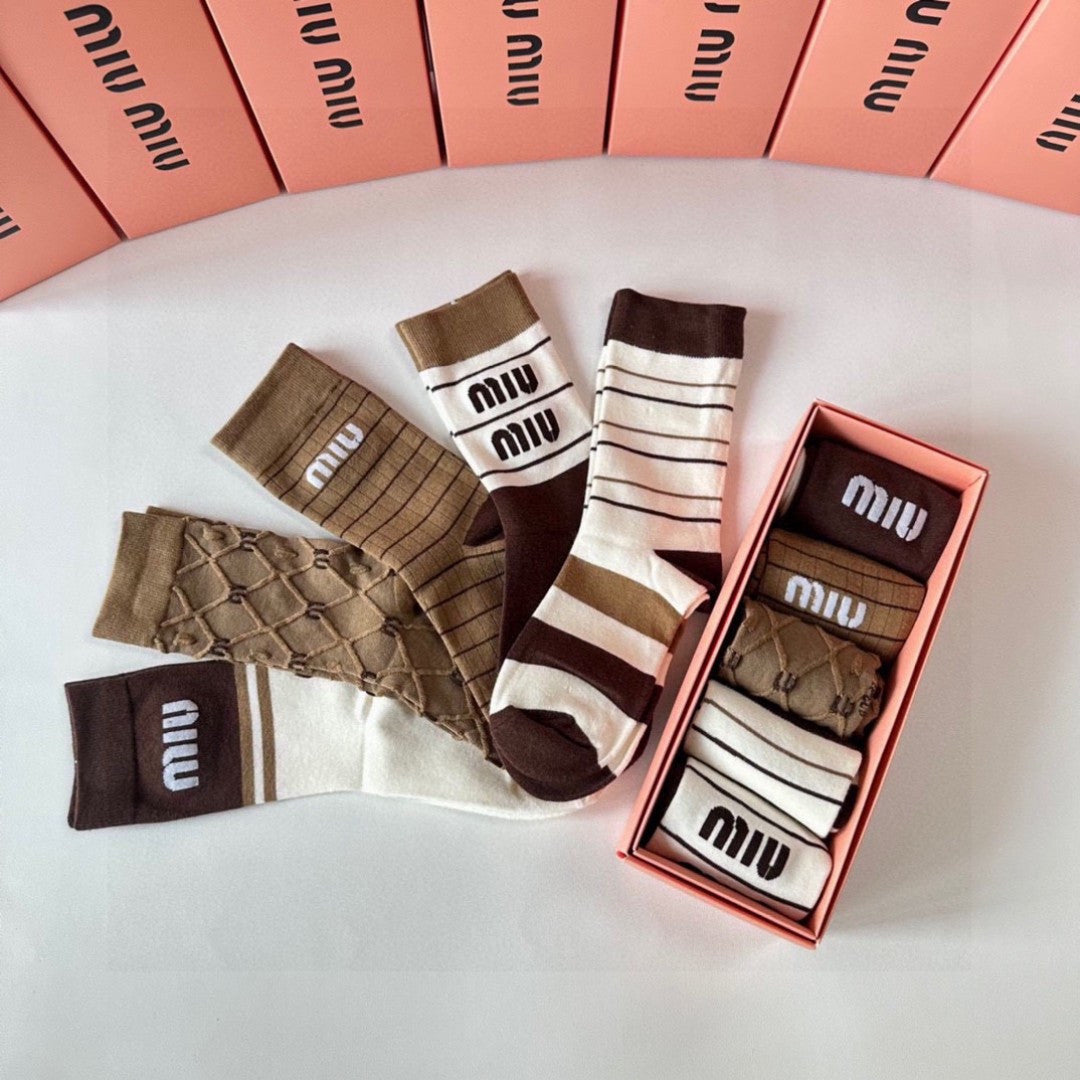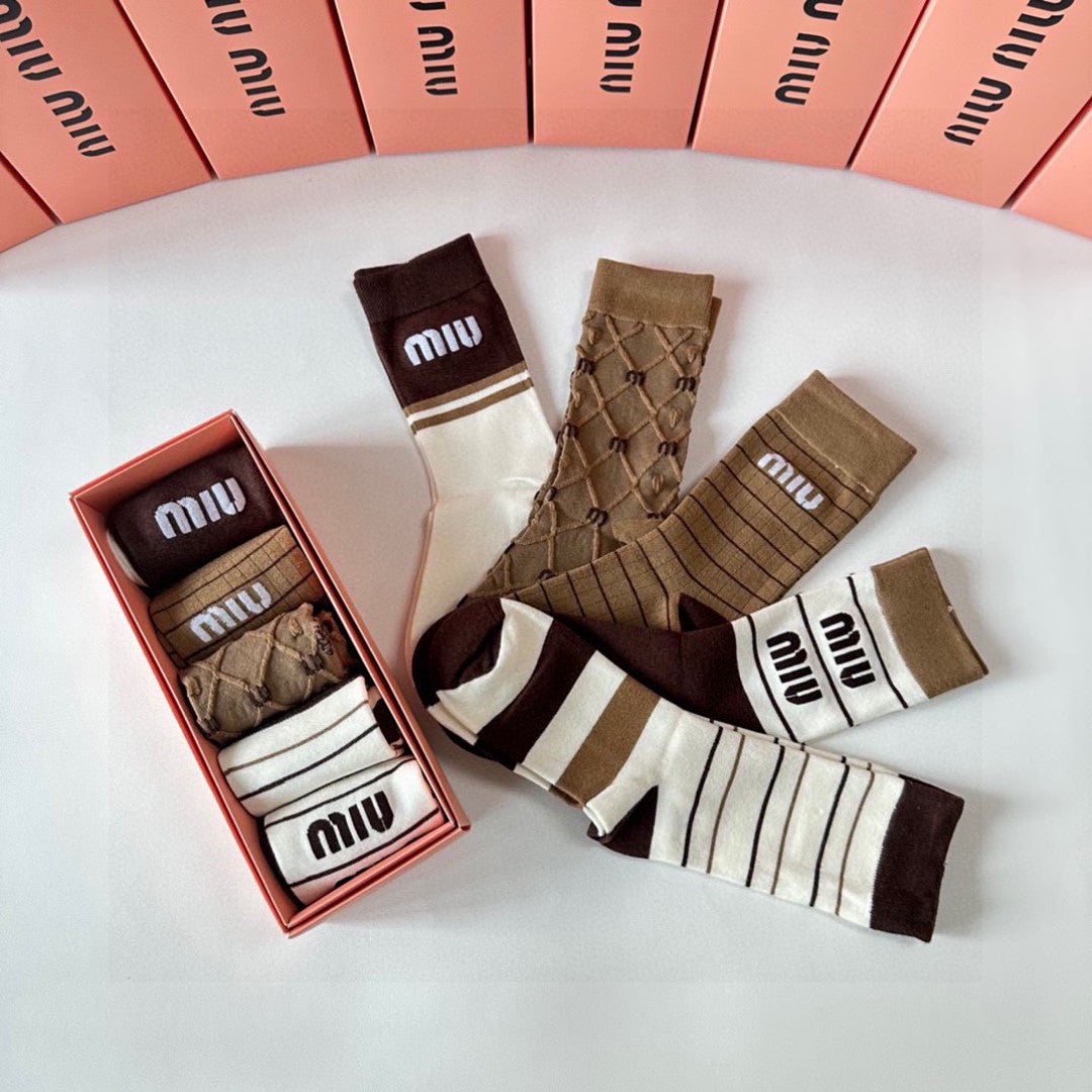 Elevate your sock drawer with MiuMiu's new mid-length sock set, featuring five stylish pairs packaged in a chic counter display. Designed for effortless coordination, these synchronized tube socks are perfect for fashion enthusiasts seeking to make a bold statement. Ditch the ordinary and embrace a fresh look with these must-have accessories that complement various outfits. Ideal for everyday wear or as a trendy gift, these socks are both versatile and fashionable. Upgrade your style with MiuMiu today!