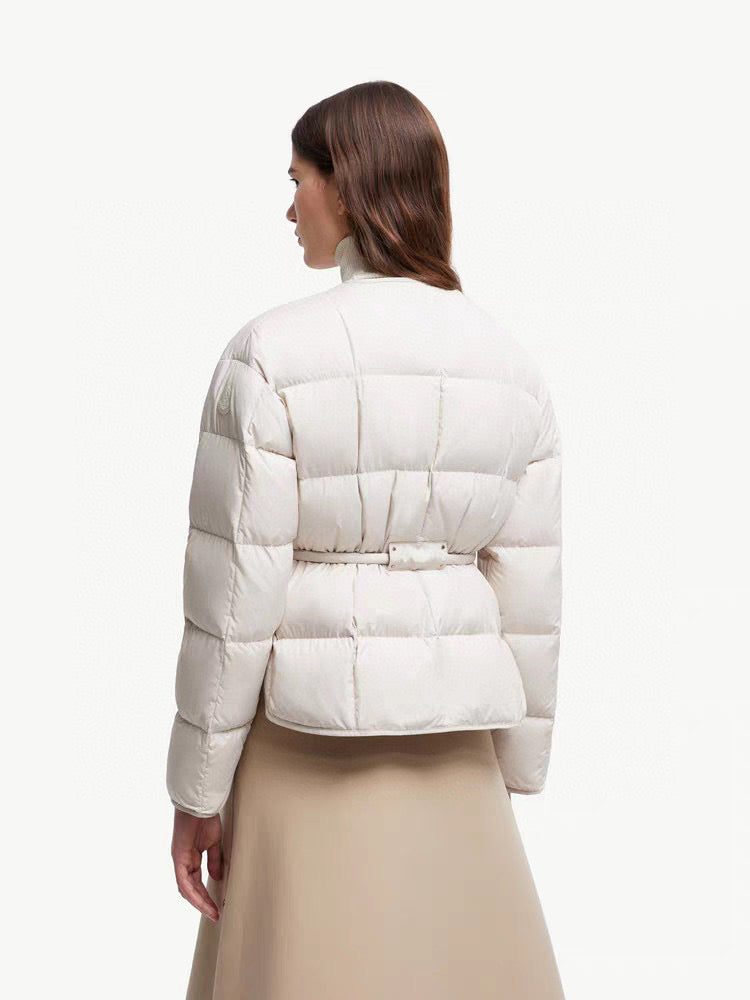 - **Minimalist Detailing:** A round neck design elegantly hugs the neckline, complemented by metallic gold buttons that provide a striking contrast to the plush down filling, embodying understated luxury.