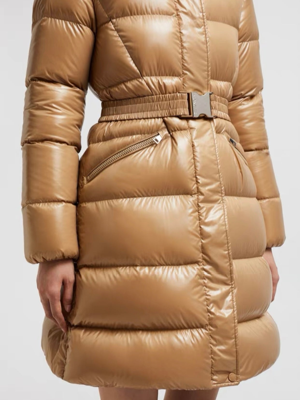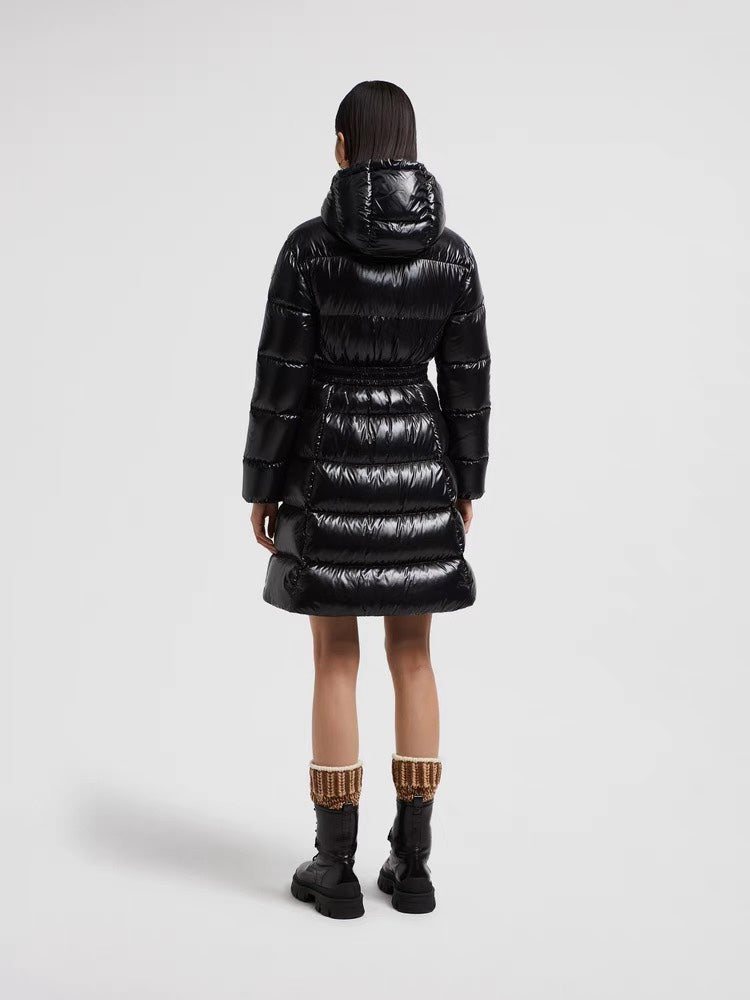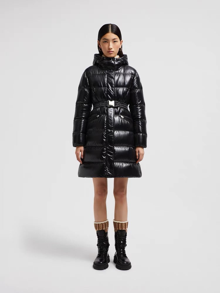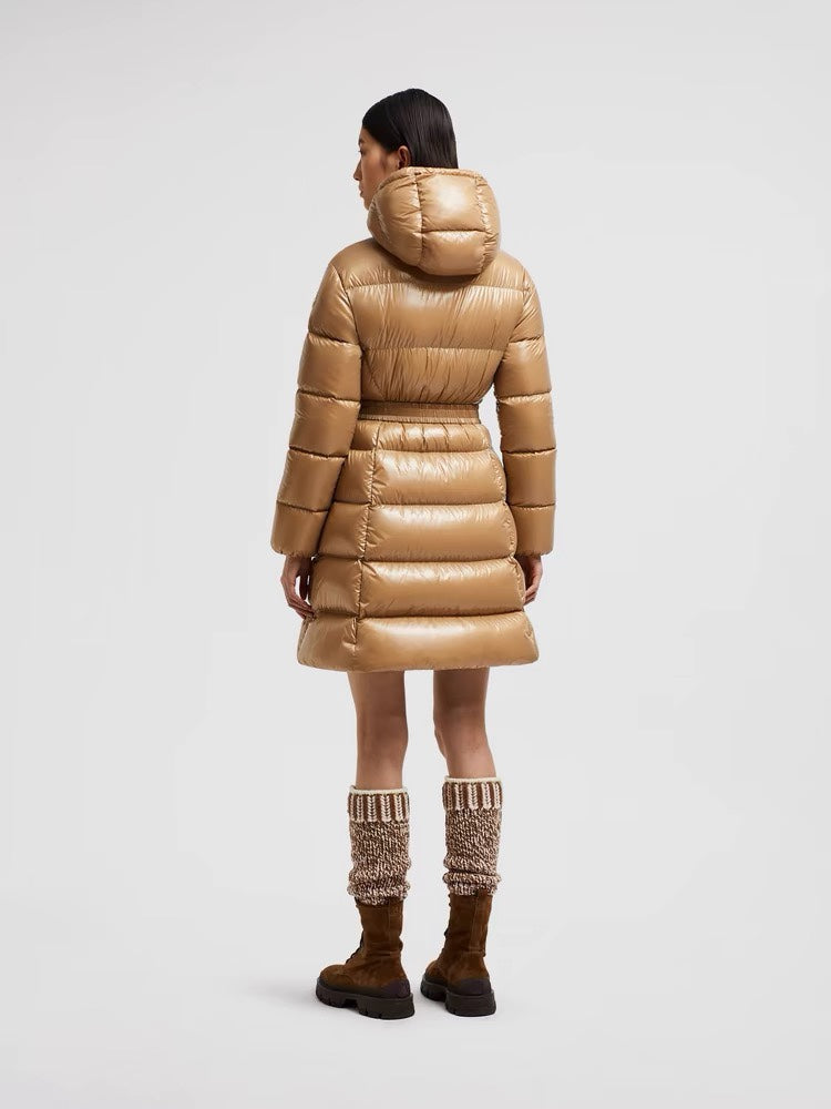 Discover the elegance and warmth of the Moncler Bellevue Women's Long Down Jacket, crafted from the iconic nylon laqué fabric that defines Moncler’s signature style. This luxurious winter essential features a long design for maximum coverage and a hood for added protection against the elements. The jacket is designed with a feminine silhouette and an adjustable elastic waistband, allowing for a flattering fit that transitions seamlessly from day to night, whether you are in the city or exploring the mountains. Available in classic colors black and camel beige, and in sizes 0, 1, 2, and 3. Stay stylish and warm this winter with Moncler's impeccable craftsmanship.