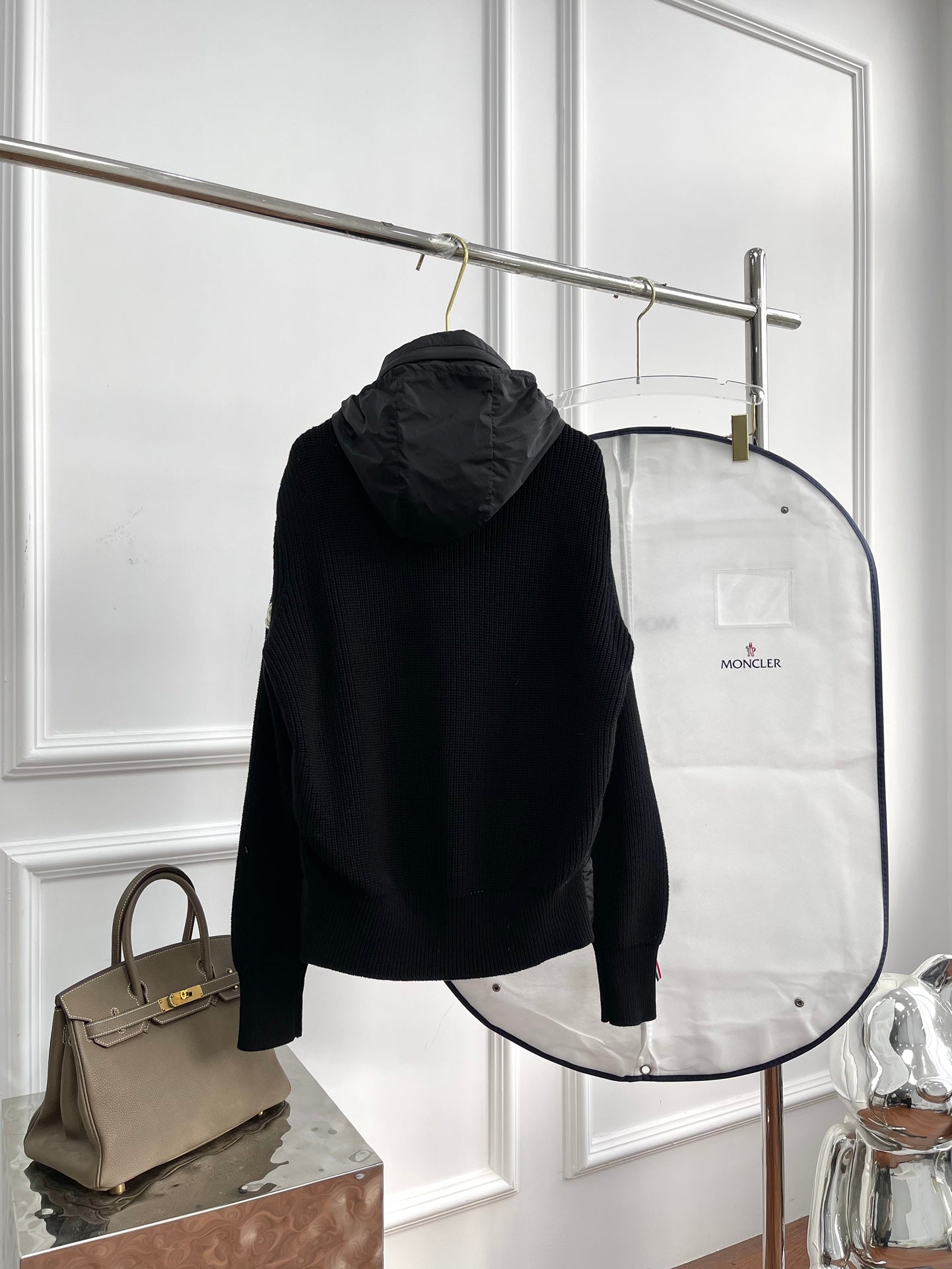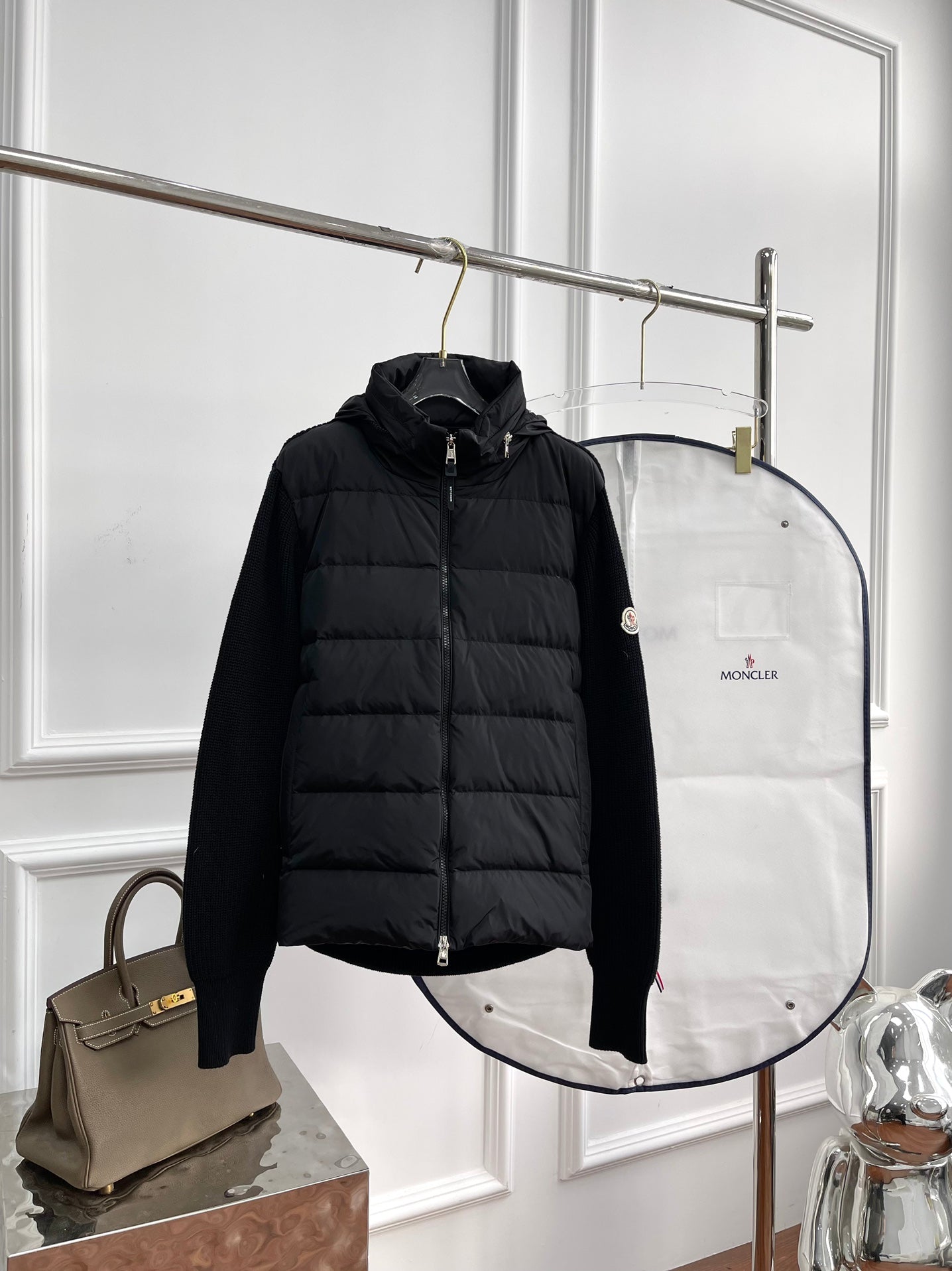 Elevate your autumn and winter wardrobe with our Moncler Knitted Splicing Down Jacket. This stylish jacket features a short stand-up collar design with a hidden hood, making it both functional and fashionable. The snap button pockets on either side offer practicality, providing a secure place for your phone, keys, and other essentials while maintaining a sleek appearance.