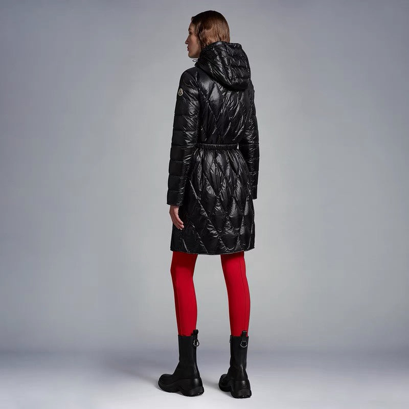 Designed for versatility, this jacket is perfect for various occasions, combining a smooth, shiny texture with a fashionable silhouette. The large-tooth zipper closure adds a modern touch while providing windproof protection. Iconic Moncler logo patches on the sleeves enhance its sophisticated appeal, while the adjustable belt beautifully defines your waist, enhancing your overall look.