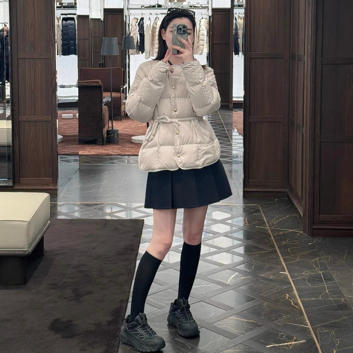 - **Chic Details:** The round neck and metallic gold buttons add a touch of sophistication, striking a perfect balance between soft down and cold metallic accents.