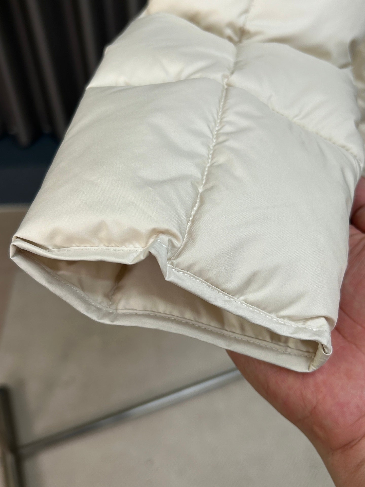 - **Minimalist Details:** Featuring a round neck that complements the neckline and metallic gold buttons for added elegance, this jacket pairs a cool metallic texture with the softness of down for understated luxury.