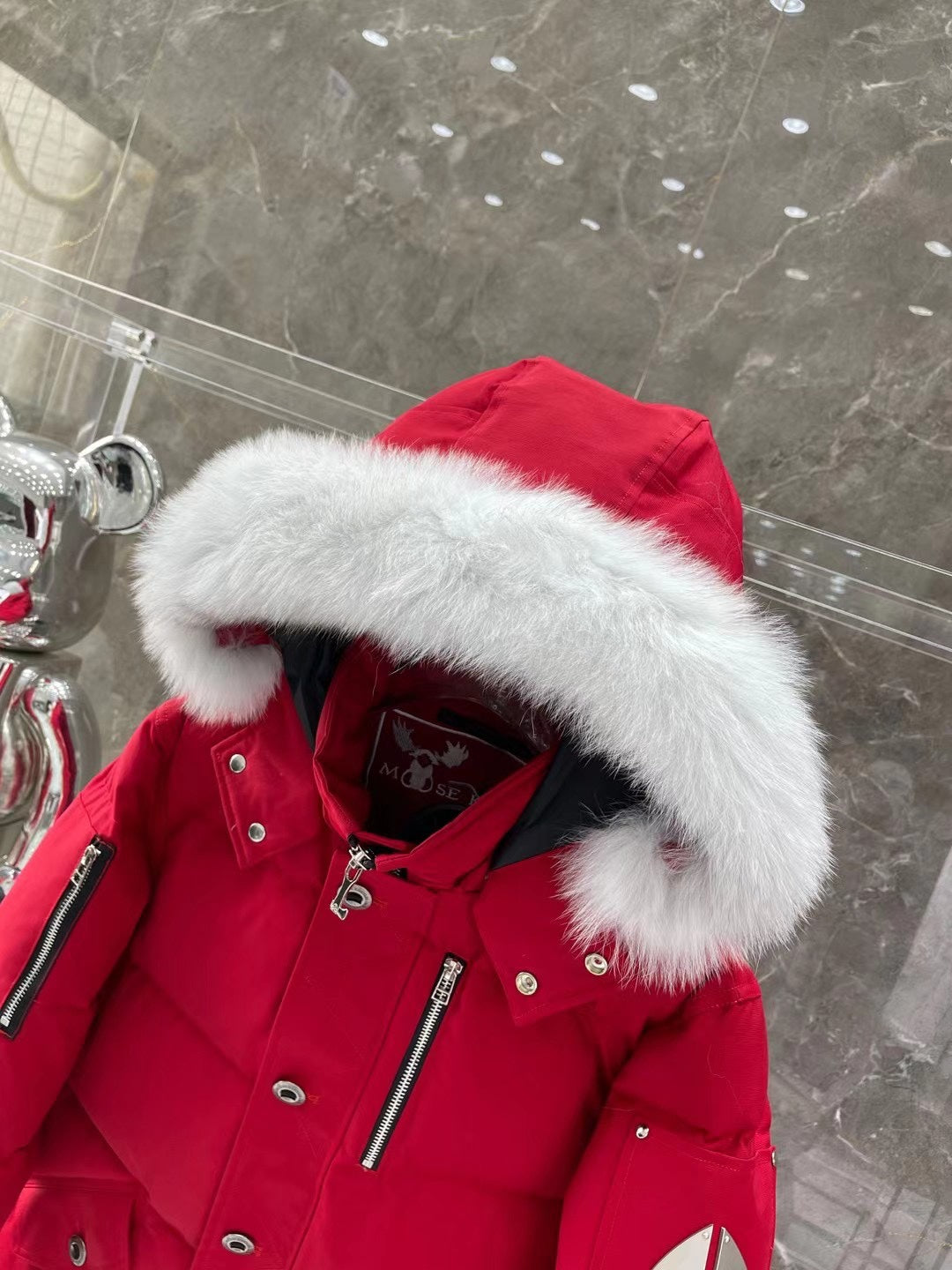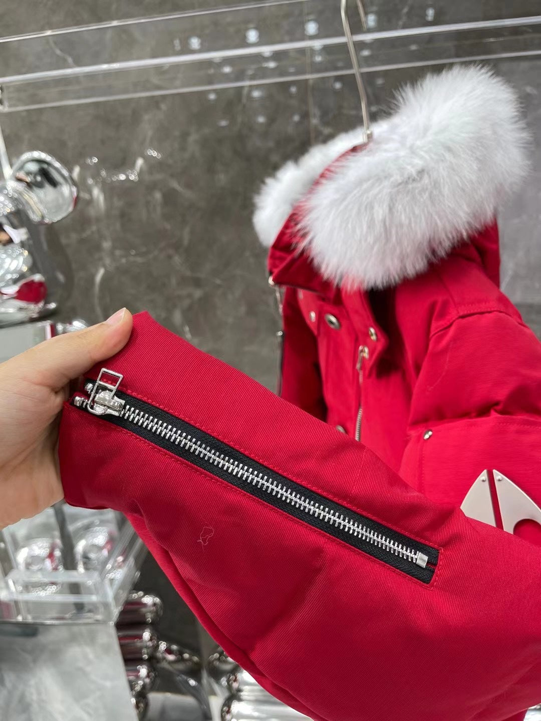 Stand out with the unique rounded metal scissors logo, a mark of creativity and personality. The zipper is crafted with Japan's renowned YKK technology, ensuring durability and ease of use. Enhanced with an Arctic silver fox fur collar, this jacket offers a touch of luxury, with the option to choose between black and white collar fur.