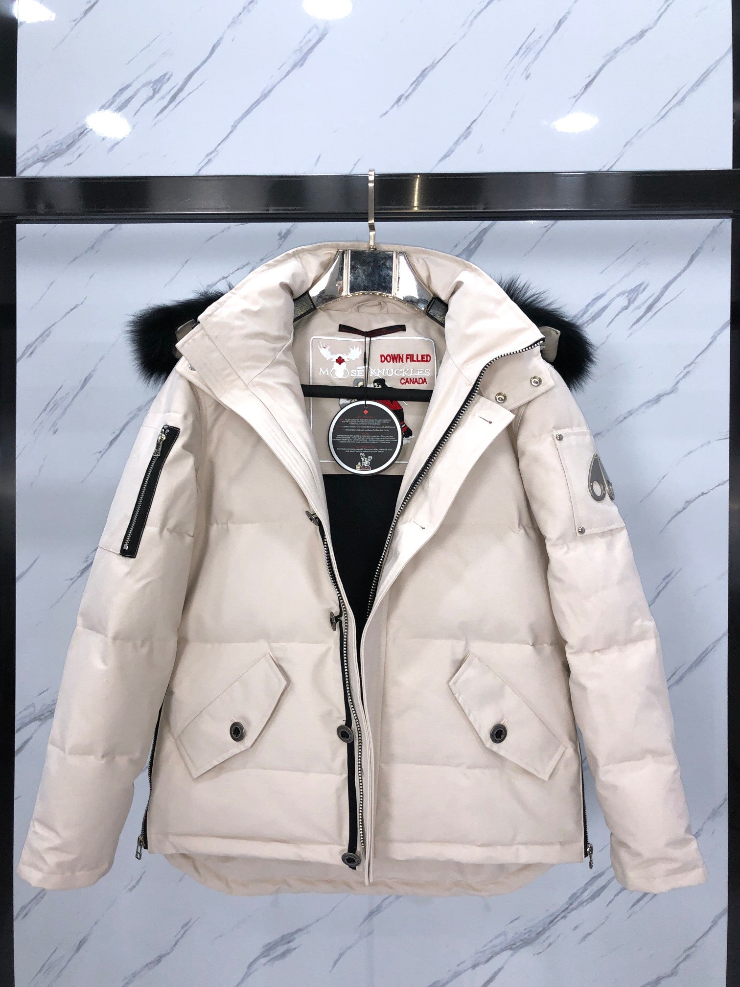 Featuring a luxurious Arctic silver fox fur collar available in black or white, this jacket offers versatility and style. The distinctive rounded metal scissors logo embodies the edgy yet sophisticated essence of Moose Knuckles, making it a favorite among international celebrities and a must-have for trendsetters.