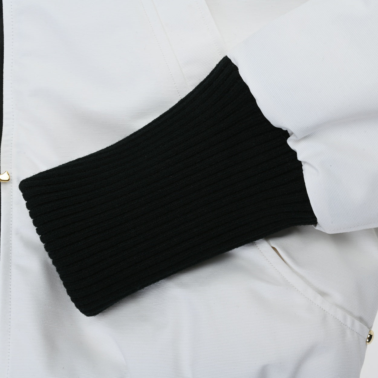 The jacket boasts a robust gold brass YKK front zipper, known for its waterproof, anti-freeze, and anti-rust properties. With a fill power of 650CC filled with 80/20 down, it provides exceptional insulation while being lightweight. Custom-woven, elasticized cuffs ensure a snug fit for added protection against the elements.