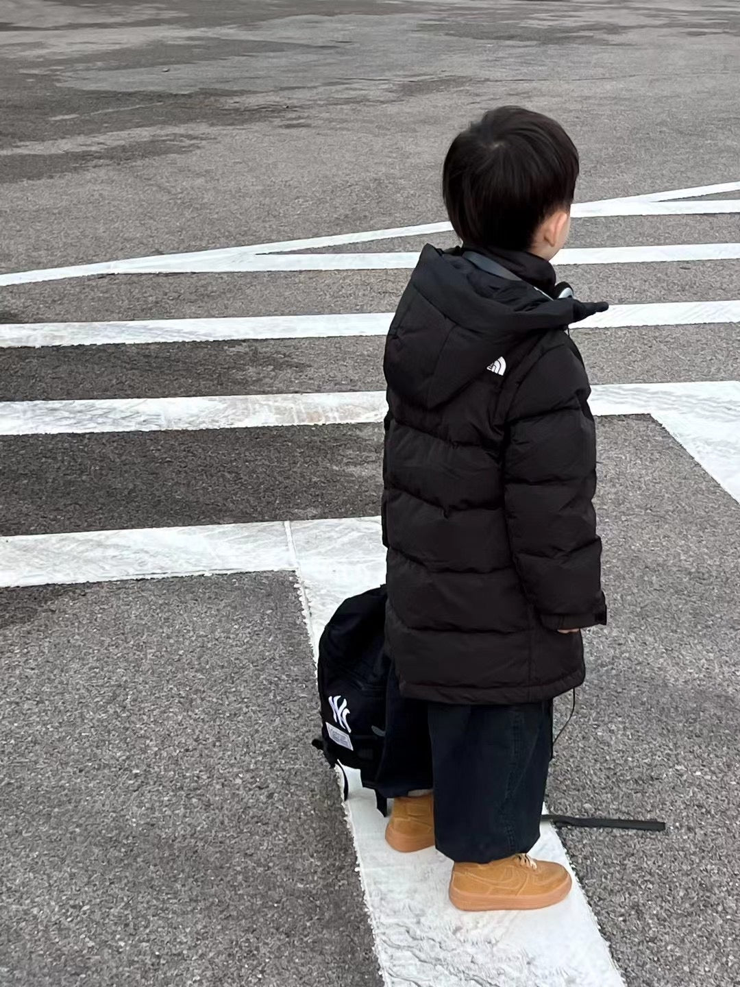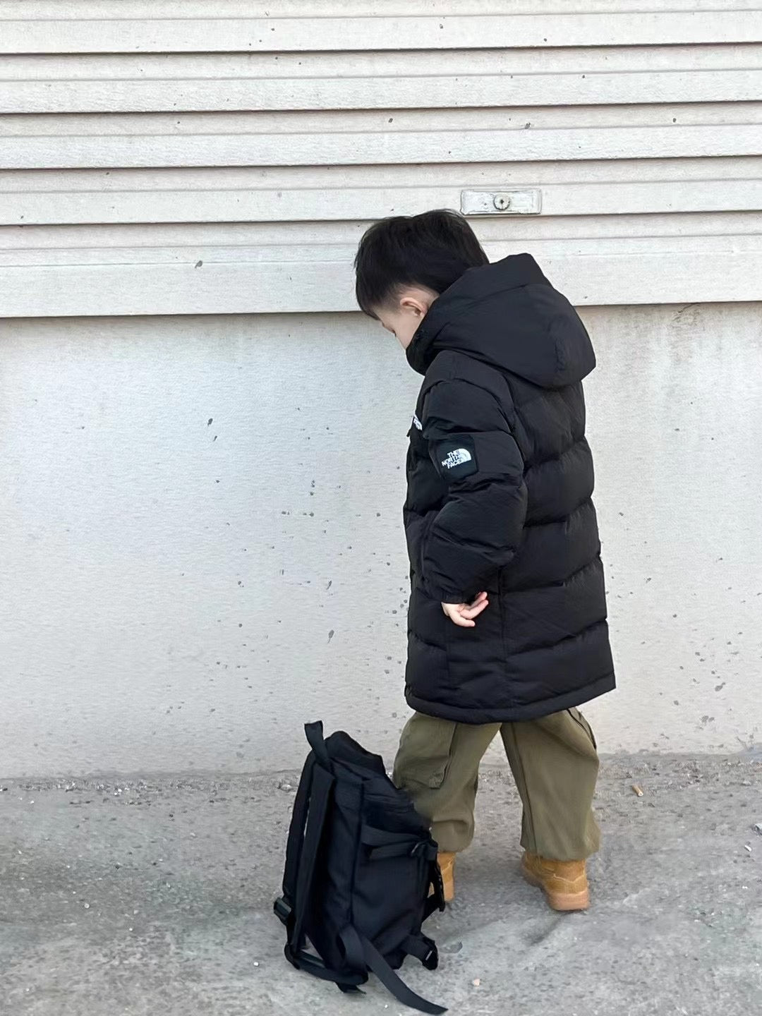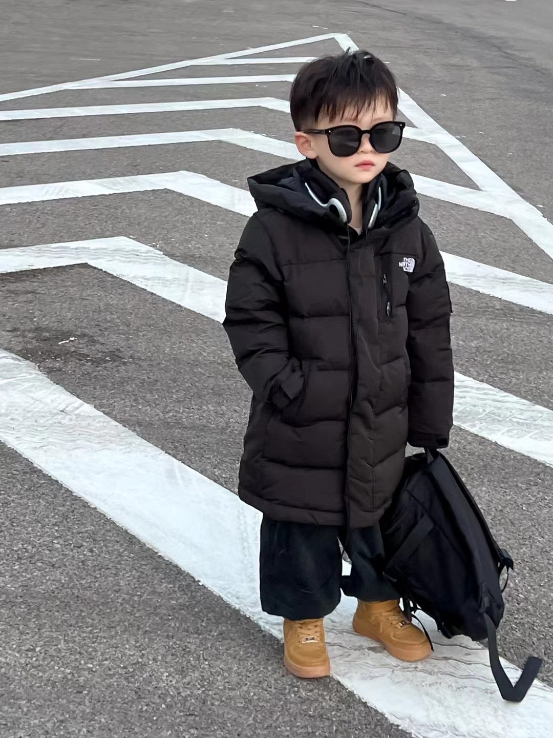 Discover the North Face Children's Long Down Jacket, a must-have for winter. Designed to keep your child stylish and warm, this jacket features an above-the-knee length that offers great coverage without bulk. The non-detachable hood and stand-up collar provide double insulation and ensure a cozy, windproof experience. The collar is lined with soft velvet for a skin-friendly touch.