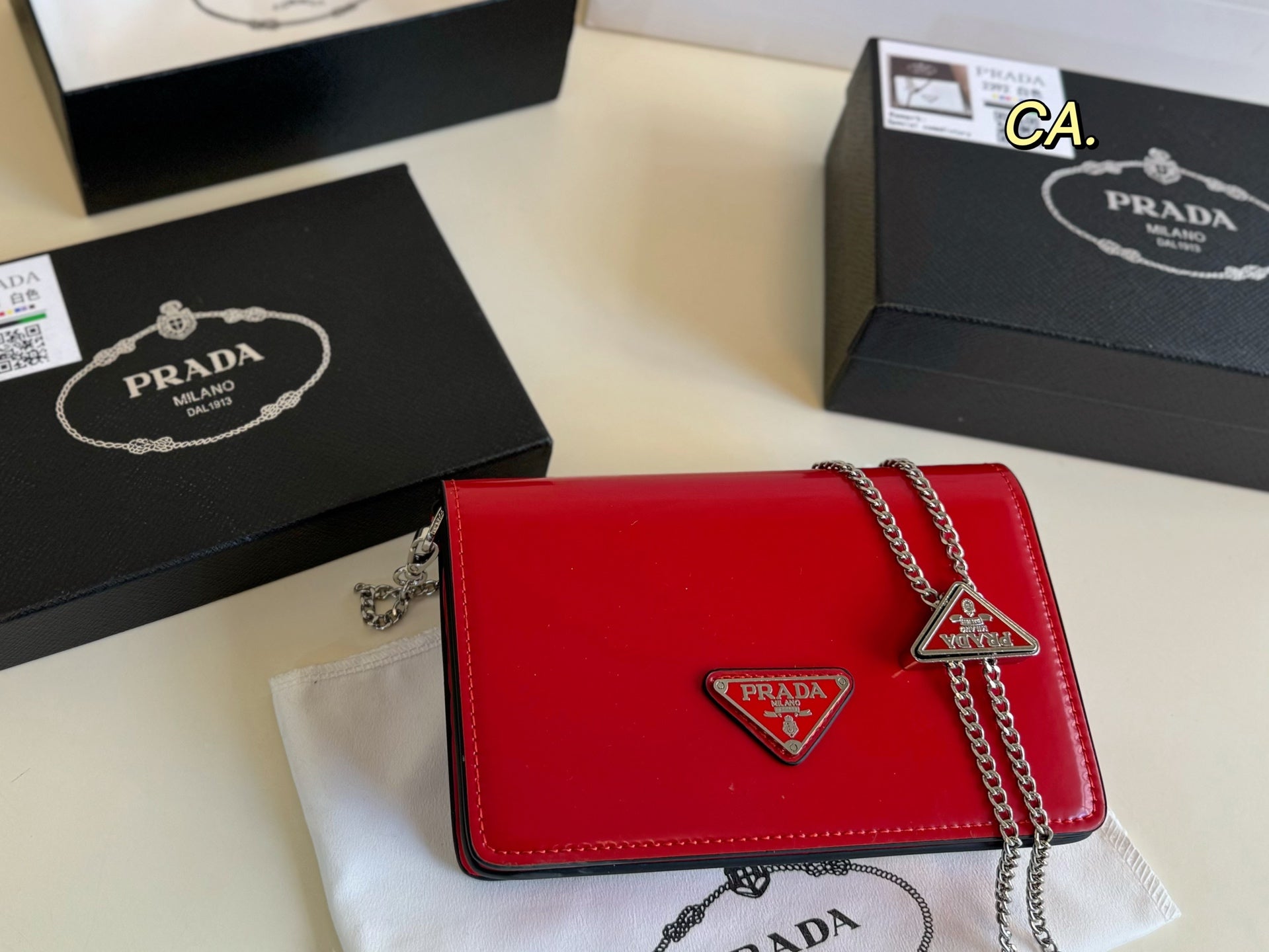 Introducing the PRADA Chain Single Shoulder Crossbody Bag, designed for the modern fashionista. Featuring a chic triangle logo and a unique shrink chain detail, this bag effortlessly combines elegance and functionality. Crafted from premium glossy leather, it boasts a minimalist silhouette that adds a touch of sophistication to any outfit. Lightweight and comfortable, it's perfect for day-to-night wear. Experience exquisite style and versatility in one beautiful accessory.