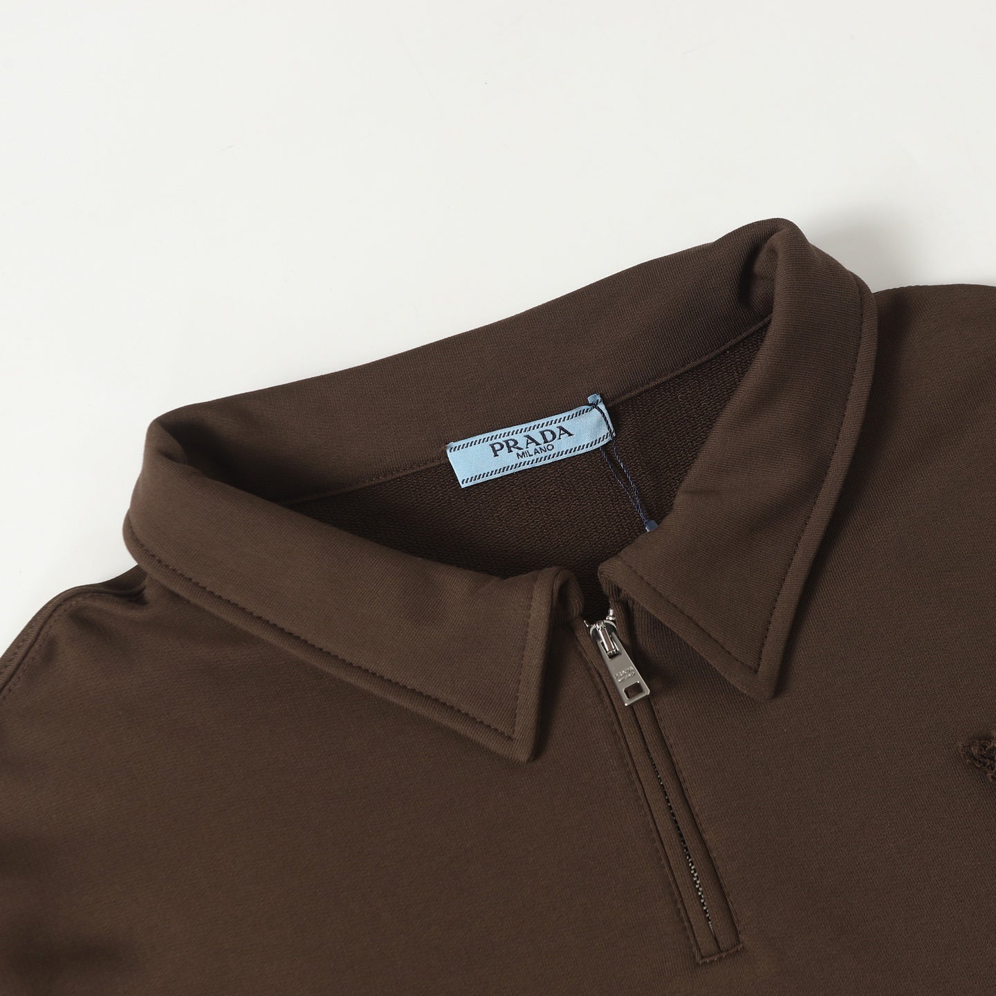This sweatshirt seamlessly merges classic lapel design with sporty leisure elements. The half-zip closure, set below the bust line, adds a modern twist, creating a stylish V-neck layered look when unzipped. Available in sizes S, M, L, and XL, this versatile sweatshirt is perfect for both casual outings and relaxed gatherings. Embrace comfort and style with this distinctive PRADA sweatshirt, designed for those who appreciate quality and sophistication.