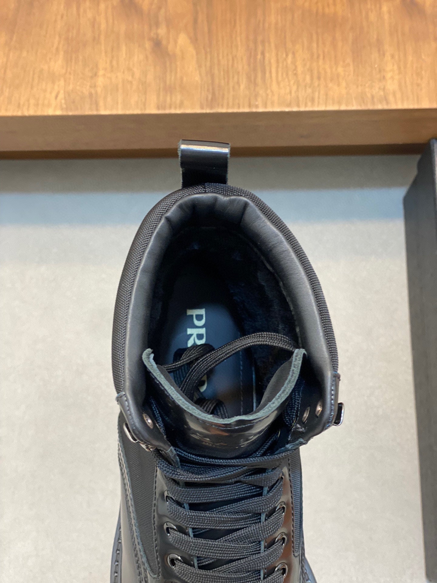 Step into the season with PRADA's latest ultra-light wool short boots for men, perfect for autumn and winter. Crafted from a unique two-tone blue nylon and cowhide leather, these boots feature stylish eyelets and metal hooks, complemented by the iconic enameled triangle metal logo.