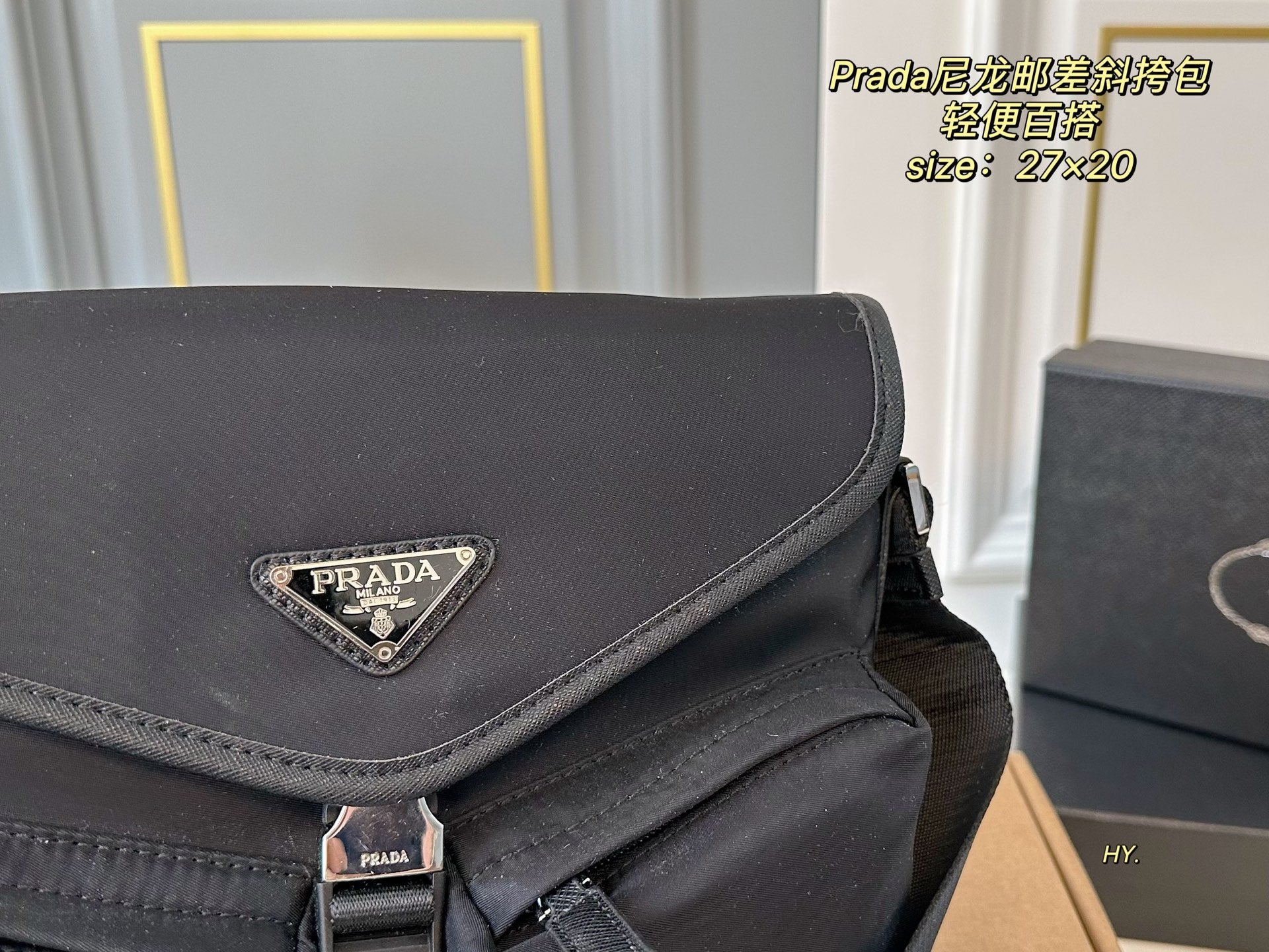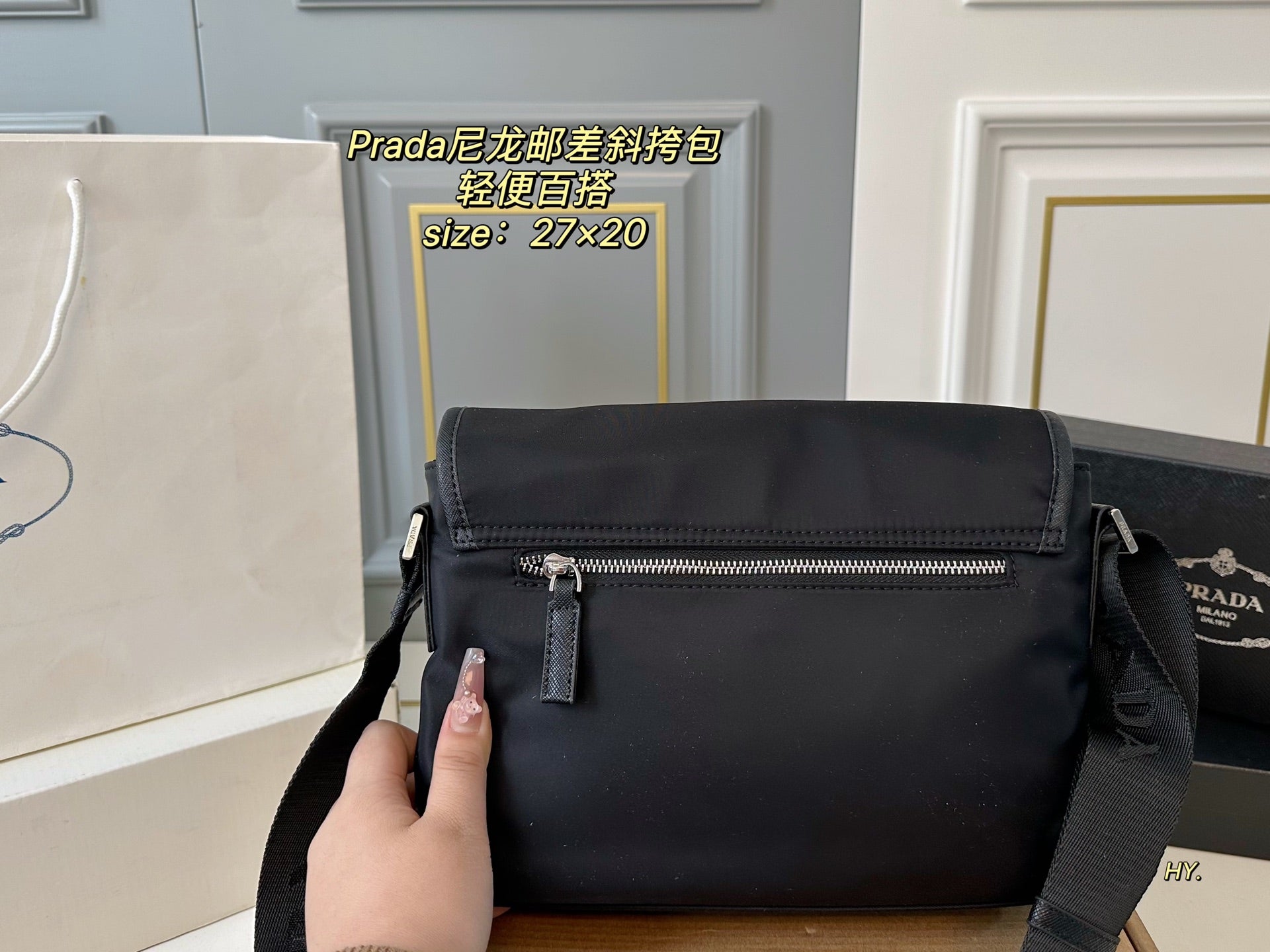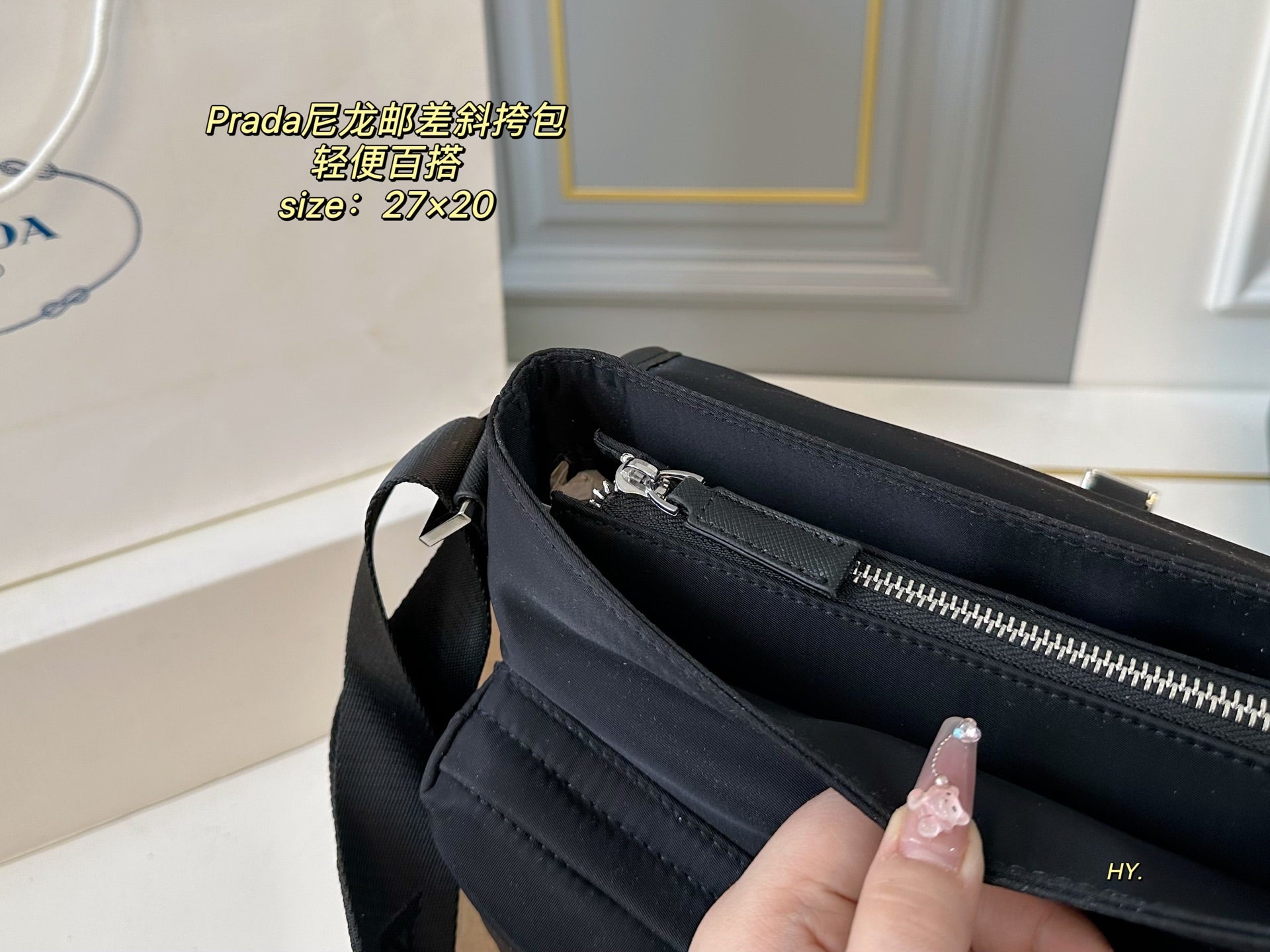 Introducing the Prada Nylon Messenger Bag, a perfect blend of style and functionality. Measuring 27×20 cm and presented in an elegant box, this lightweight and waterproof bag features a sleek black and silver color scheme that exudes a high-end aesthetic.