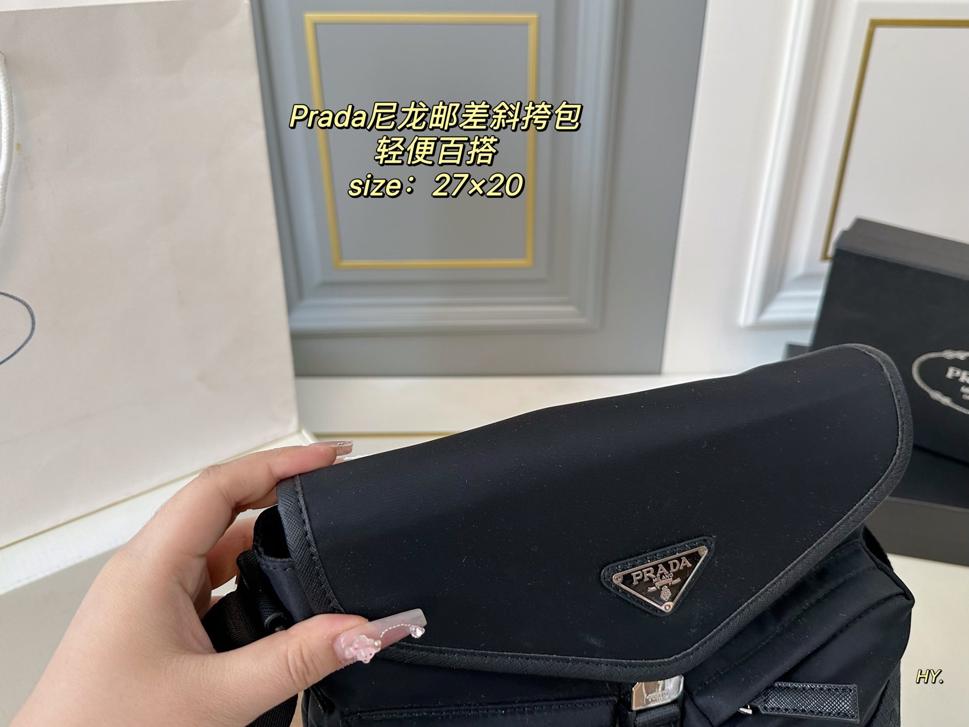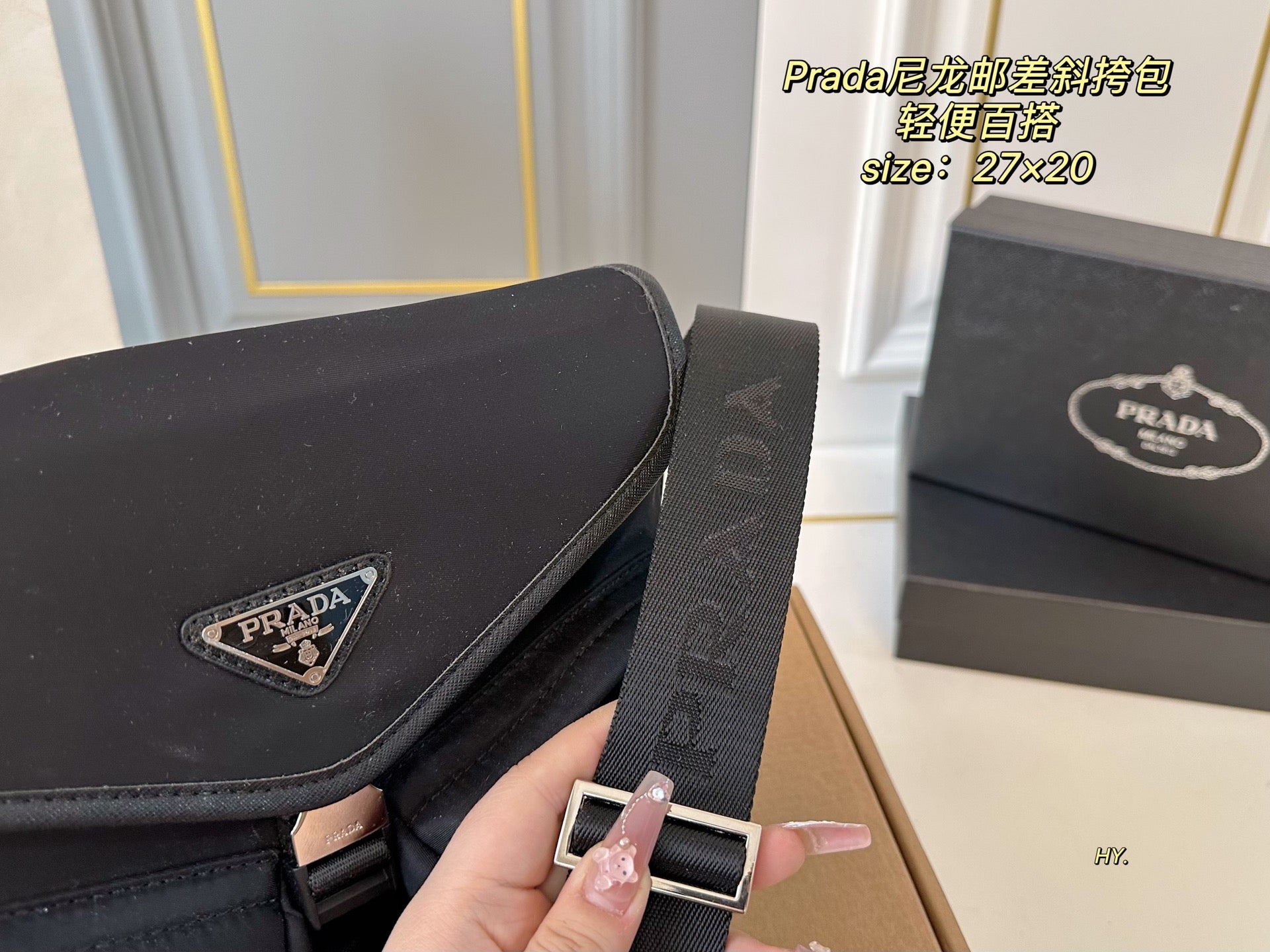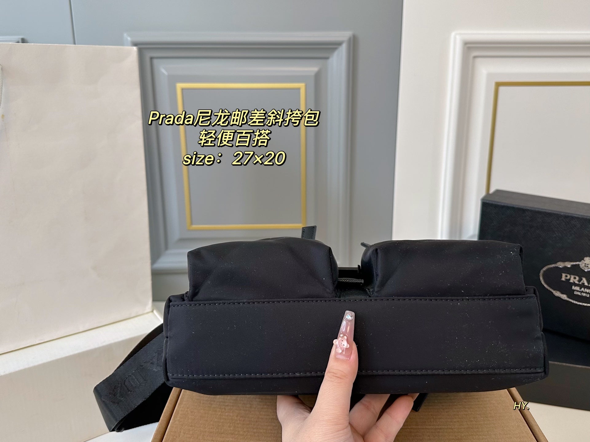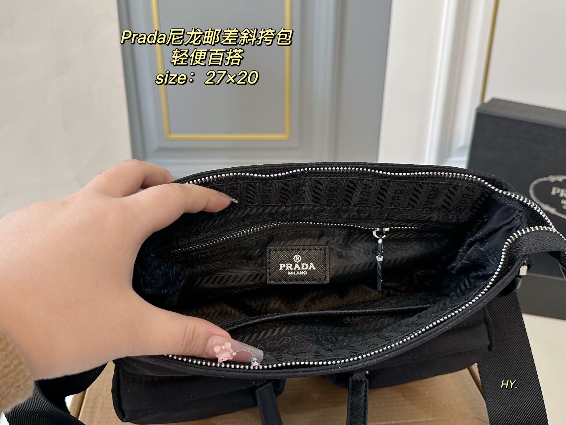 Introducing the Prada Nylon Messenger Bag, a perfect blend of style and functionality. Measuring 27×20 cm and presented in an elegant box, this lightweight and waterproof bag features a sleek black and silver color scheme that exudes a high-end aesthetic.