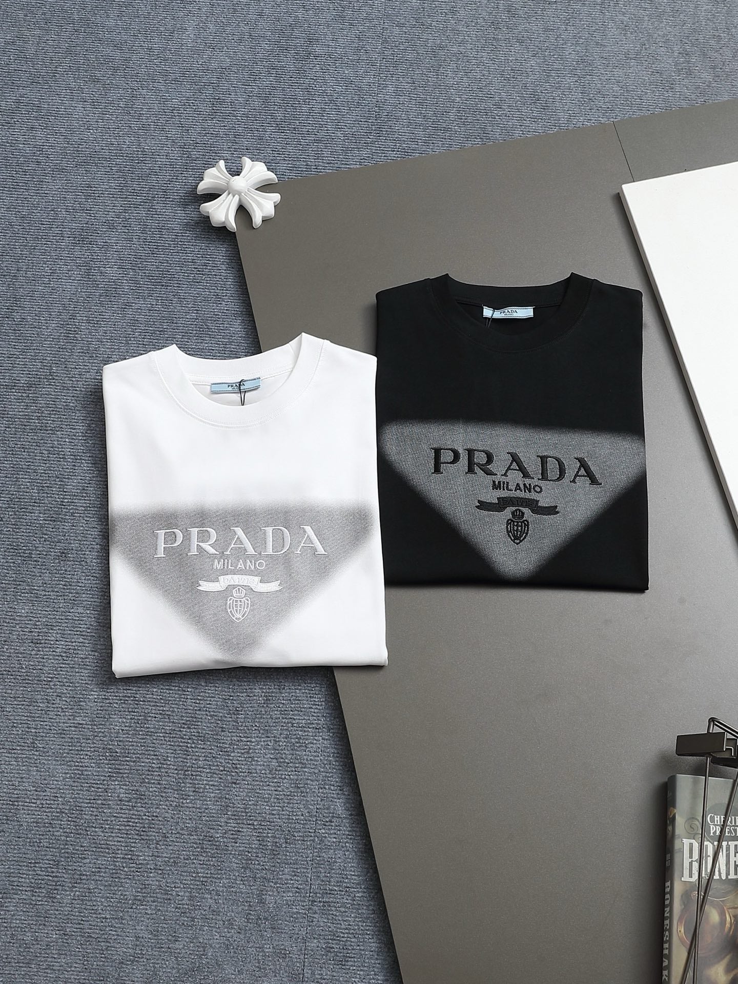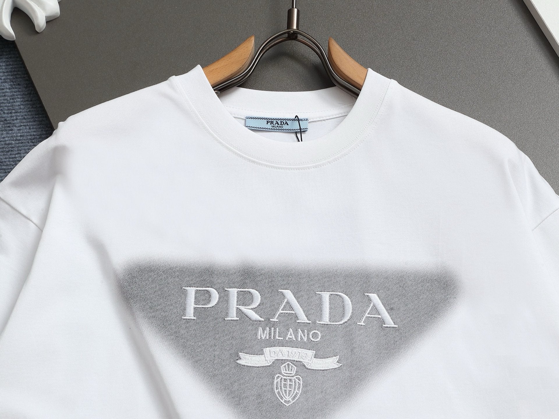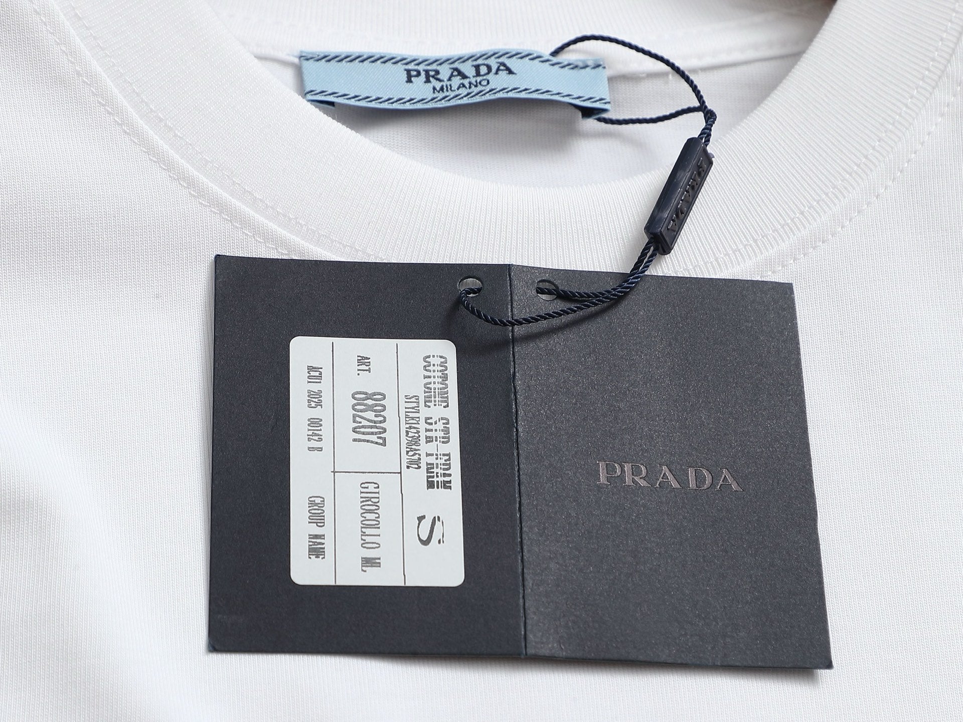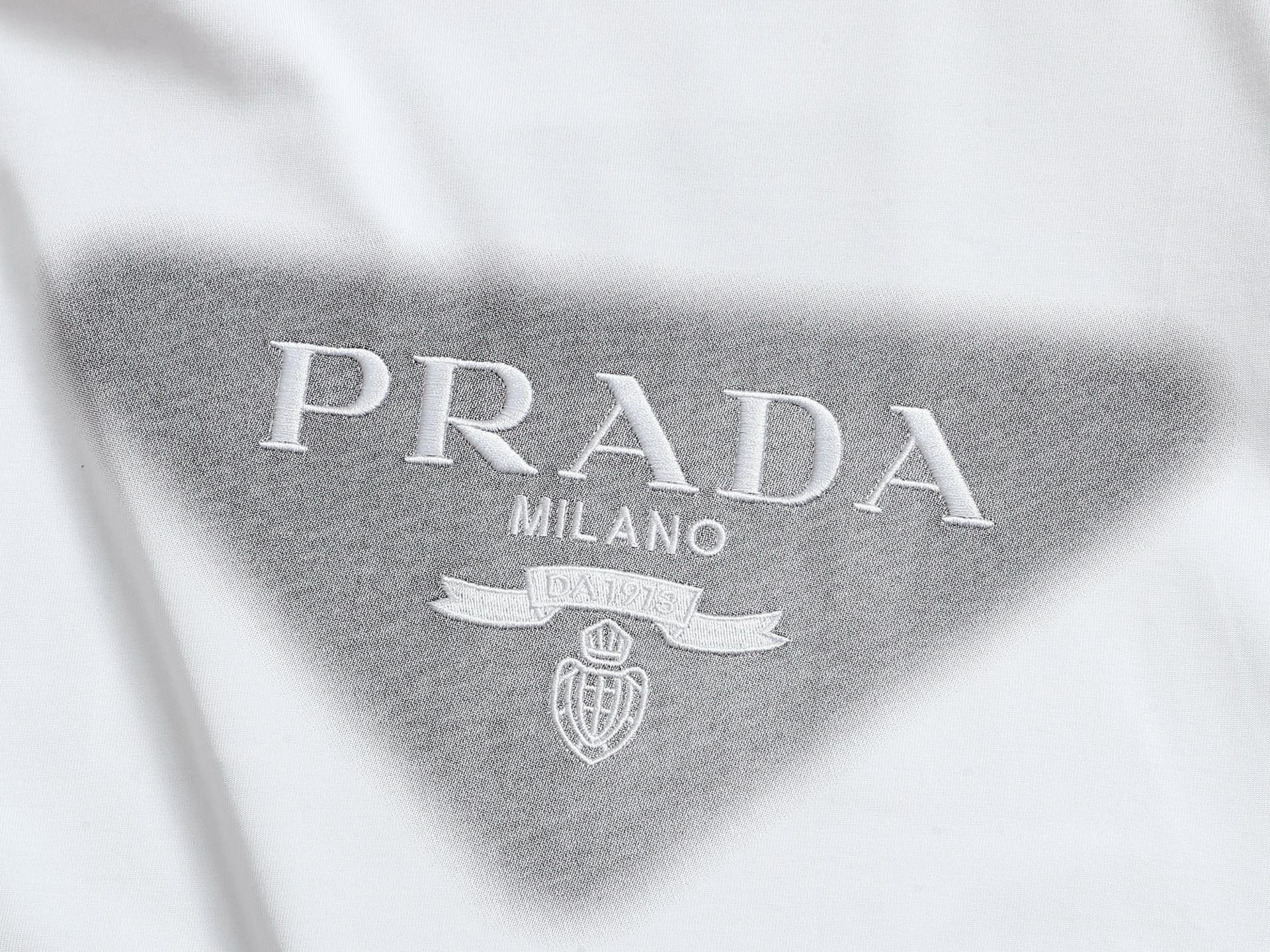 Elevate your wardrobe with the PRADA Round Neck Short-Sleeved T-Shirt. Crafted from premium original fabric, this stylish tee features intricate embroidery and a distinctive inkjet triangle logo design that enhances its contemporary appeal.