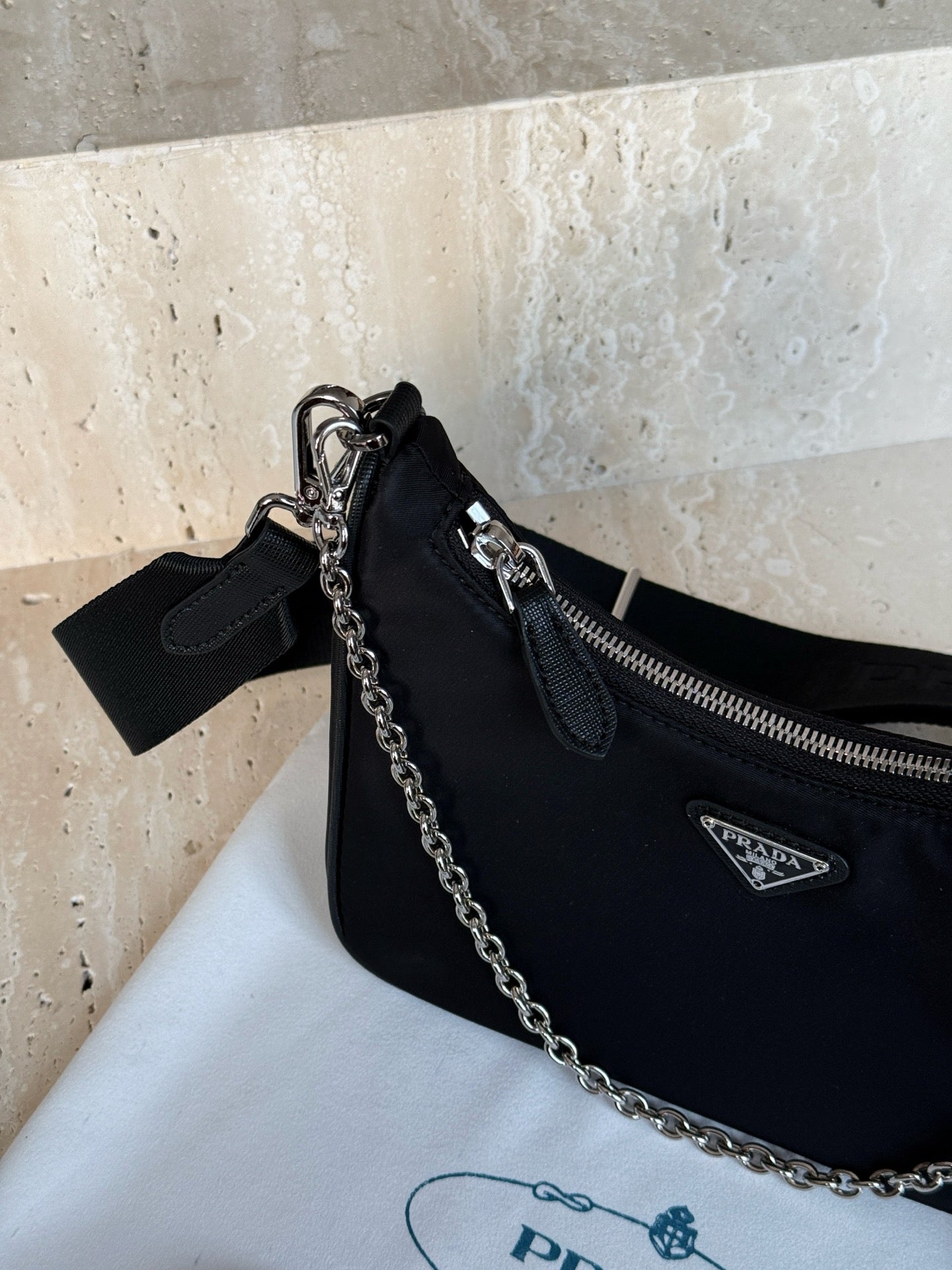Discover the ultimate in versatility with the Prada Hobo Bag Three-in-One set. This premium collection includes a spacious large bag (21x12cm) reminiscent of a stylish dumpling bag, along with a chic small bag (9x6cm). Designed for comfort and style, this set features a wide shoulder strap and a trendy chain, allowing for multiple styling options to suit any occasion. Perfect for fashion-forward individuals, this bag set enhances your wardrobe while providing unmatched quality. Please note: Export orders available to South Korea. Elevate your accessory game with this luxurious, multifunctional piece!