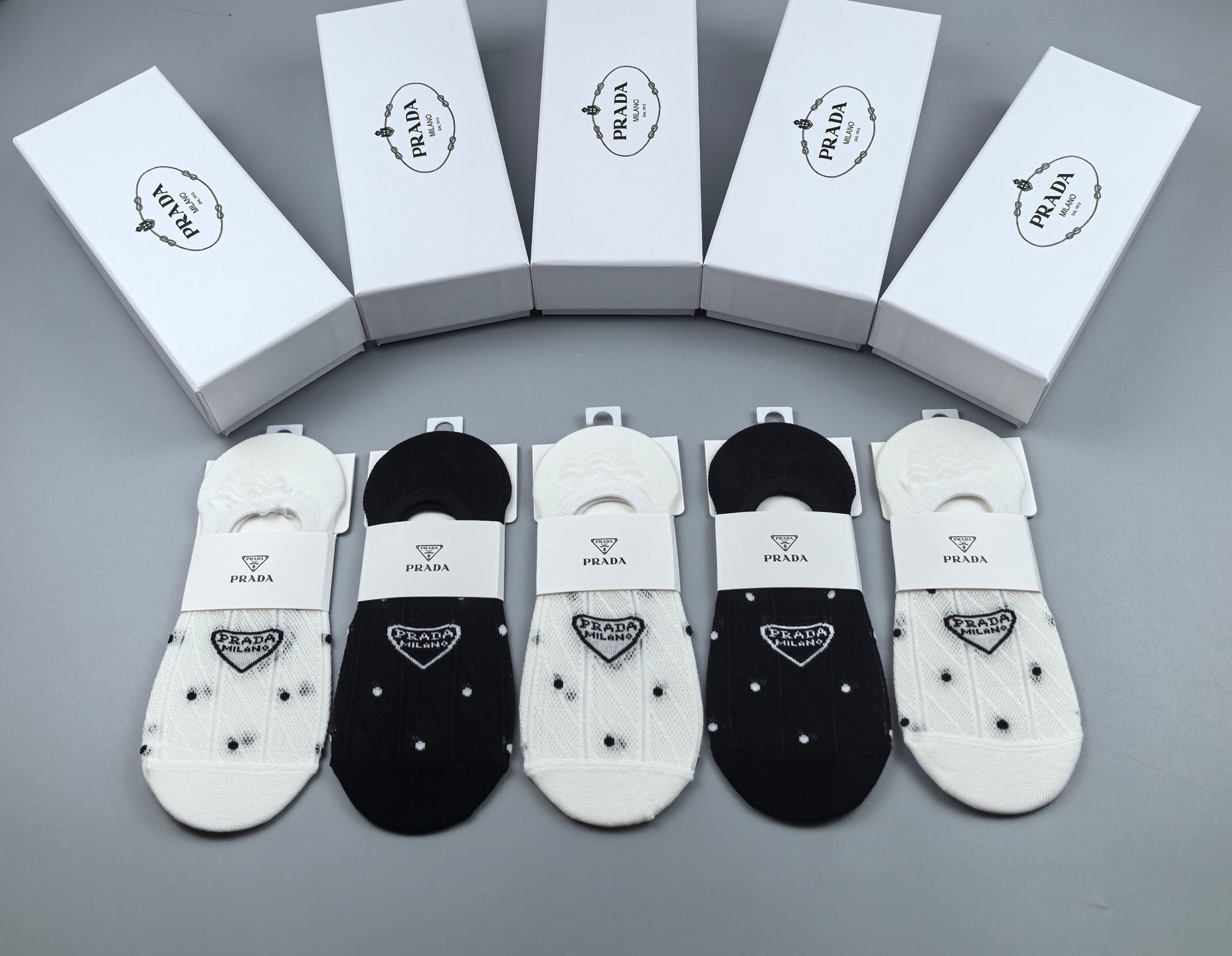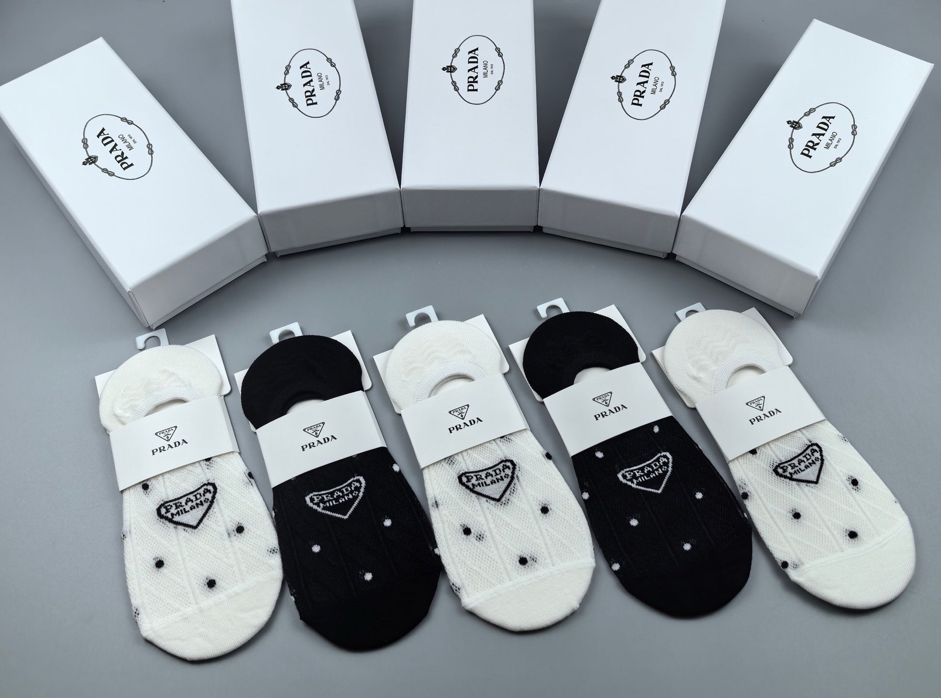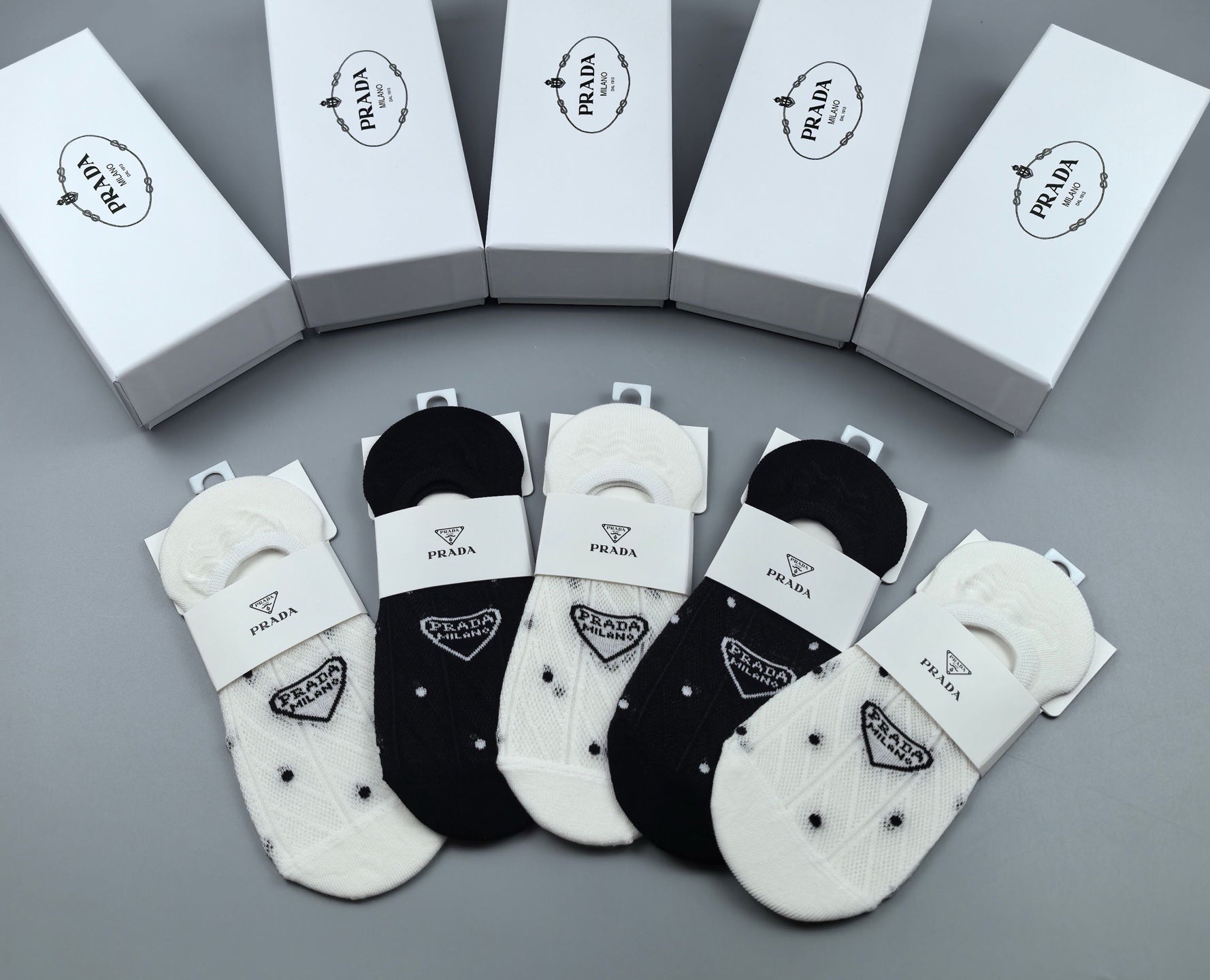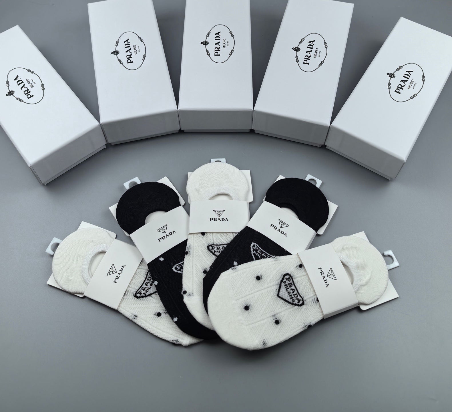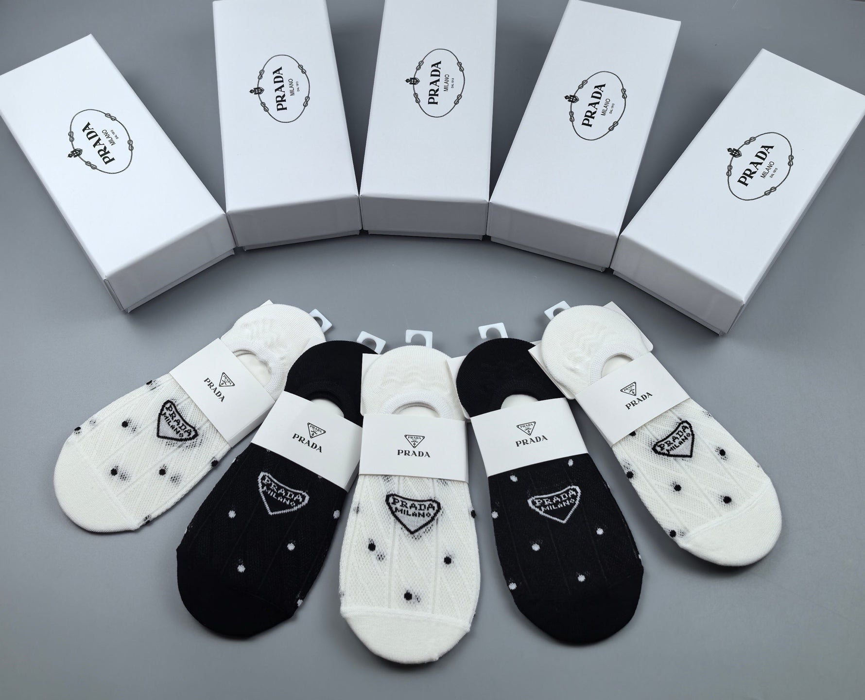 Discover luxury and comfort with our new Prada women's invisible socks. This set includes five pairs, beautifully packaged in a stylish box. Crafted from pure cotton, each pair features a jacquard classic logo that combines elegance with everyday wearability. These socks are designed for seamless style, perfect for any fashionista seeking to enhance their wardrobe. Easy to mix and match, these invisible socks are an essential addition to your collection. Elevate your sock game with Prada today!