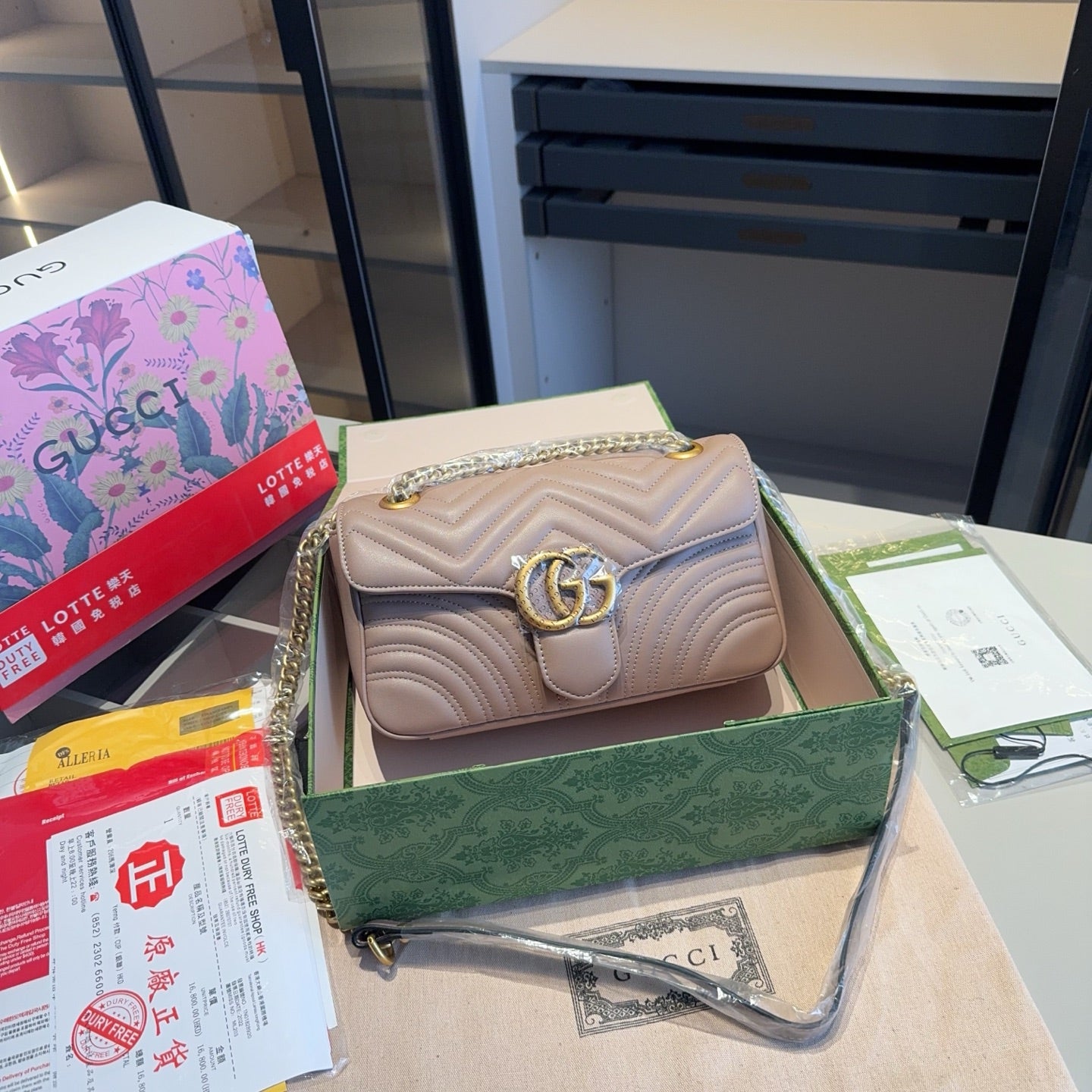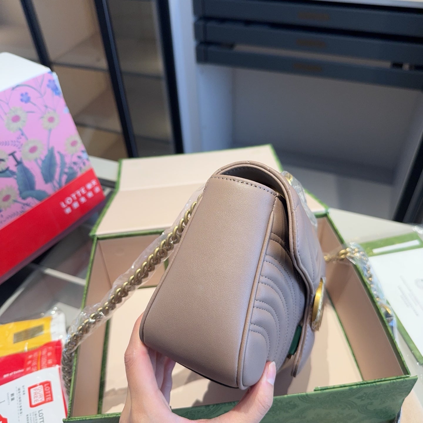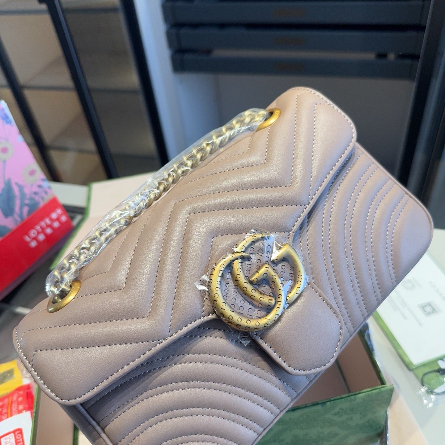 Introducing our Premium Cowhide Leather Marmont Wave Chain Bag in an elegant milk tea color. This beautiful bag is a top-tier replica of the sought-after Gucci Marmont design, favored by celebrities and fashion enthusiasts alike.