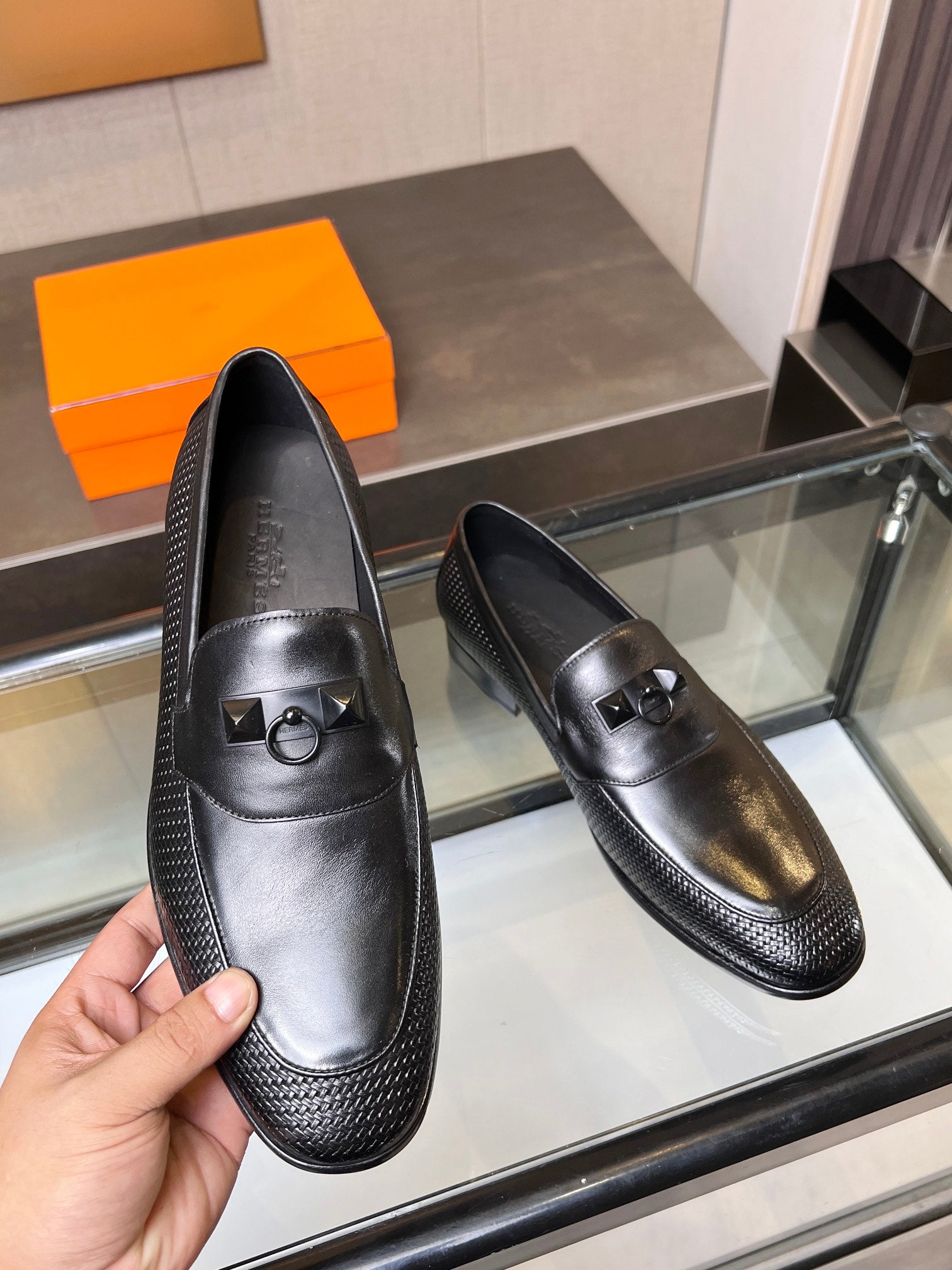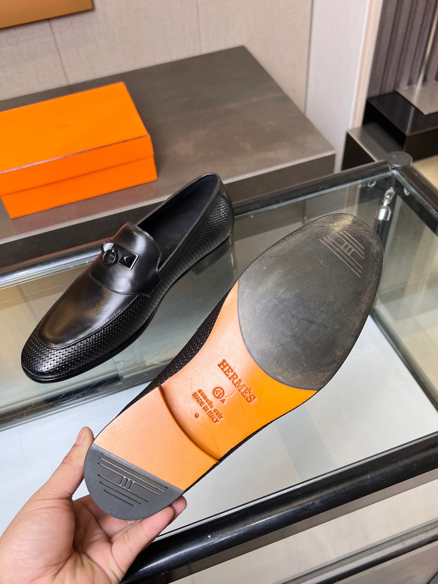 Elevate your footwear collection with our Premium Hermes Men's Shoes. Crafted with a luxurious open-edge bead and cowhide upper, these shoes offer an exquisite blend of style and comfort. The water-dyed cowhide lining ensures a soft fit, while the genuine leather outsole provides durability and traction. Available in sizes 39-44, with custom sizing (38.45) available upon request (please note that custom sizes are non-returnable and non-exchangeable). Enjoy immediate shipping with our ready stock. Step up your style with Hermes today!