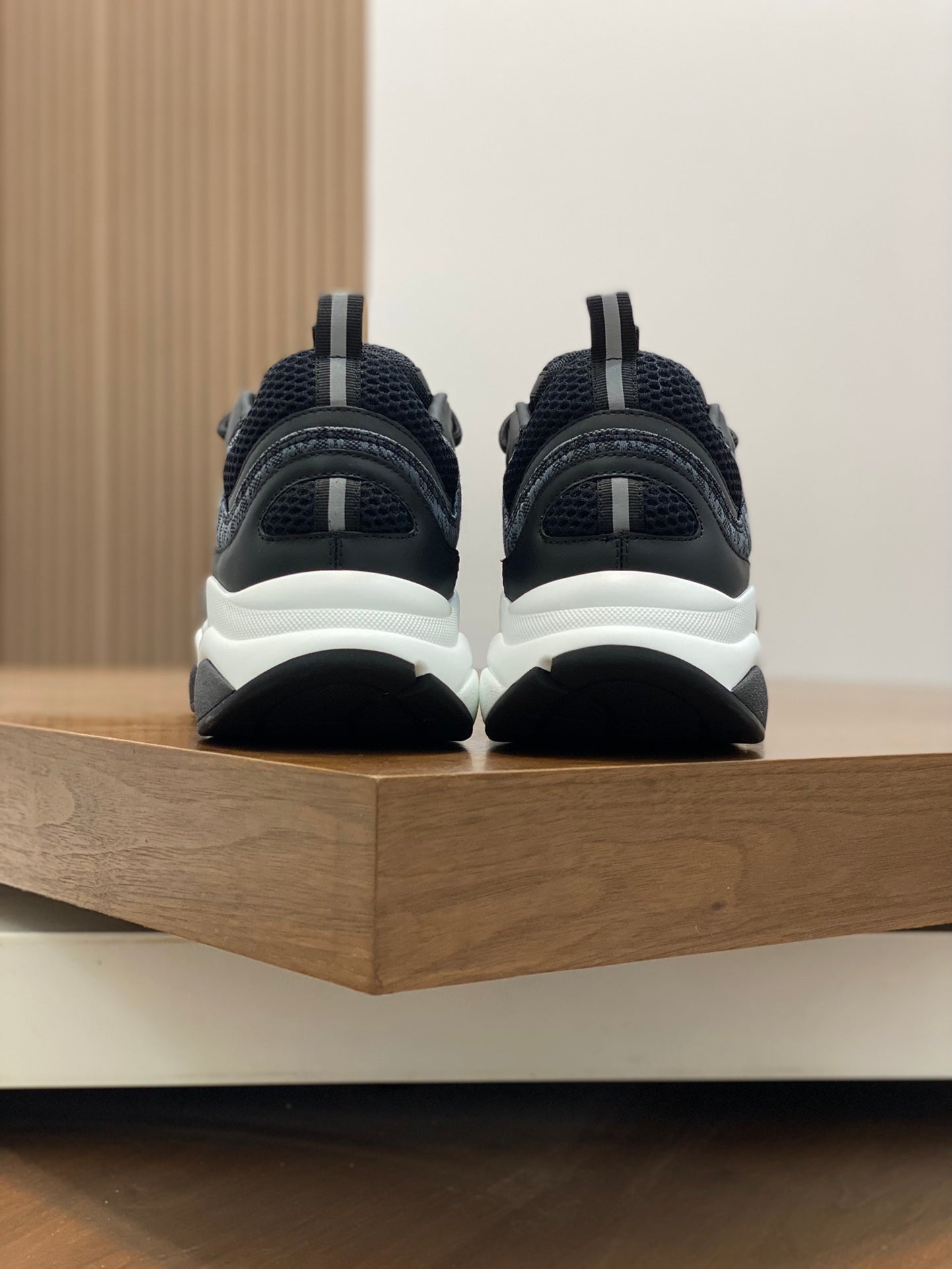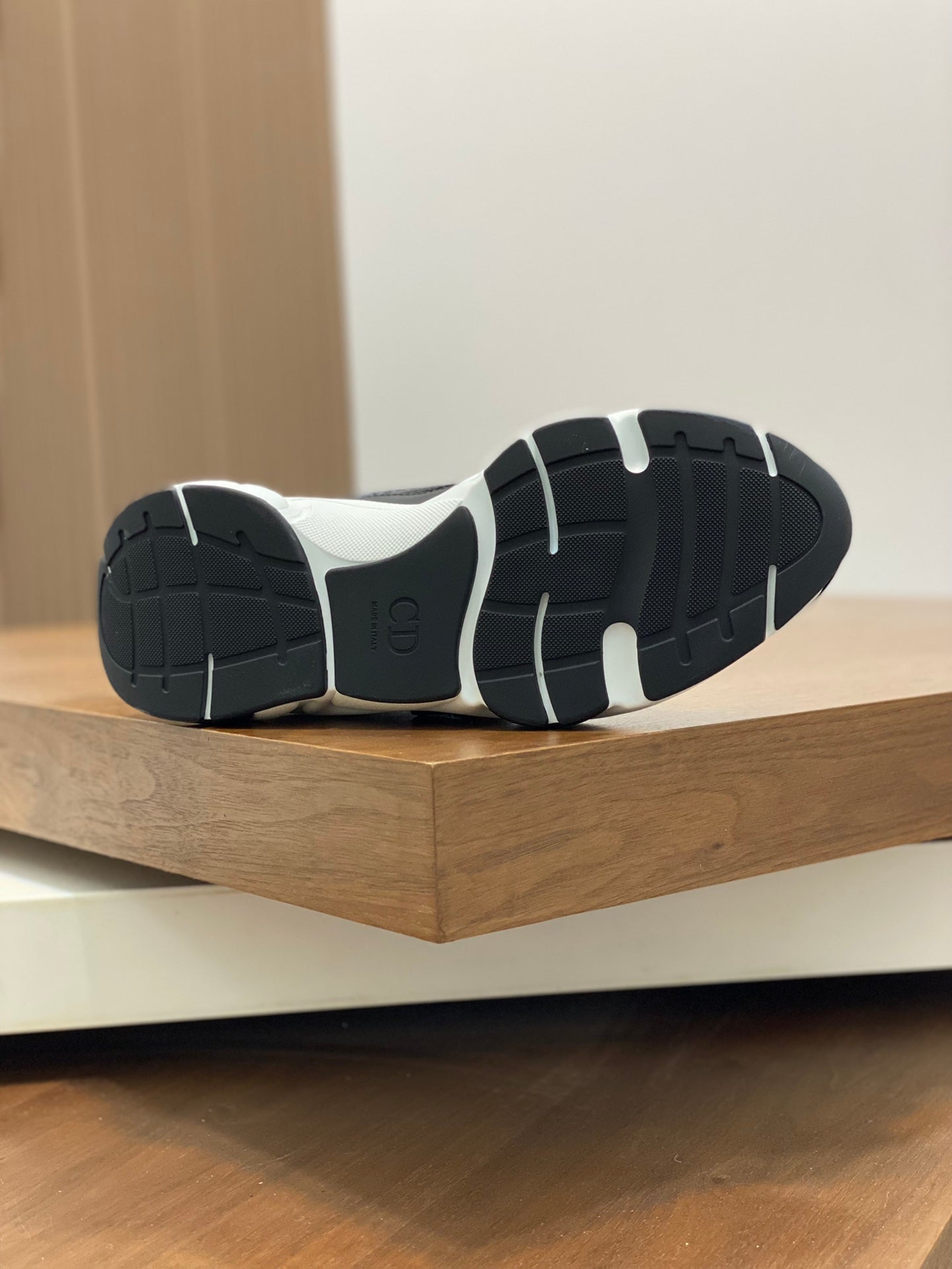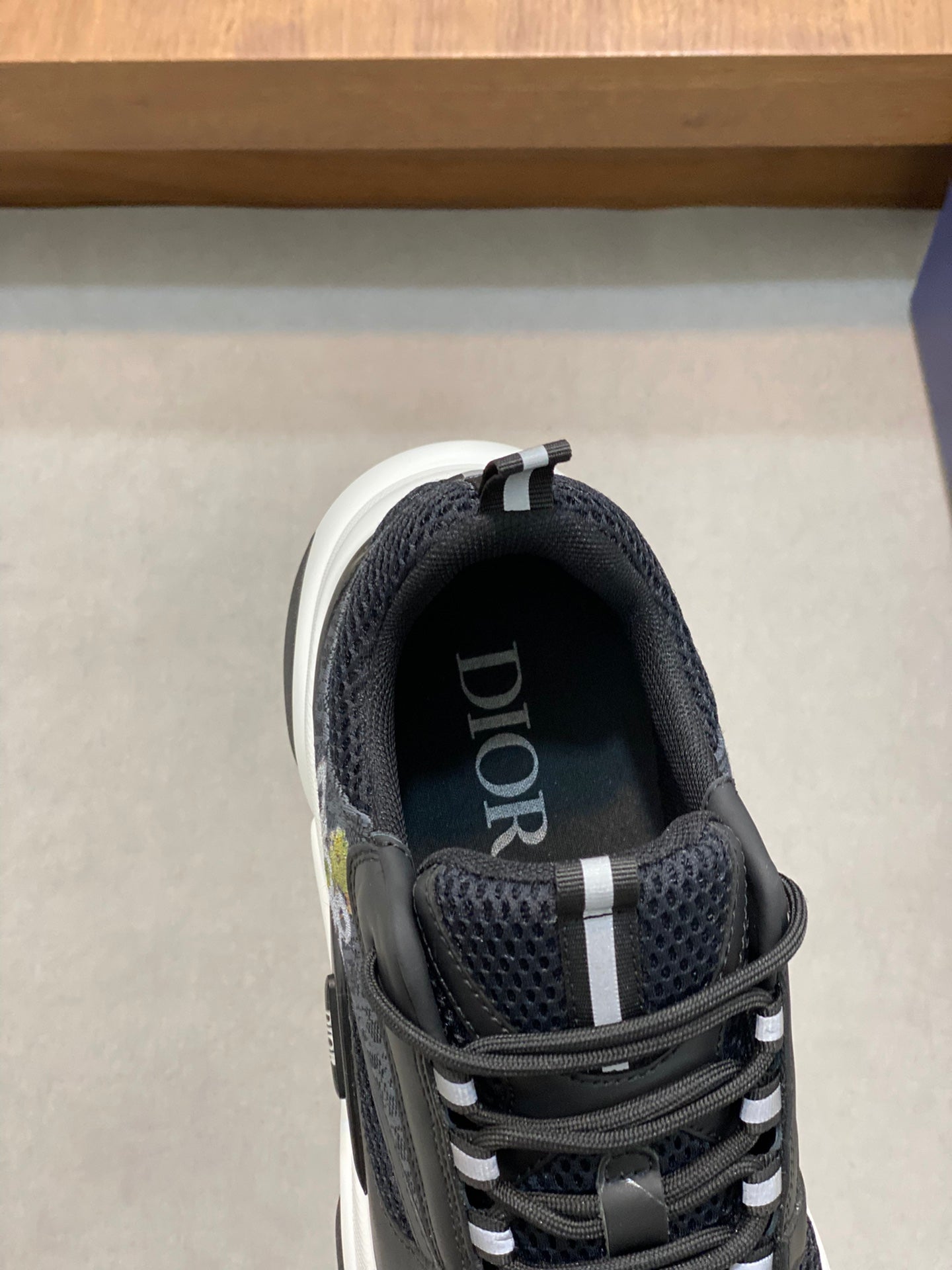 The shoes are completed with a stylish black and white engraved rubber sole, adding a modern twist to a classic design. The black mesh tongue and heel counters, paired with matching black laces, offer a cohesive look, while the embossed "Di~r" logo provides a touch of sophistication.