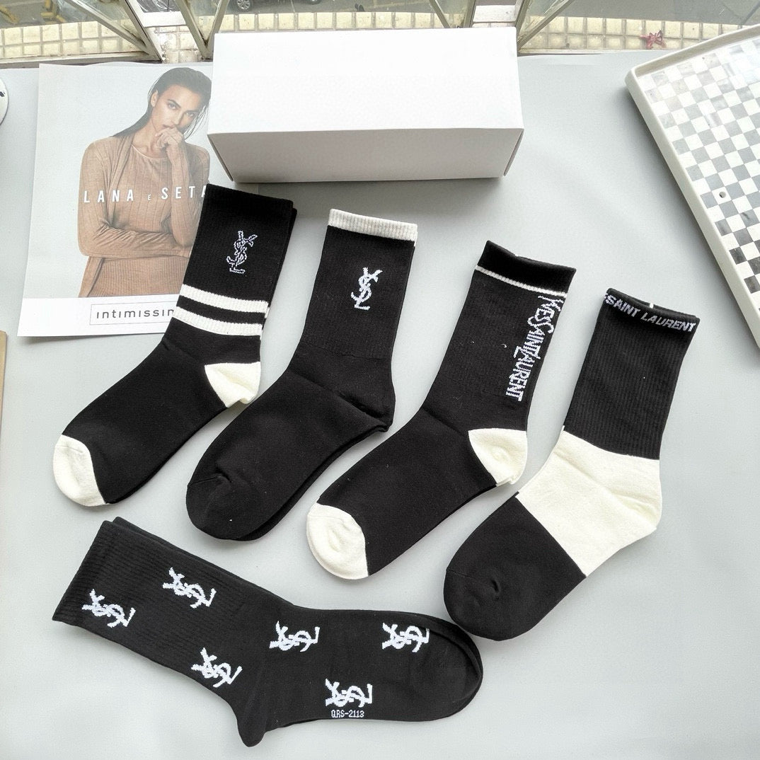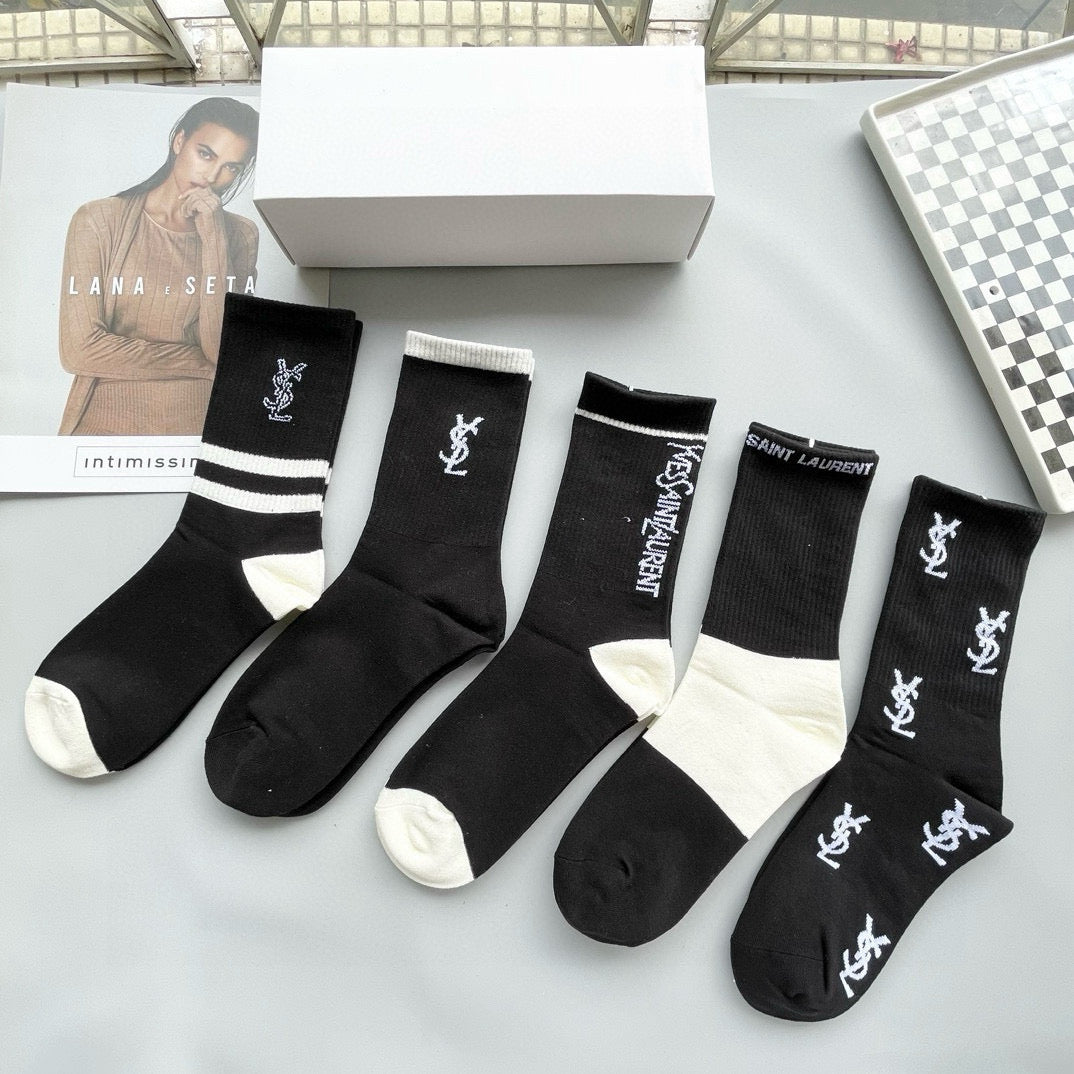 Elevate your sock collection with the Saint Laurent High-Top Fashion Socks, featuring five stylish pairs in one box. These must-have socks are perfect for fashion enthusiasts, combining comfort and chic design. Made with high-quality materials, they offer a fashionable addition to your wardrobe that can be effortlessly styled with any outfit. Embrace the trend that's taken both European and American fashion scenes by storm—these socks are highly recommended for those looking to make a statement. Don't miss out on this essential accessory!