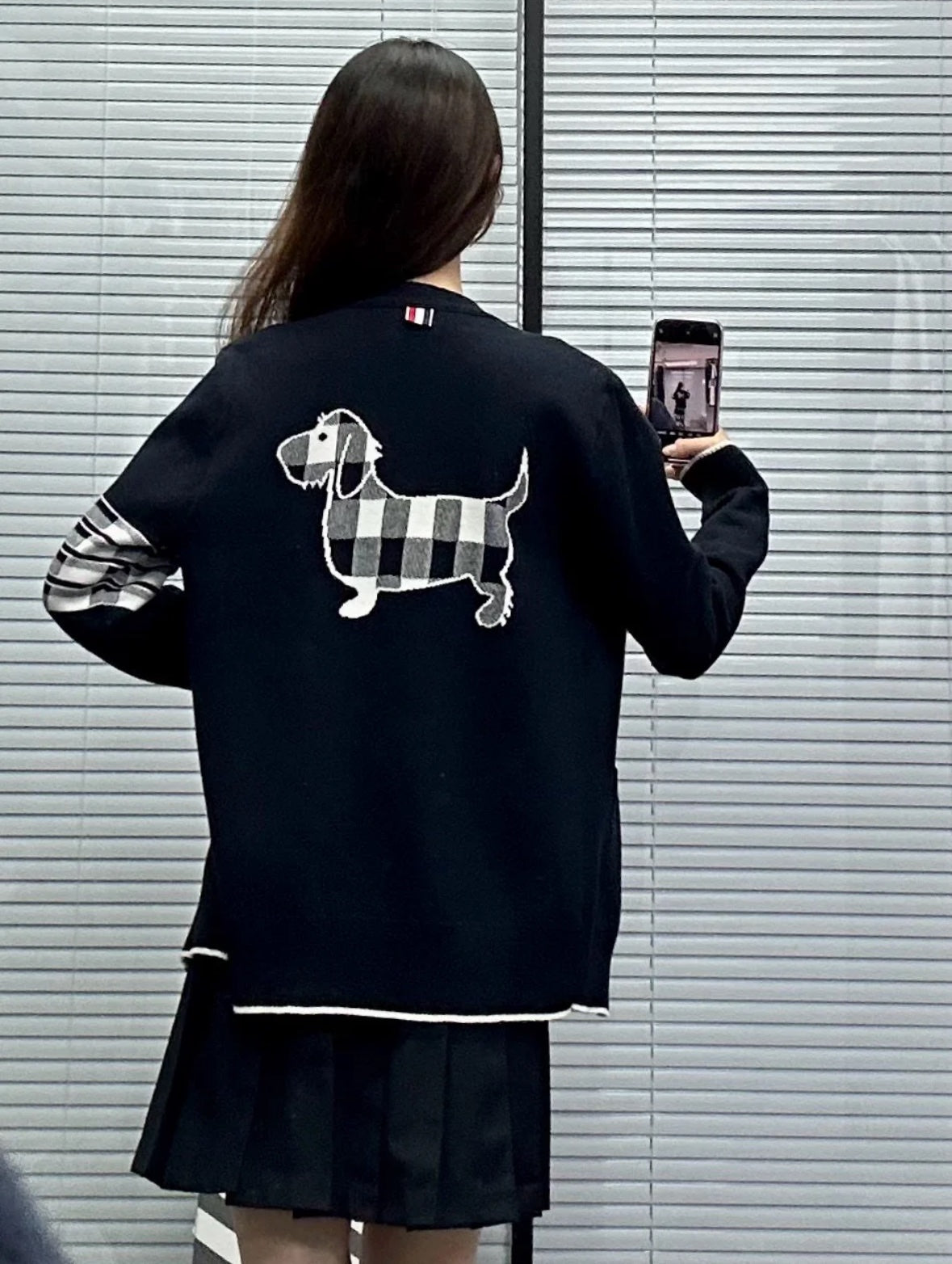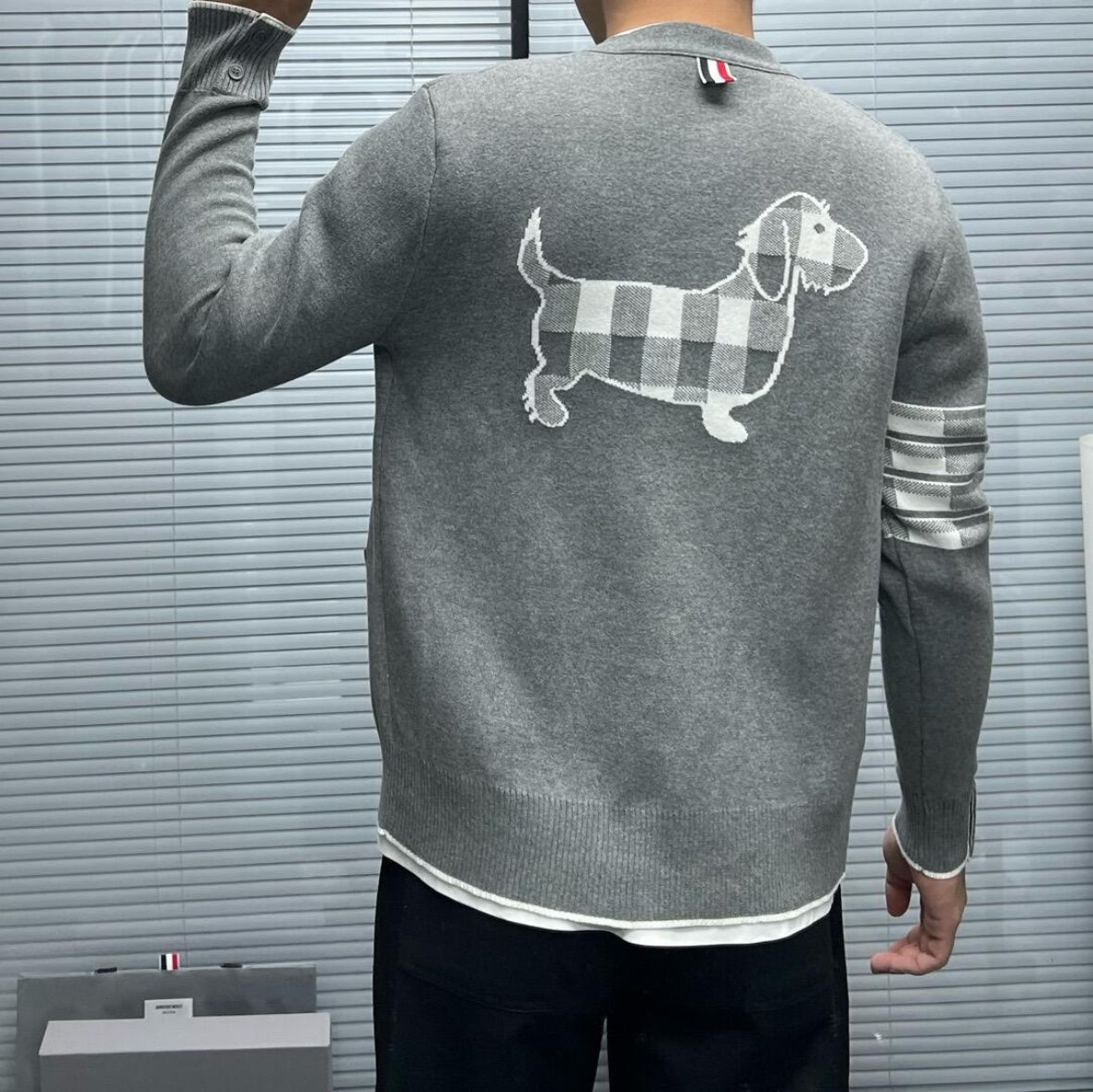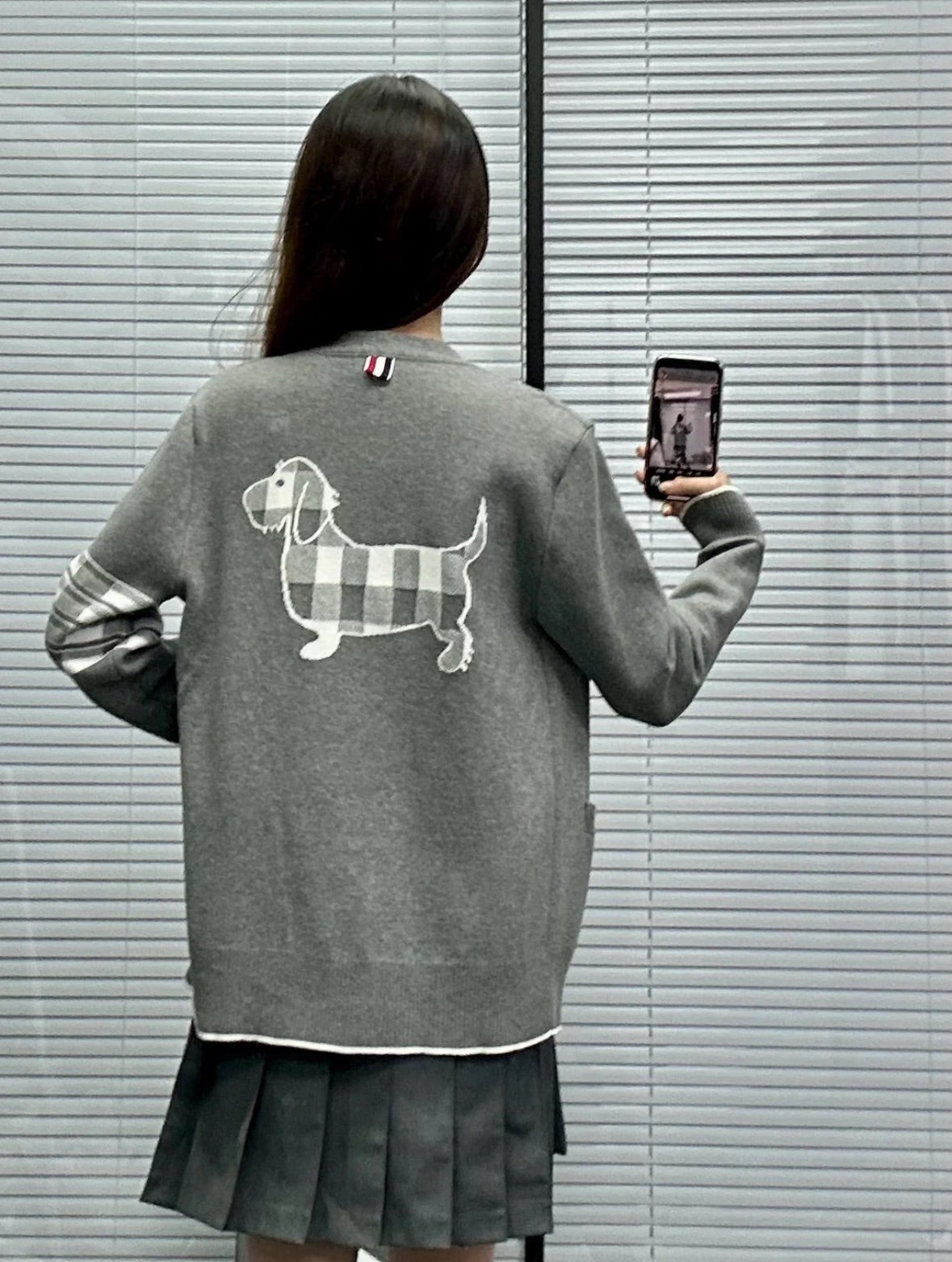 Elevate your wardrobe with the Thom Browne TB M19 Contrast Striped Cardigan Sweater, a timeless piece crafted from a luxurious wool blend. This five-button cardigan features a distinctive back puppy pattern with stylish striped sleeves in white and gray, offering a unique twist on classic design.
