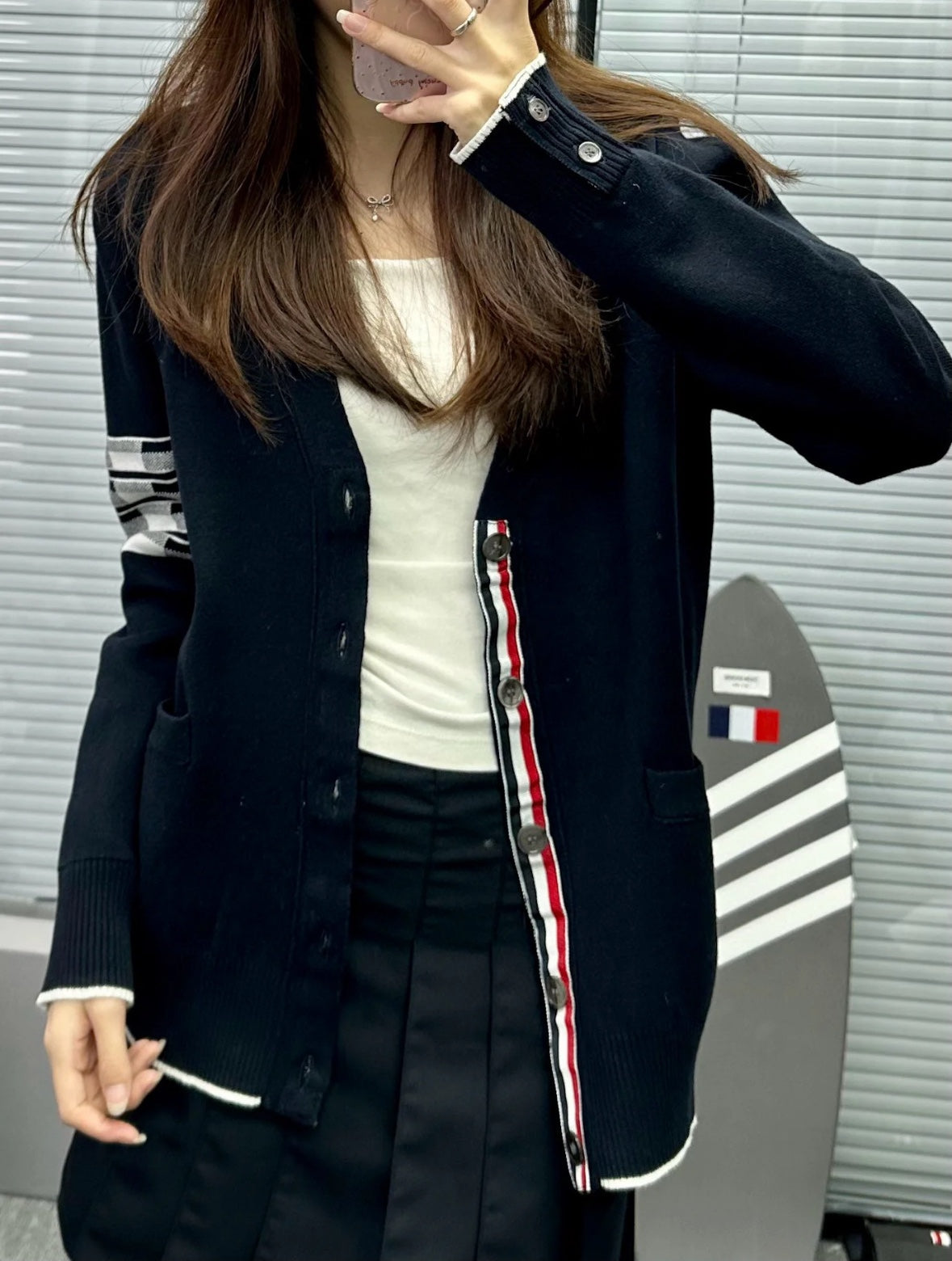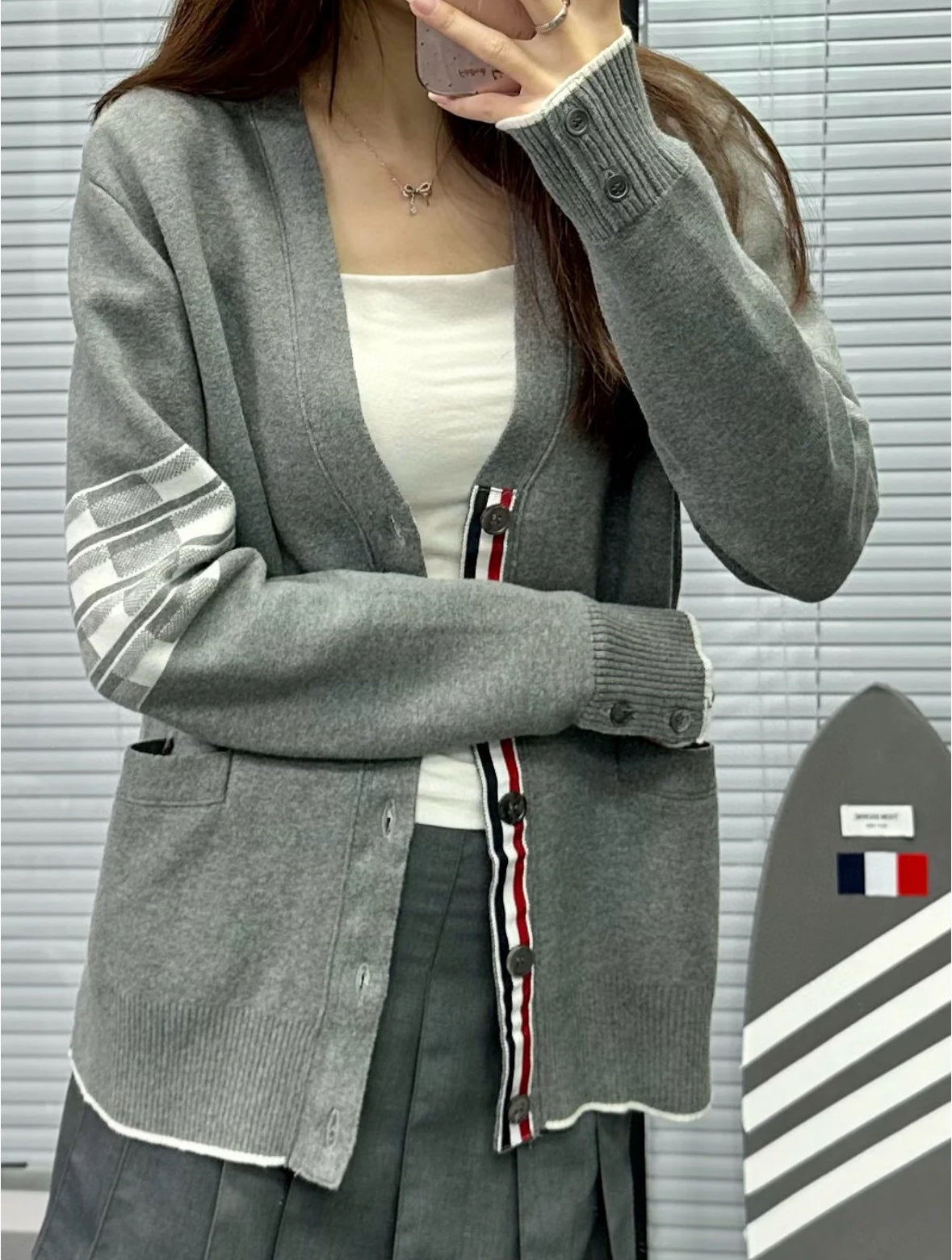 With versatile styling options, this cardigan can be worn in a slim or loose fit, making it suitable for both men and women. The four-stripe design on the sleeves adds a bold touch, and the natural shell buttons enhance the premium quality of this piece.