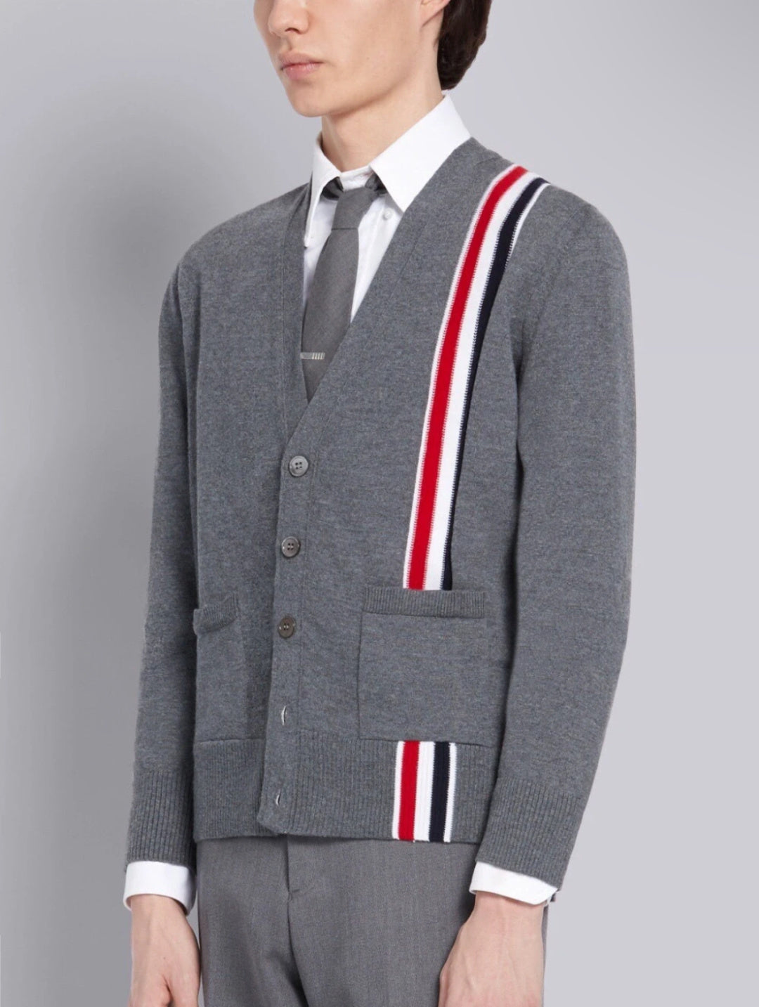 Elevate your wardrobe with the Thom Browne TB M36 V-Neck Cardigan, featuring a striking red, white, and blue design. This elegant five-button sweater is crafted from a soft wool blend, ensuring comfort and warmth for any occasion.